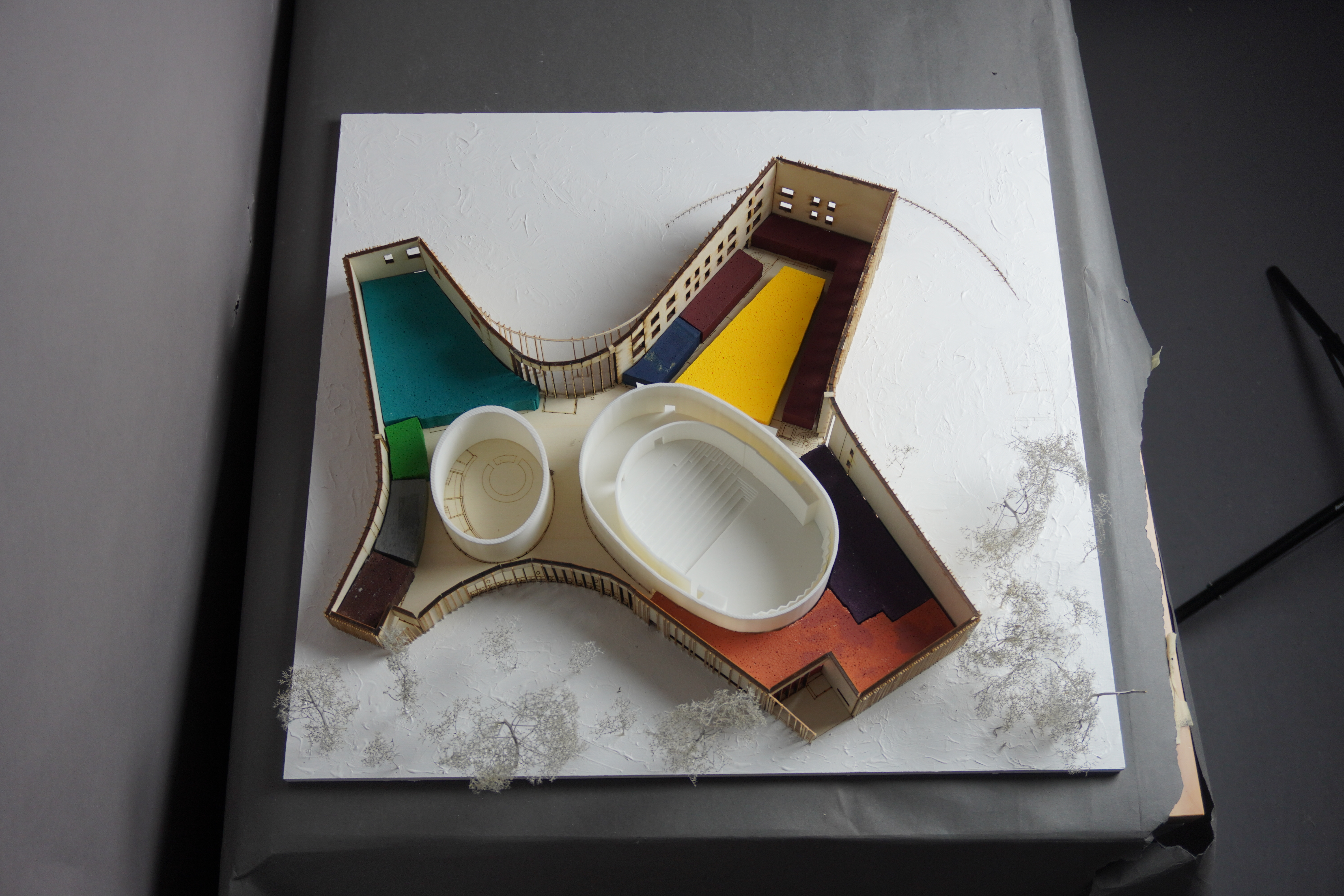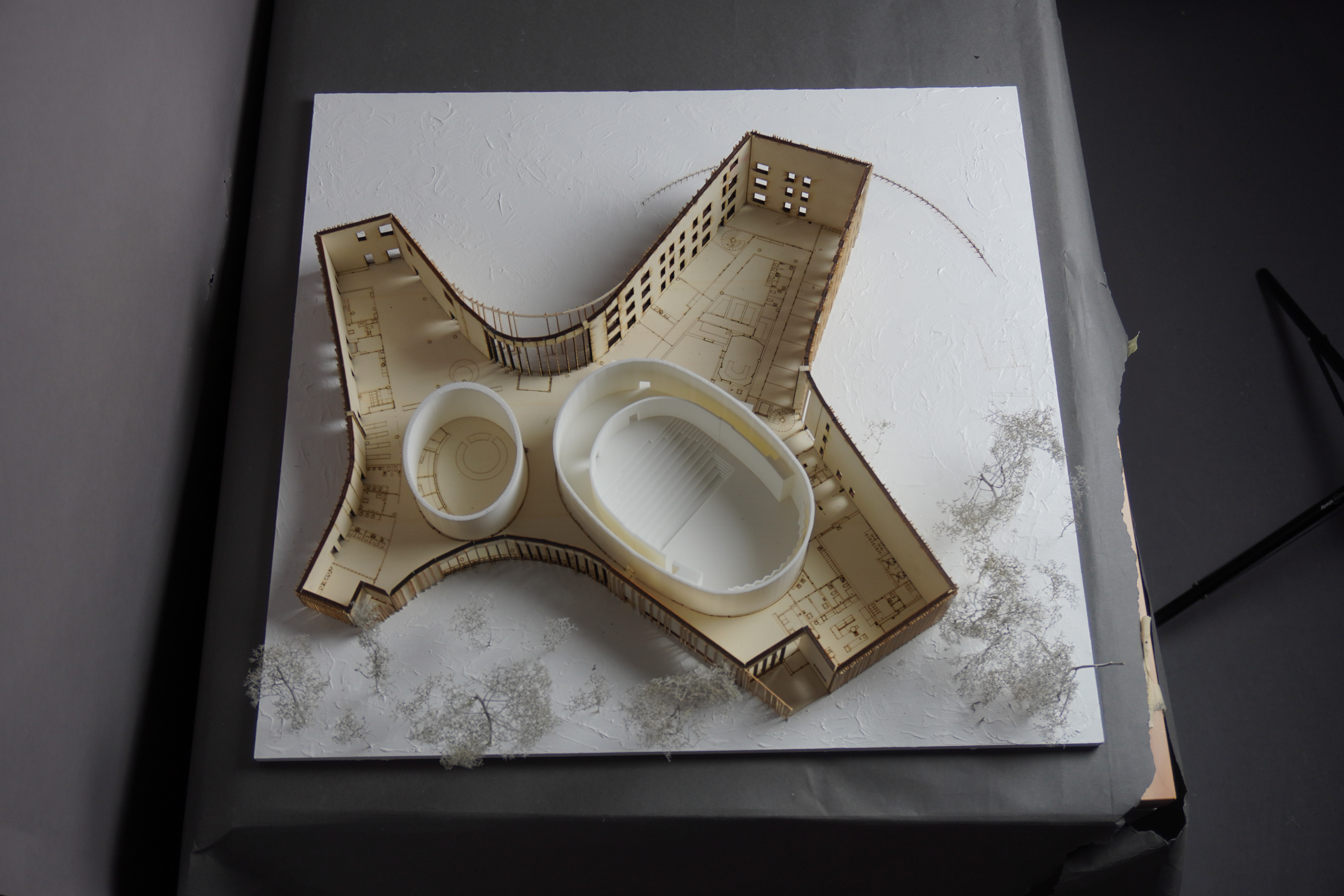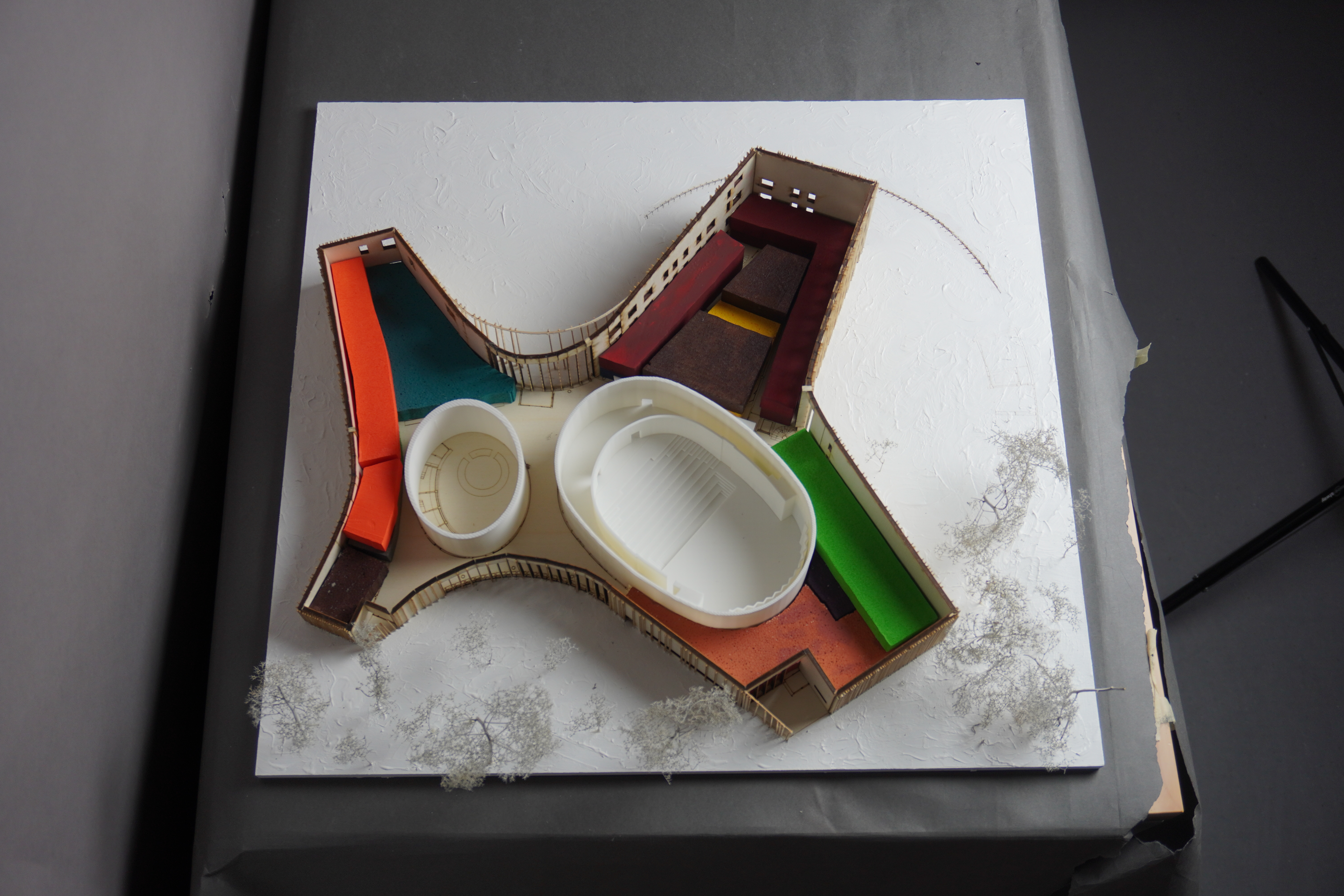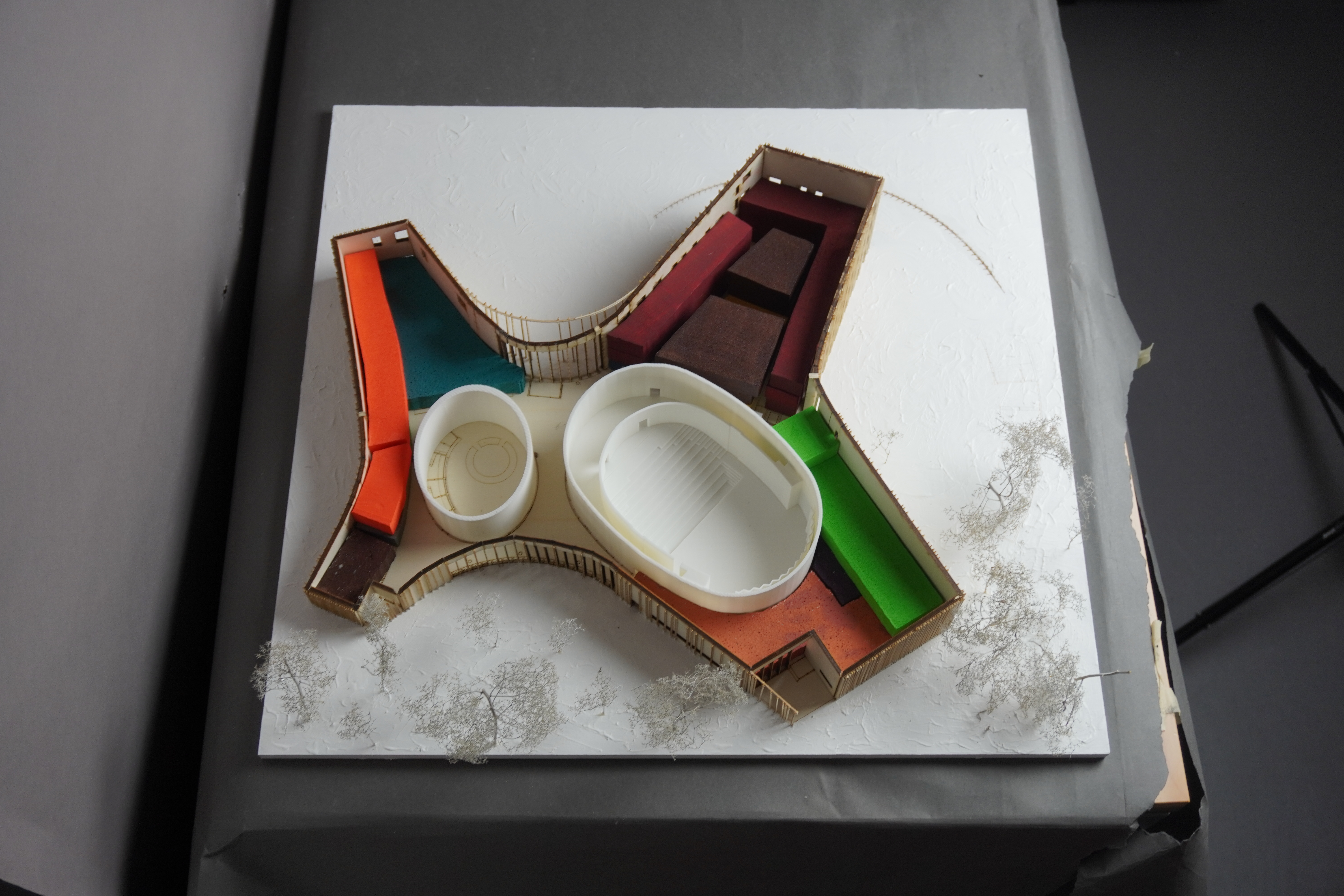 3D-printed plastic, cardboard, heavy-weight paper, model railroad trees, plywood, styrofoam