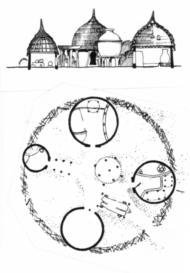 Massa är ett jordbruks- och herdefolk på bushstäppen i norra Kamerun. Gårdar av varierande storlek ligger spridda i området. De är byggda av hyddor, som placeras kring en gård och mellan hyddorna byggs stängsel av ris. Hyddornas väggar formas liksom krukor av oarmerad lera, som läggs i horisontella skikt, som tunnas av upptill. Utsidan är prydd med goemetriska mönster och insidan är glacerad. På väggarna sätts taket, som man byggt på marken. Först flätas ett innertak av hirshalm. Runt det knyts kransar av halm, som ger stadga och skapar ett isolerande luftskikt. Sist täcks taket av ett tjockt lager halm. Jämför med modell 20.