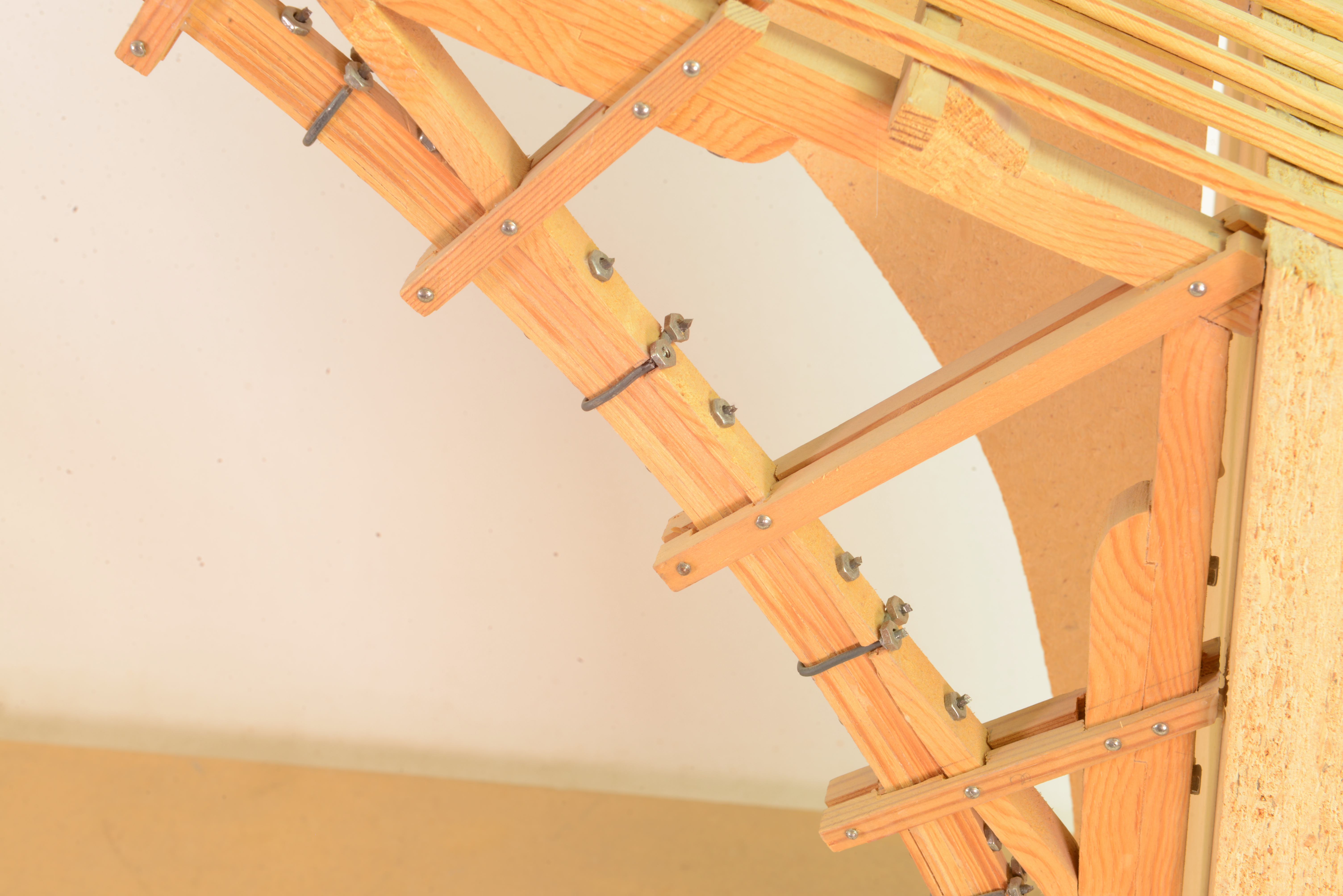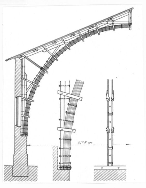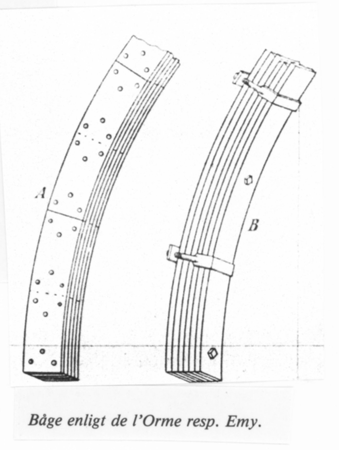 År 1819 gjorde den franske ingenjören Emy ett förslag till utveckling av de l'Ormes träbågar (se modell 152). De l'Orme hade fogat ihop bågar av kantställda plankbitar. Emy böjde flera plankor vågrätt över varandra, förbundna med järnband igenom och runt om. Det var lättare att böja plankorna och det blev möjligt att använda mycket längre stycken än tidigare. Bågarna kom att användas framför allt i stora hallbyggnader. Vad som möjliggjorde Emys teknik var de nya ångsågarna, med vilka man noggrant kunde såga långa plankor.