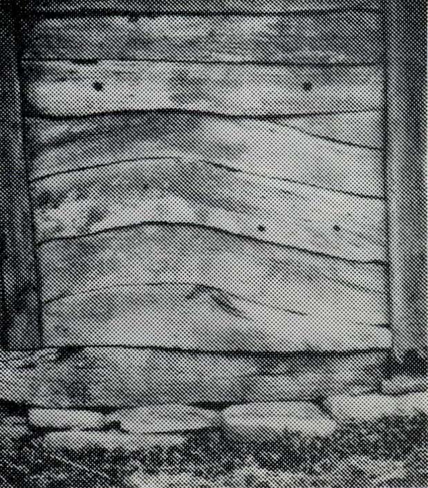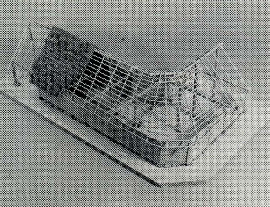 Modellen visar en del av de nu rivna uthuslängorna på gården Hallen. Byggnaden är av traditionell halländsk typ med karakteristiskt rundade hörn och är byggd i skiftesteknik med mesulaburet, halmtäckt tak. På syllen står stolpar, som griper om syll och hammarband (bandträ) med ¨klor¨¨. Väggarna stadgas av tvärband och av strävor mellan stolpar och syll. Stolparna är försedda med lodräta skåror (kloning), som håller de liggande skiftesplankorna på plats. I lador, som här, fick plankorna ligga löst och kunde också lyftas bort vid behov. Kort och krokigt lövträ kunde utnyttjas effektivt. I regel används ek till stomme och skiften i utsatt läge. Takåsen bärs upp av klykförsedda stolpar mitt i huset (mesulor). På åsen hänger sparrar, som vilar på bandträt. Tvärs över sparrarna är läkt fastnaglade. Taket är täckt med råghalm, som hålls på plats av träkäppar, fastbundna vid läkten med mjuka björkvidjor (kvist). Över ryggåsen ligger lös halm, som hålls fast av saxar (poll), genom vilka käppar (pollspett) löper.