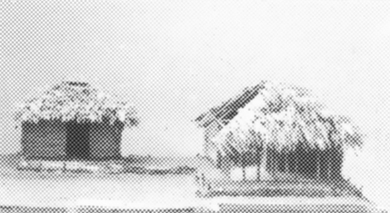 Modellerna visar en del av byn Makouango vid Kongofloden. Männen i byn är fiskare och kvinnorna ansvarar för barn, husdjur, maniokodling och keramiktillverkning.Flodens vattennivå varierar under året upp till fem meter med en översvämningsperiod i december. Husen byggs på områden över högvattennivån. Modellerna visar hus, som byggts på små utfyllda terrasser. Terrasserna är förstärkta med flätade pålverk mot erosion och används under lågvattenperioder att sitta på eller arbeta vid. Vid högvatten utgör de enda markyta. Husen har klinade väggar och tak av palmbladssjok (kunza). Ett av köken har också väggar av kunza, vilket varit brukligt tidigare. Modellernas hyddor befinner sig i olika stadier av uppbyggnad. Köken är inrymda i separata hus. Denna husgrupp bebos av fader med familj samt två söner med familjer, tillsammans 18 personer.