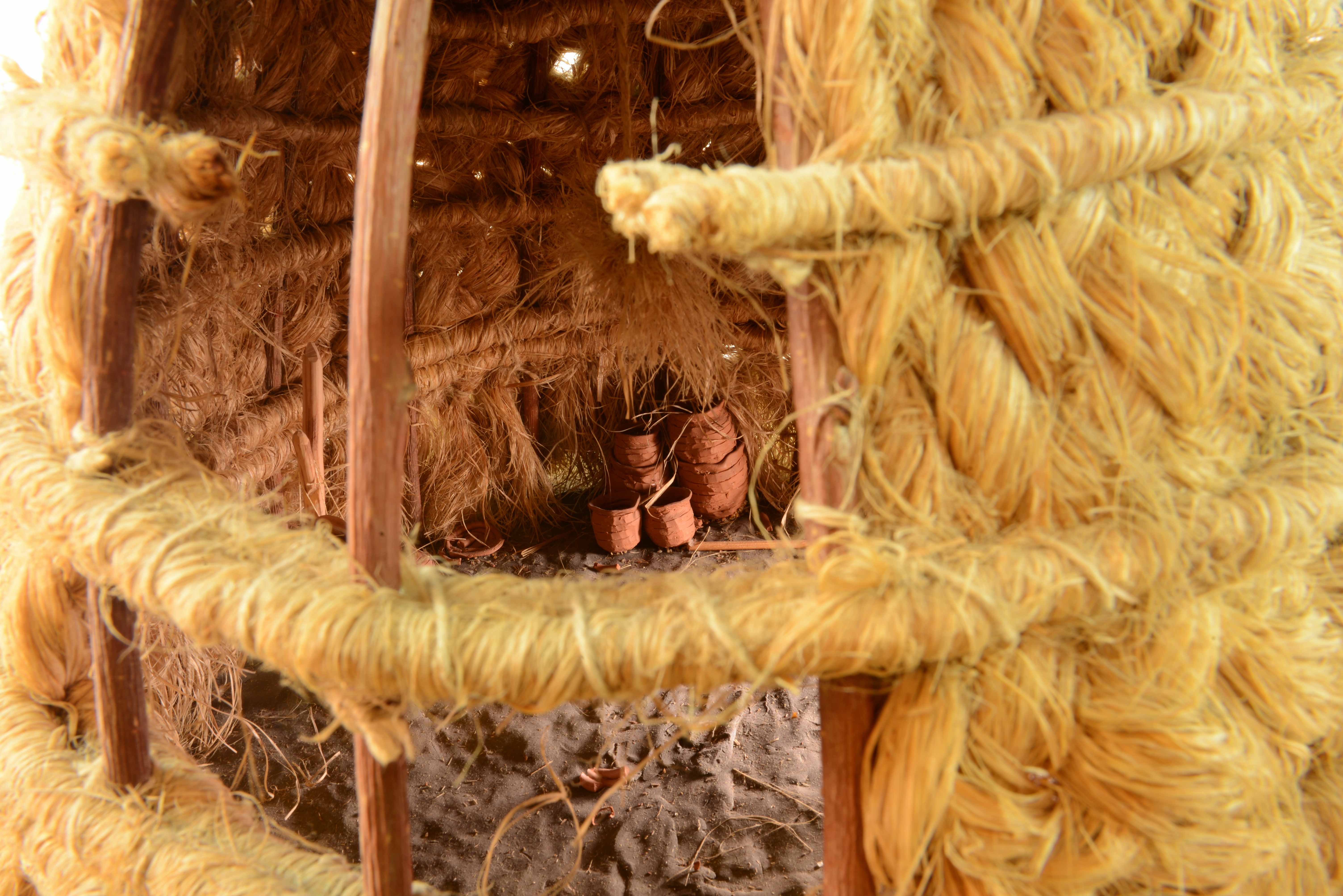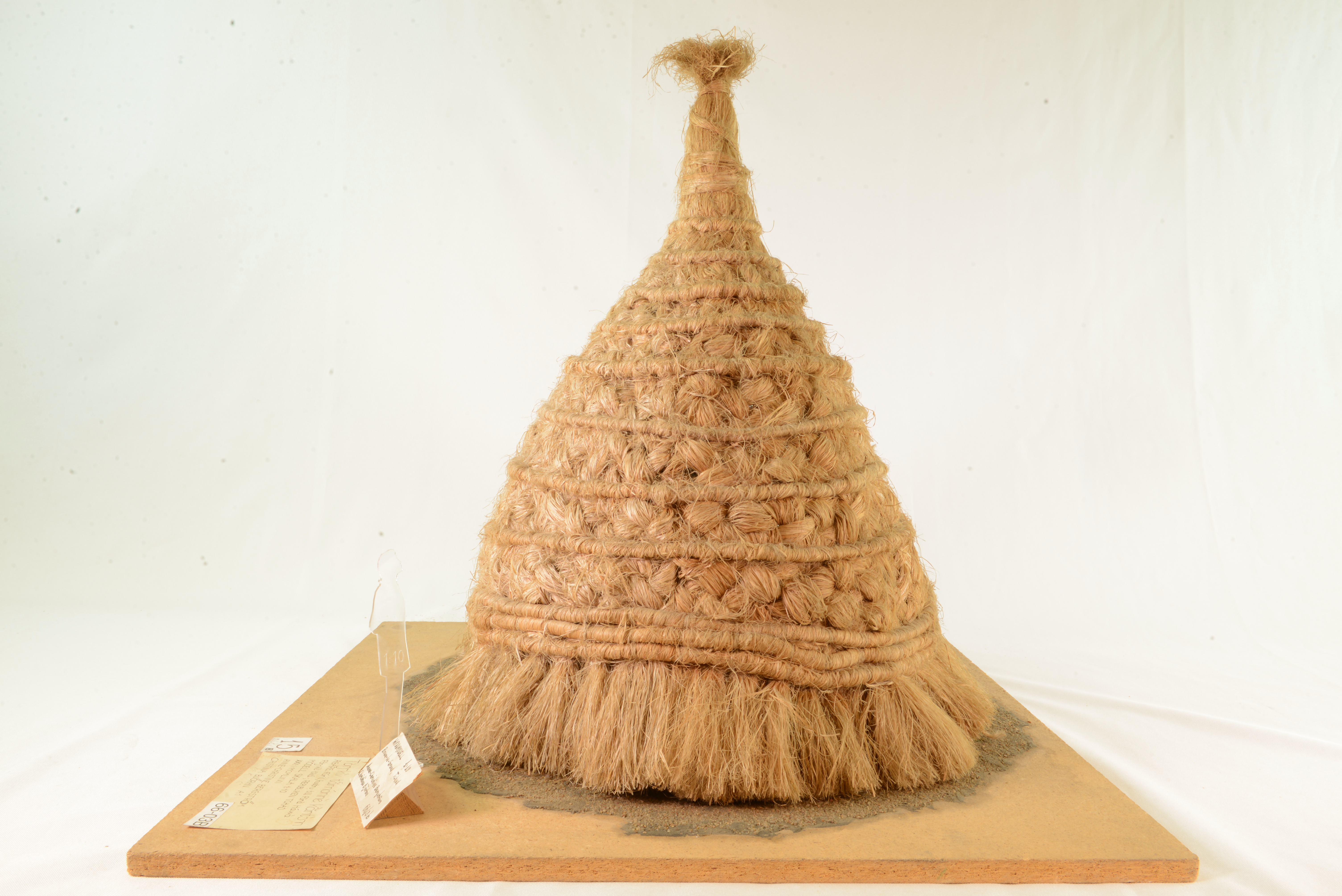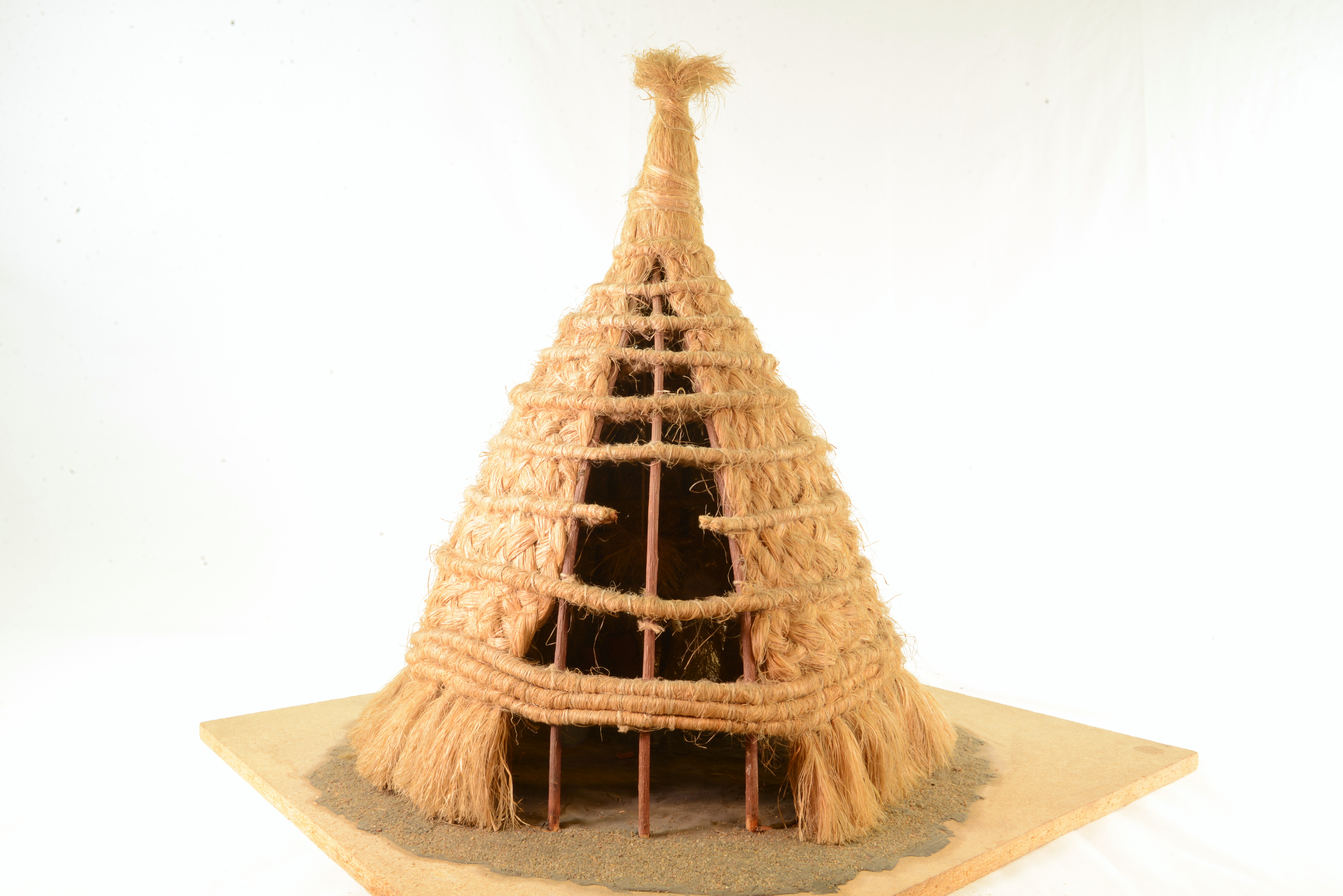 Modellerna visar stommen till en av många hyddtyper i byn Boum-le-Grand. Hyddan är byggd av halm med förstärkningar av träkäppar. Sex triangulära väggstycken av flätad halm binds samman genom att fästas mellan kransar av halm. Samtidigt fästs de förstärkande käpparna. Arbetet utförs av många män, som samtidigt arbetar runt hyddan från både in- och utsida. Väggarna hålls på plats i ett cirkelformat dike. När stommen är färdigbyggd flyttas den till boplatsen och täcks med halm, som läggs i spiral nerifrån och upp. Dörröppningen skärs upp.