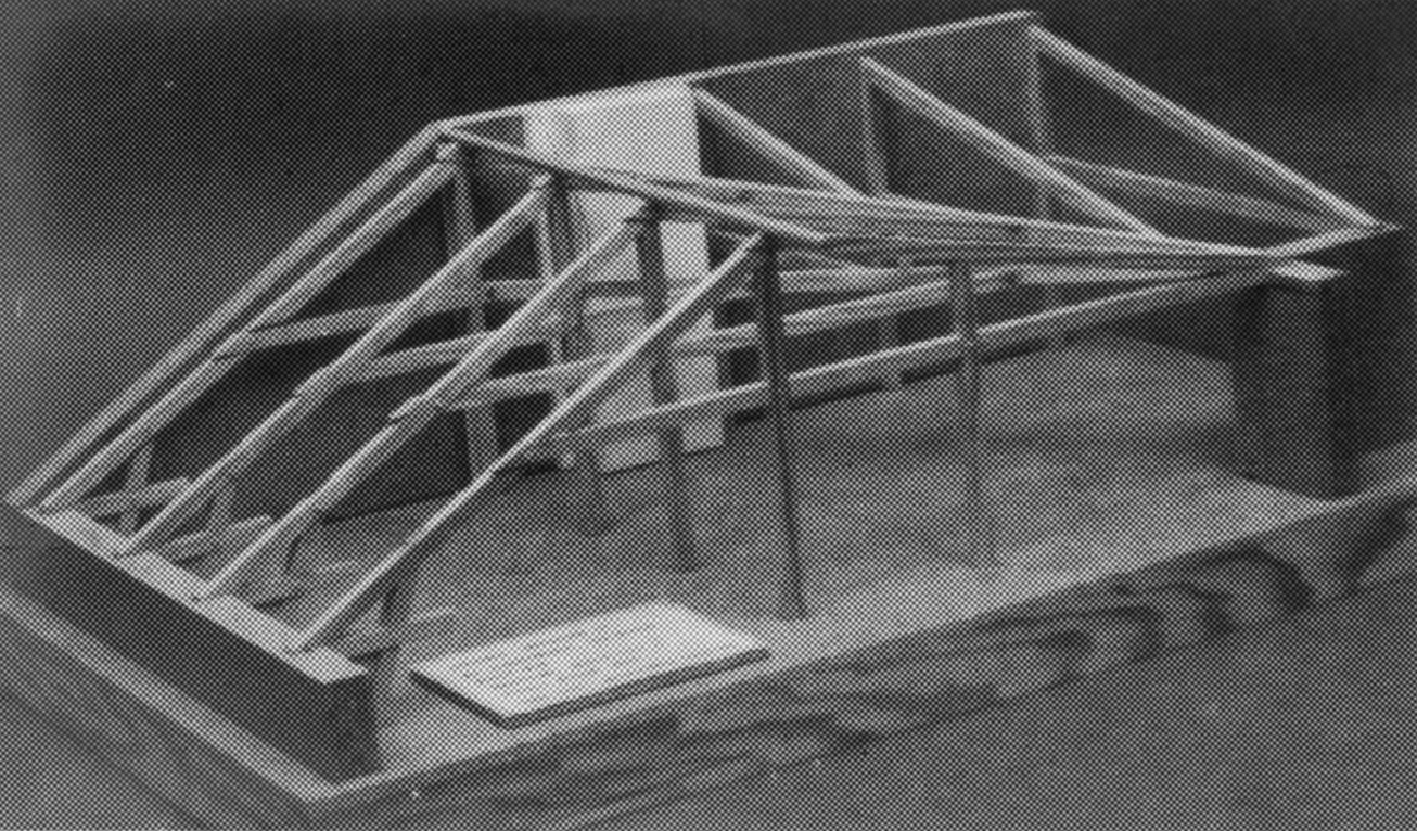 Modellen visar ett utsnitt av taket till stenhuset på Vasagatan 20, byggt 1878. Mot fasaden mot gatan visar den en svensk takstol, vid hjärtmurarna stöds träkonstruktionen av vertikala stolpar.