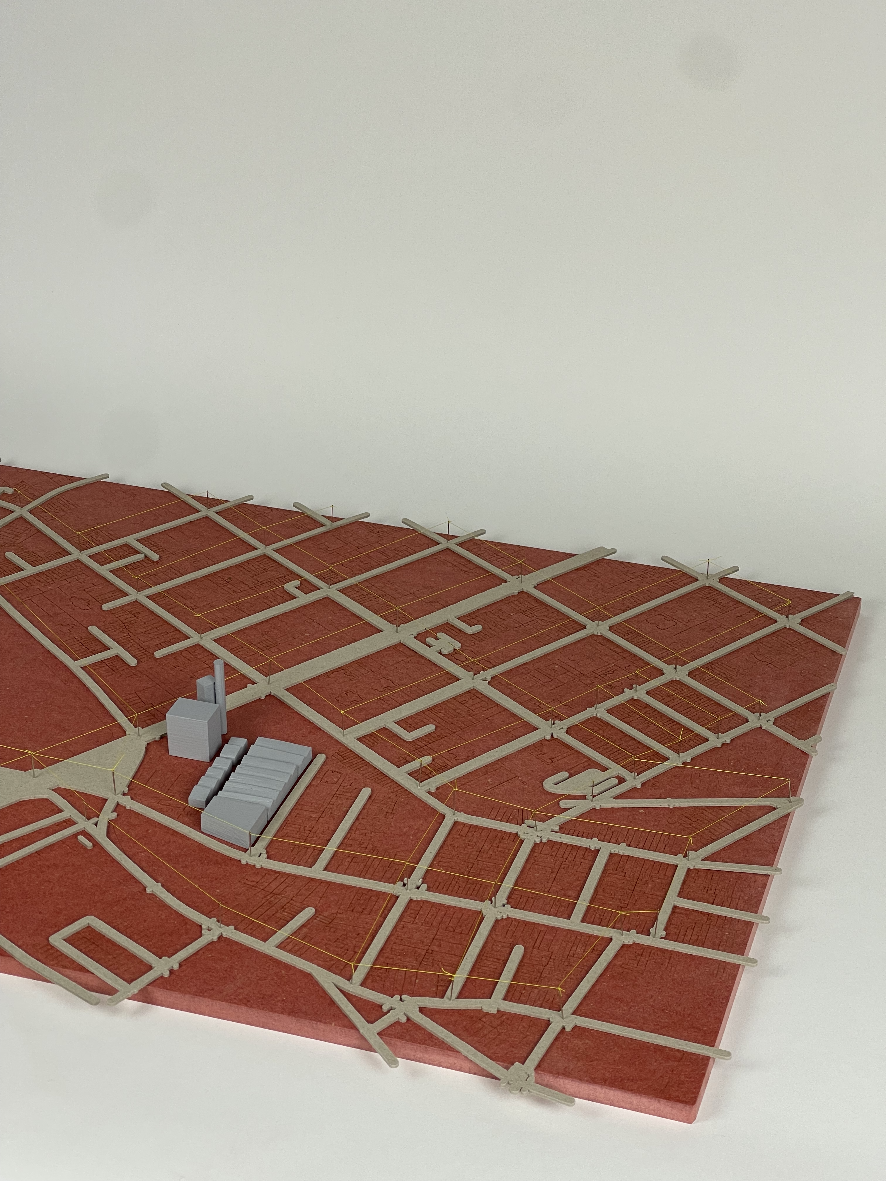 Vi har på röd valchromat med hjälp av laser graverat in en del av São Paulos landskap som omger komplexet SESC Pompeia. Över detta har vi placerat en grå papp, skuren i form av de gator och vägar som finns i området. Vi har dessutom valt att leda en gul sytråd, upphöjd någon centimeter över gatorna, för att ytterligare accentuera vägsträckningen och dess viktiga knutpunkter.