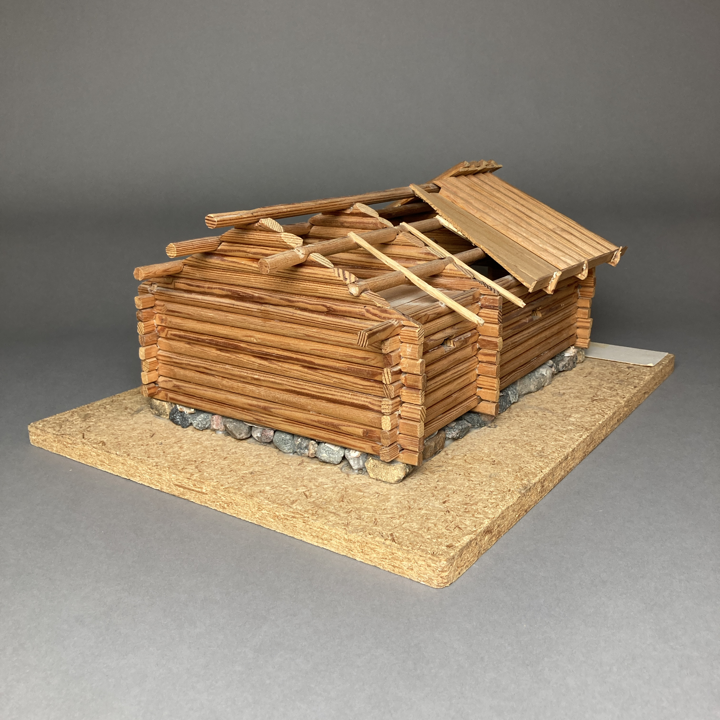 Eldhuset är en ålderdomlig nordisk bostadstyp och har bevarats i byggnader för säsongsbosättning, särskilt i fäbodarna. Modellen visar ett eldhus från Forsbodarna, byggt 1659. Härden mitt i huset omges av stenar och utefter långväggarna löper britsar använda som bord, sittbänkar och liggplatser. Vedtaket vilar inte på ryggås, utan på två närliggande sidoåsar och röken släpps ut genom en springa mellan de två takfallen. Under yttertaken finns två åsar, som bär tvärstänger i vilka kittlar hänger. Dessa åsar är relikter efter ett lägre värmetak. Se modell 33. Ingångsgaveln är försedd med svale. Fönster saknas, i väggarna finns bara små gluggar. Vanligtvis har jordgolvet legat lägre än den omgivande marken och också frontgaveln har varit försedd med brits.