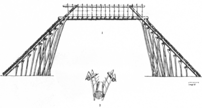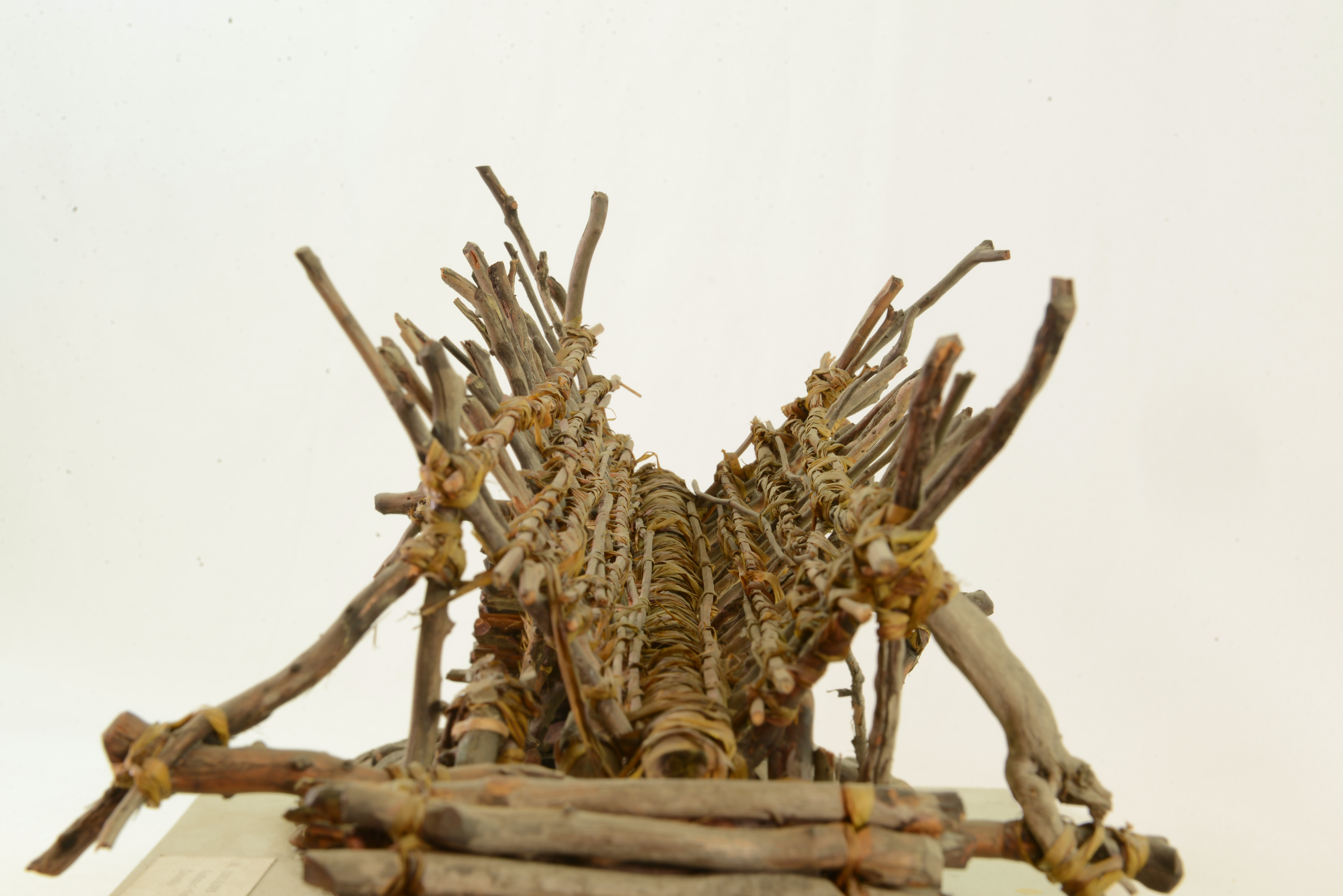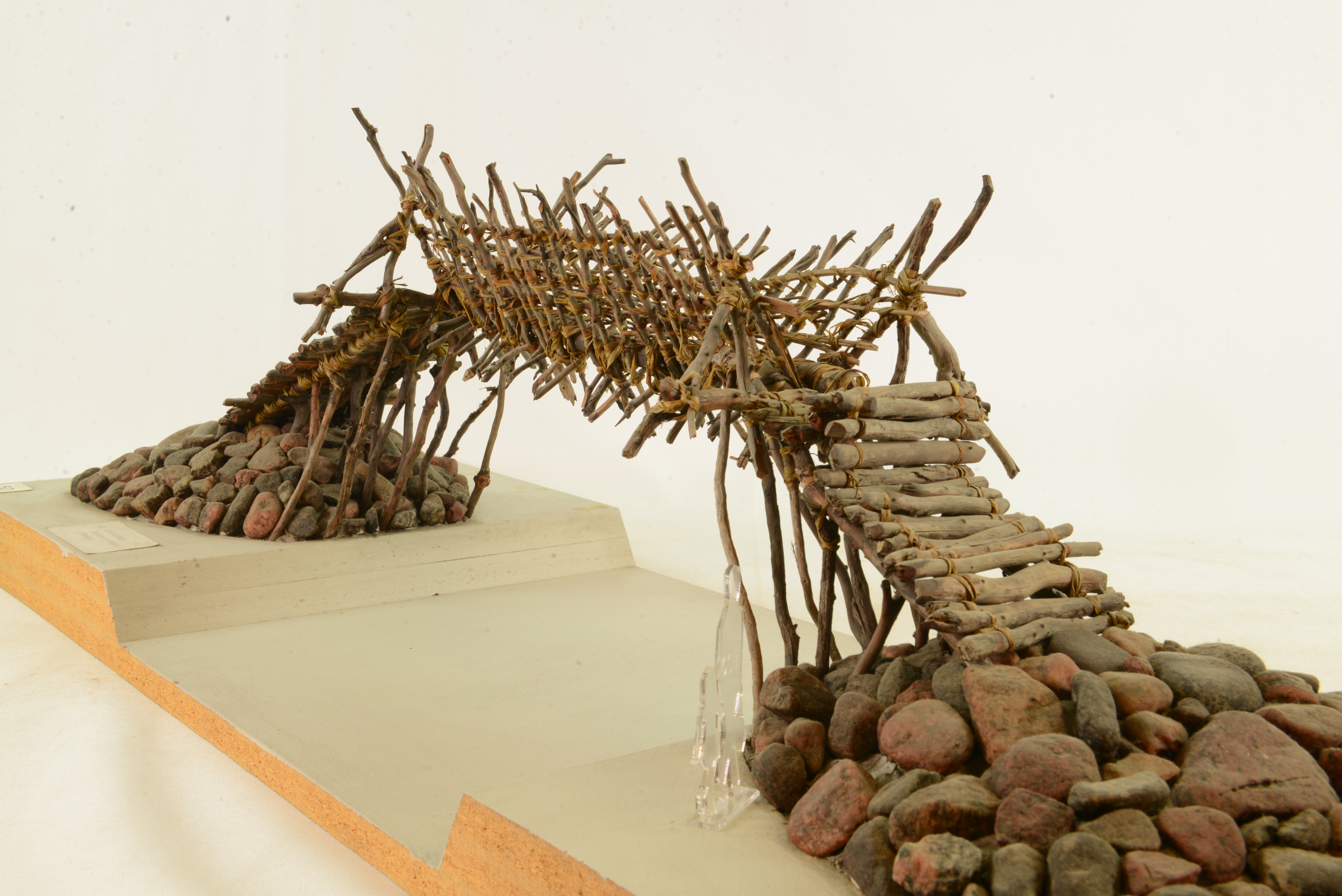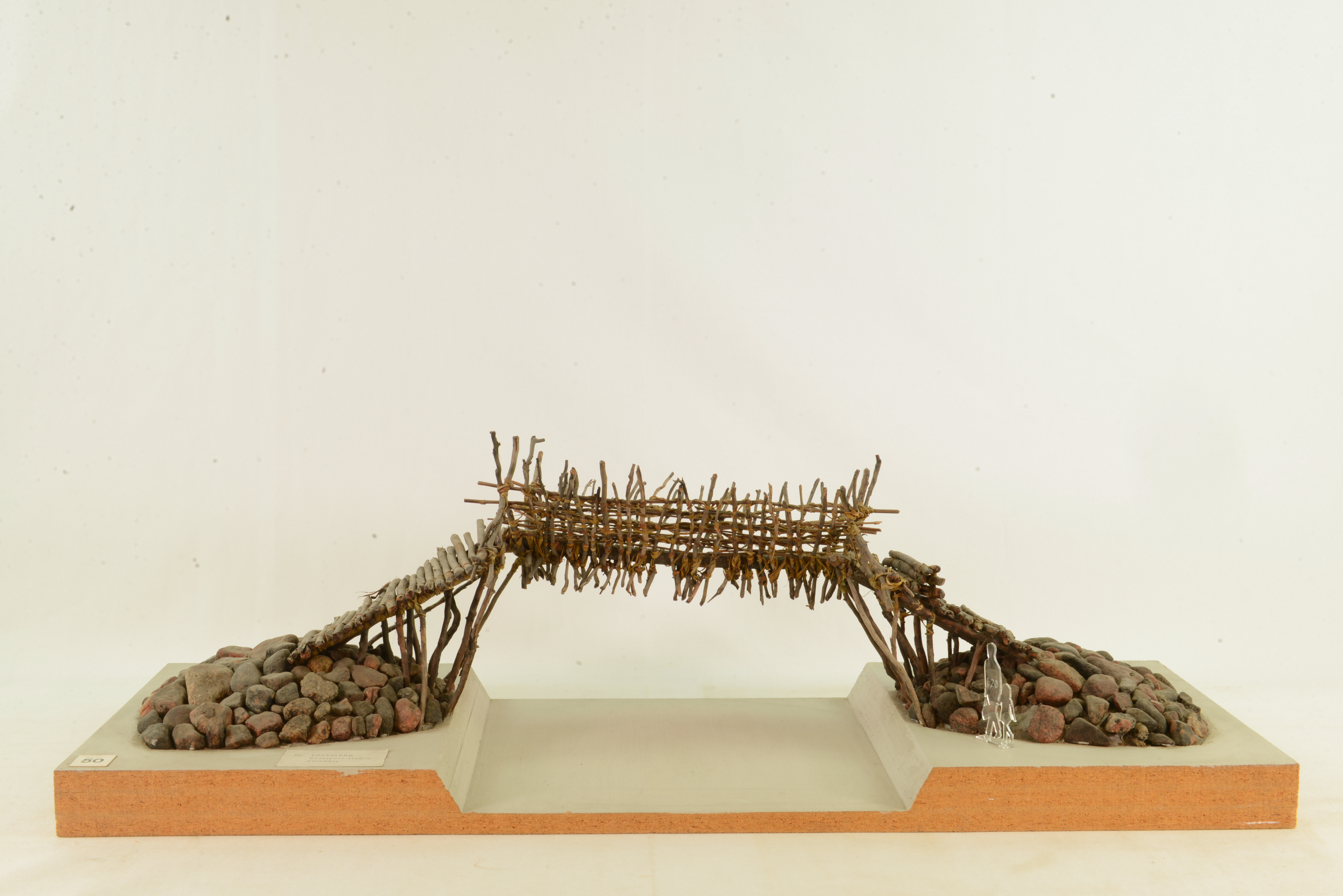 Modellen visar en bro, byggd av Kagabaindianer i Colombias norra bergstrakter i början av 1900-talet. Bron består av tjocka trädstammar. Störar, som stöttas av stenar nedtill, stöder brobanan och trapporna, som leder upp frän sidorna. Allt är sammanbundet med fibrer från slingerväxter och agave.