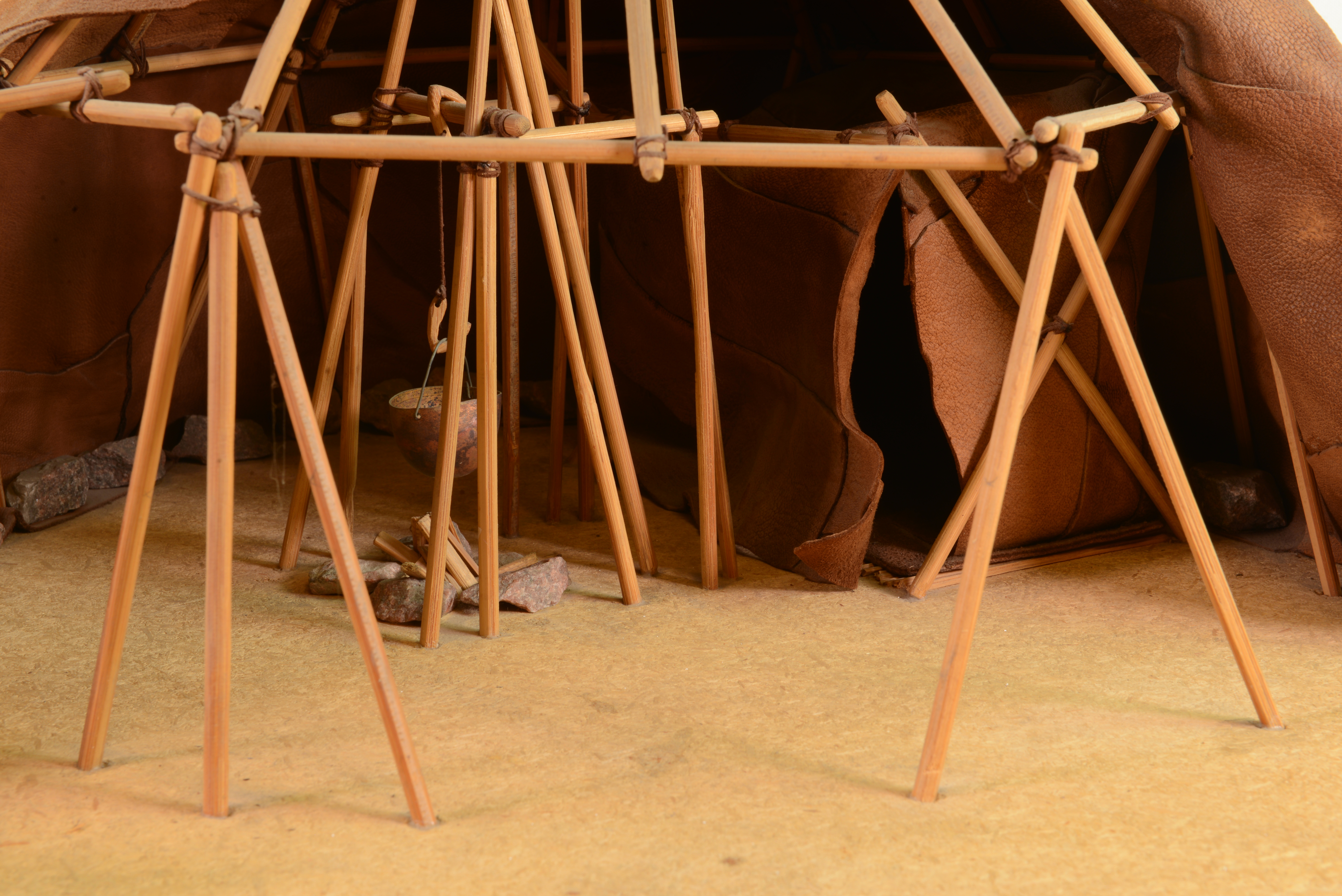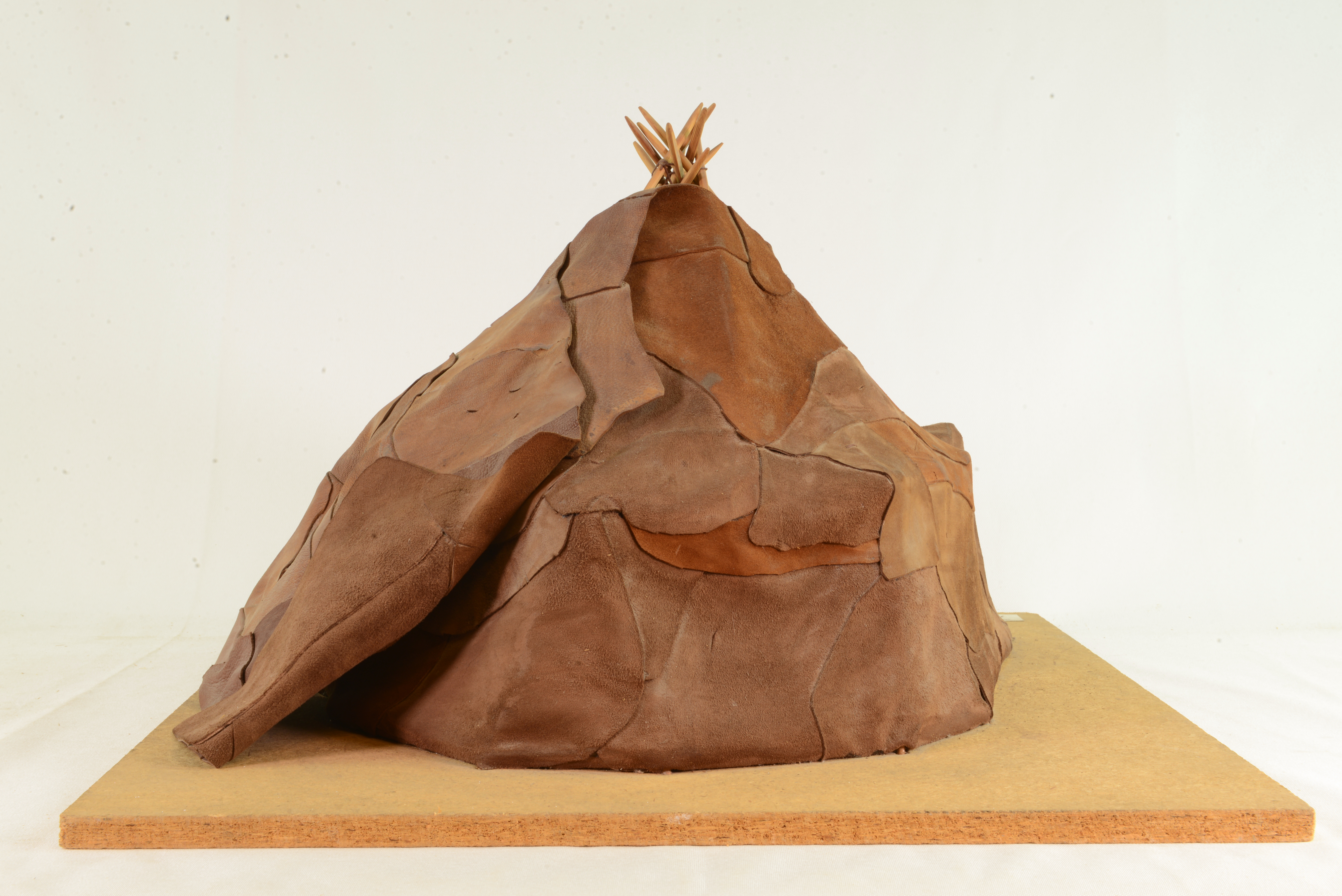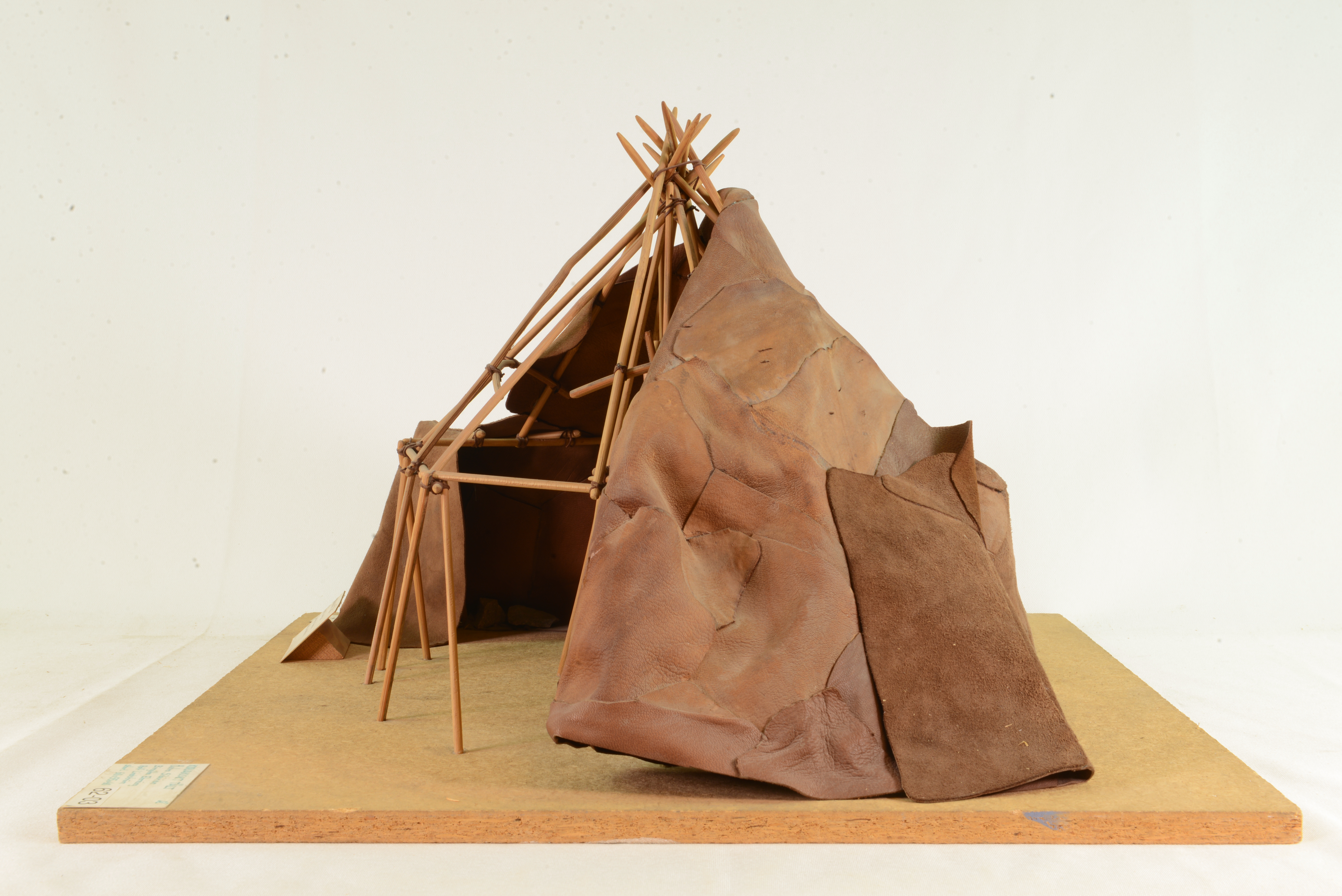 Modellen visar ett flerfamiljstält, som används av de renskötande korjakerna på den sibiriska tundran. Tältstommen består av en tripod omgiven av en väggring av sammanbundna träkäppar. Från varje knutpunkt reses en takkäpp mot toppen. Taket stöds av T-formade stöttor. Täckningen av renskinn surras fast och hålls mot marken av stenar. Stommen är elastisk och står emot hård storm.Centralt i tältet finns eldstaden och runt väggarna familjernas sovtält. Flera tält byggs ibland samman. Jämför med jurtan, modell 8.