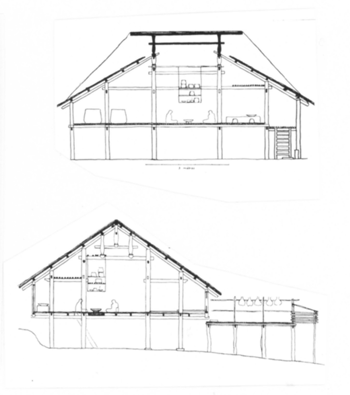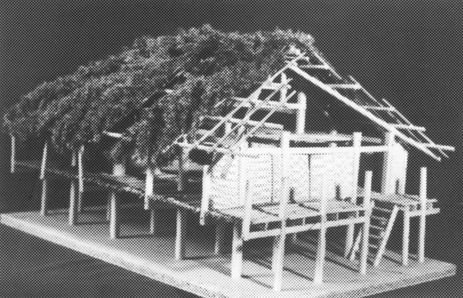 Modellen visar ett Thohus i bergsområdet i norra Vietnam. Huset är anpassat till det regnrika och fuktiga klimatet. Golvet ligger på pålar två meter över marken. På en timmerstomme av traditionell asiatisk typ, med pelare och tvärbjälkar, vilar taket av korsande bambukäppar. Det branta taket sluttar åt fyra sidor och är täckt med bambufibrer. Väggarna är flätade av bambu. Huset skyddar mot häftiga regn. Det stora rummet är ljust, men tak och väggar skärmar av det ofta mycket starka soldiset. Mitt i rummet finns eldstaden. Olika delar av rummet rymmer olika funktioner. Bara kvinnornas del är avbalkad med väggar. Se också modell 86 och 329.