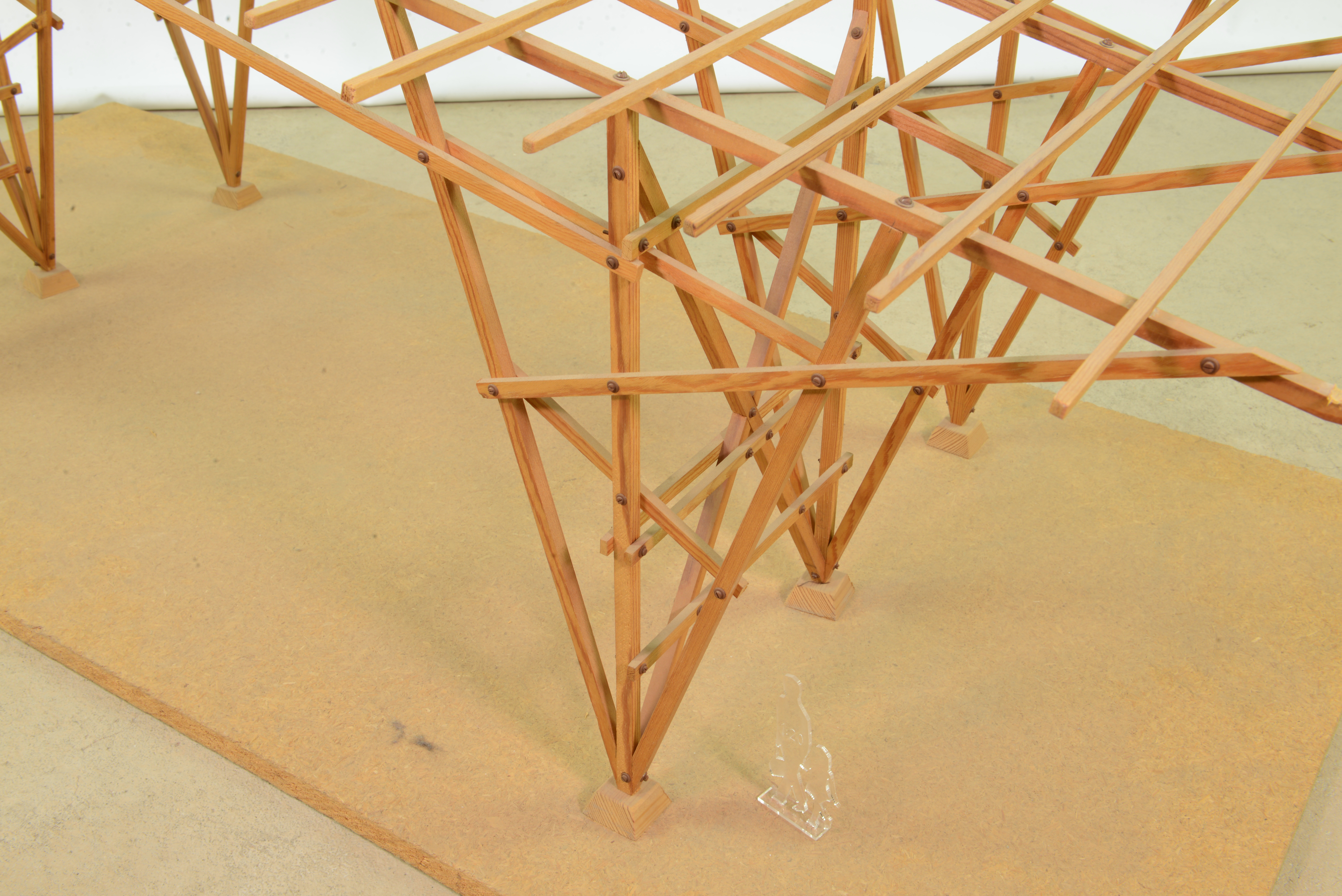 Modellen visar en stakhjaelm (hölada utan väggar), ritad av arkitakten och timmermannen H.C.Glahn 1908. Tekniken för lätta träkonstruktioner utvecklades under 1800-talet utifrån stålbyggnadstekniken. Trä var billigt och lättarbetat. Sammanfogningarna måste ske med bultar, då virkesdimensionerna är klena och för att undvika sprickor vid bulten, använde Glahn ett hjälpstycke i form av en träpropp. Stakhjaelmen är konstruerad för att täcka en så stor volym som möjligt och med papptäckt tak kunde takvinkeln göras så liten som möjligt. Det stora taksprånget skyddar konstruktionen.