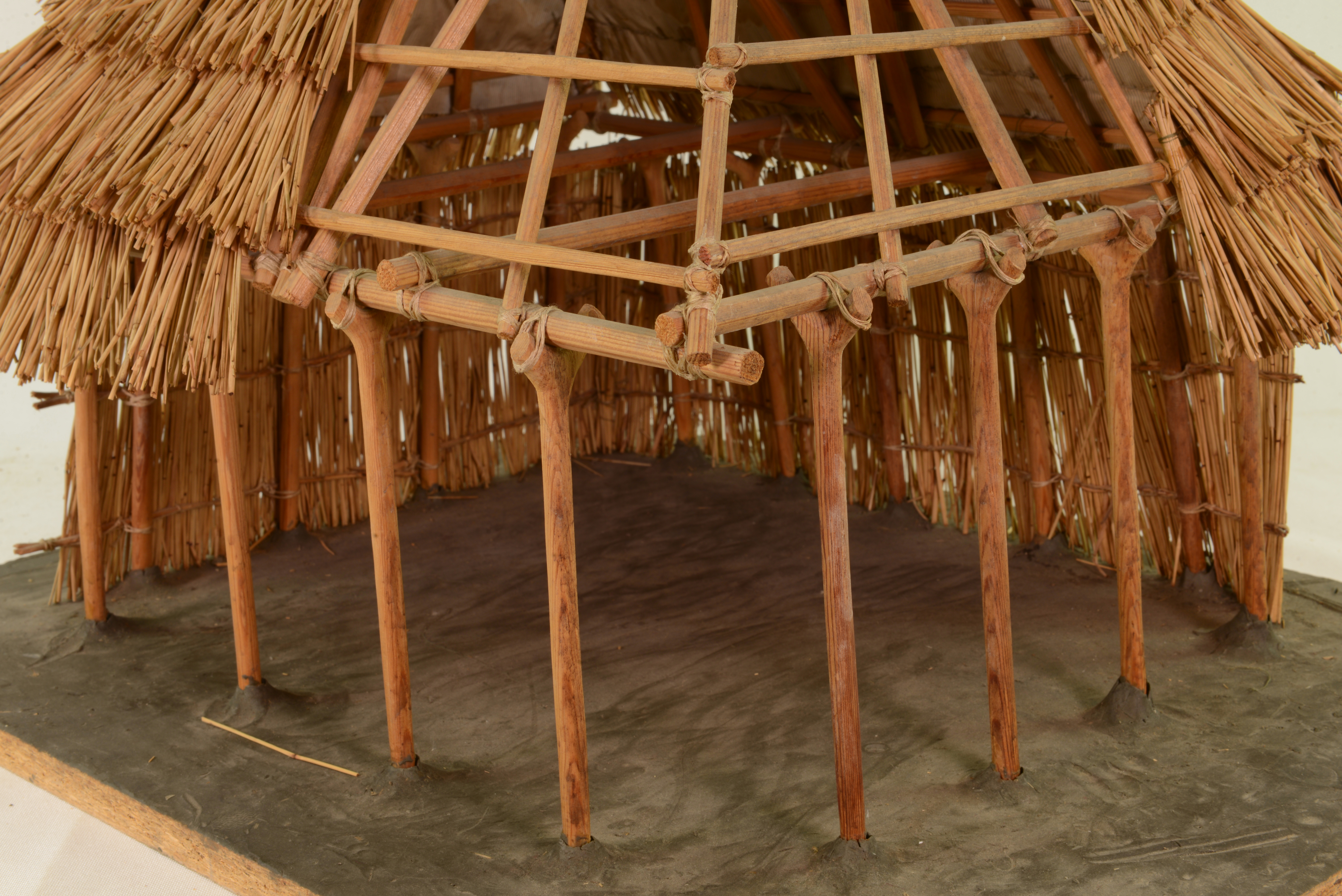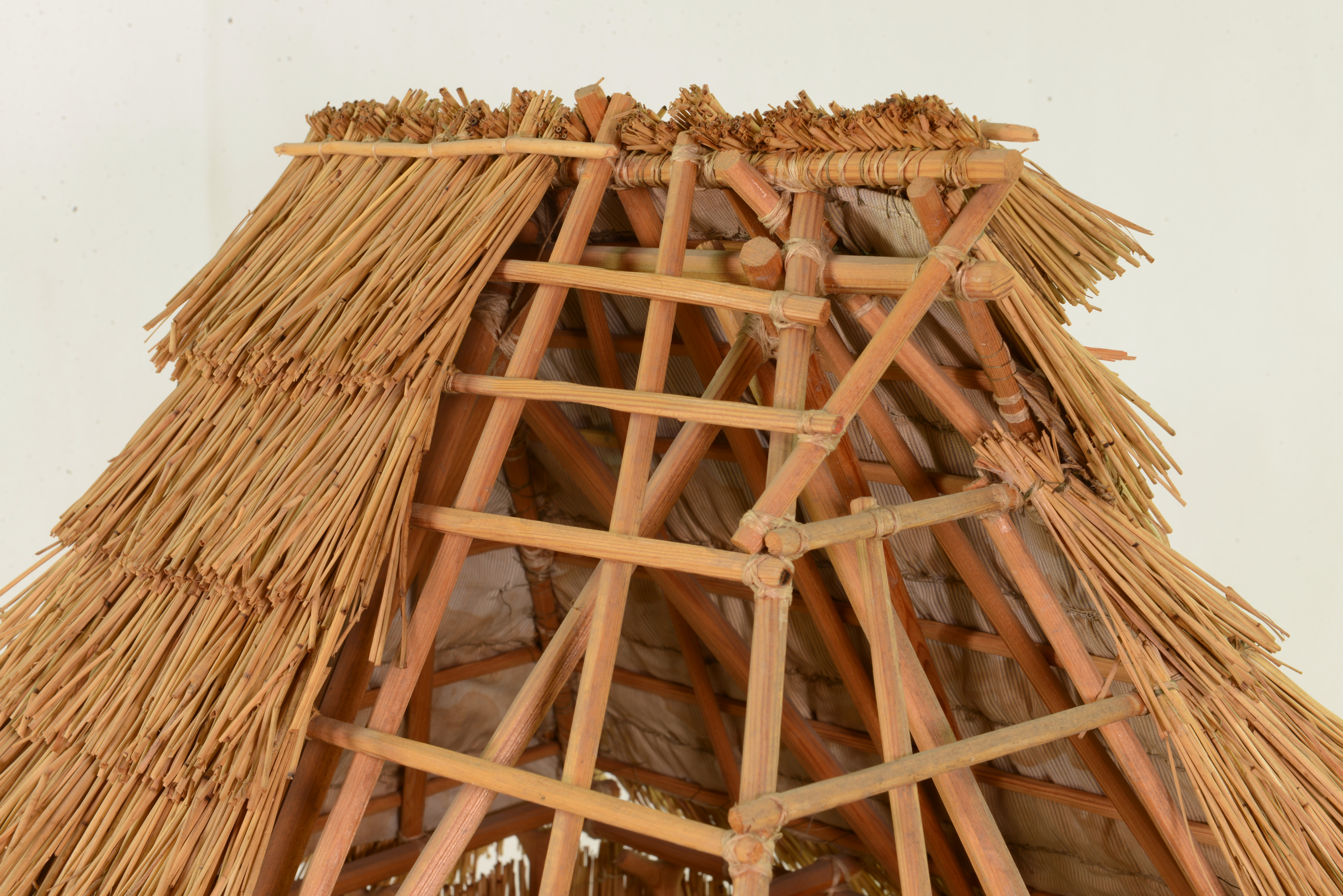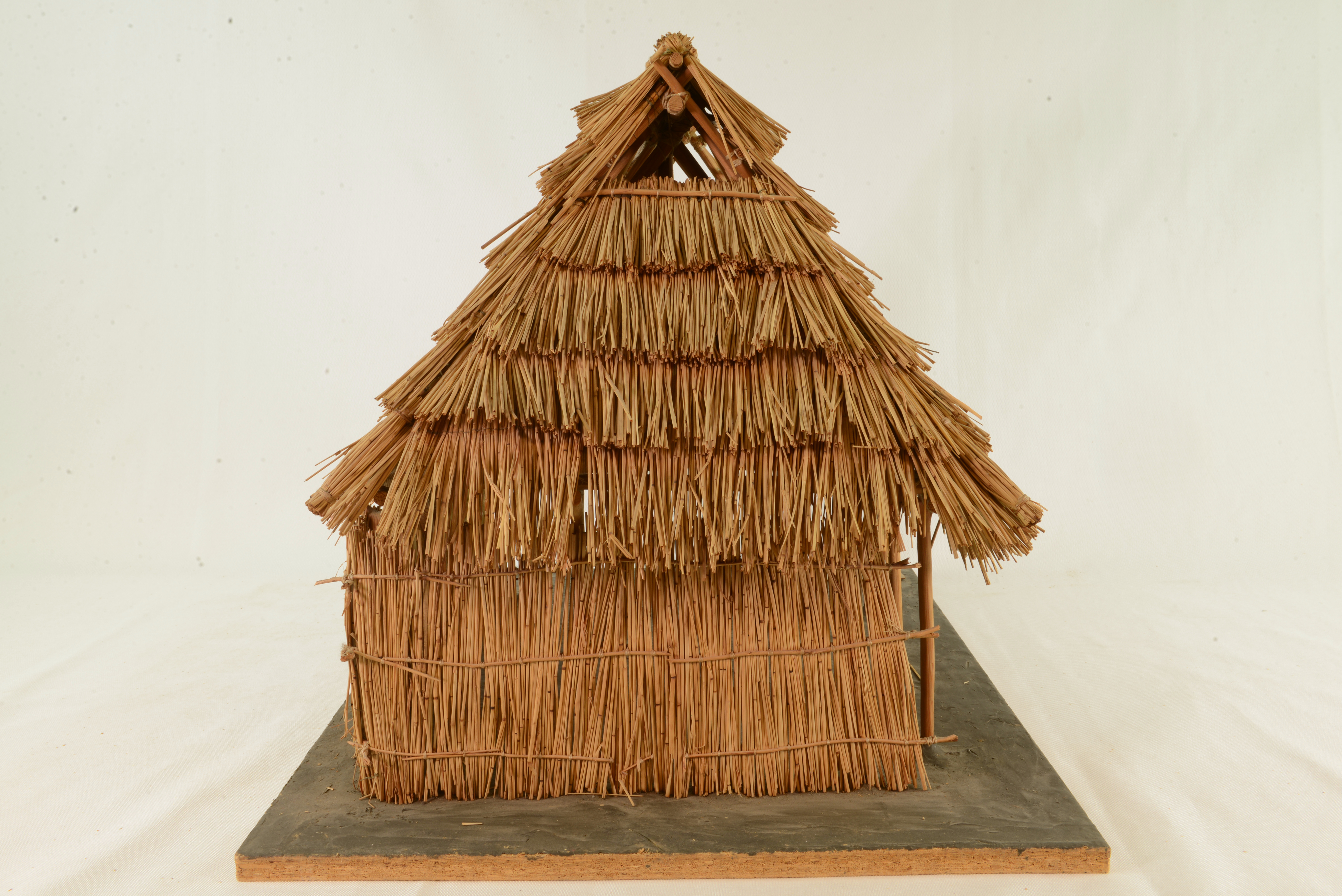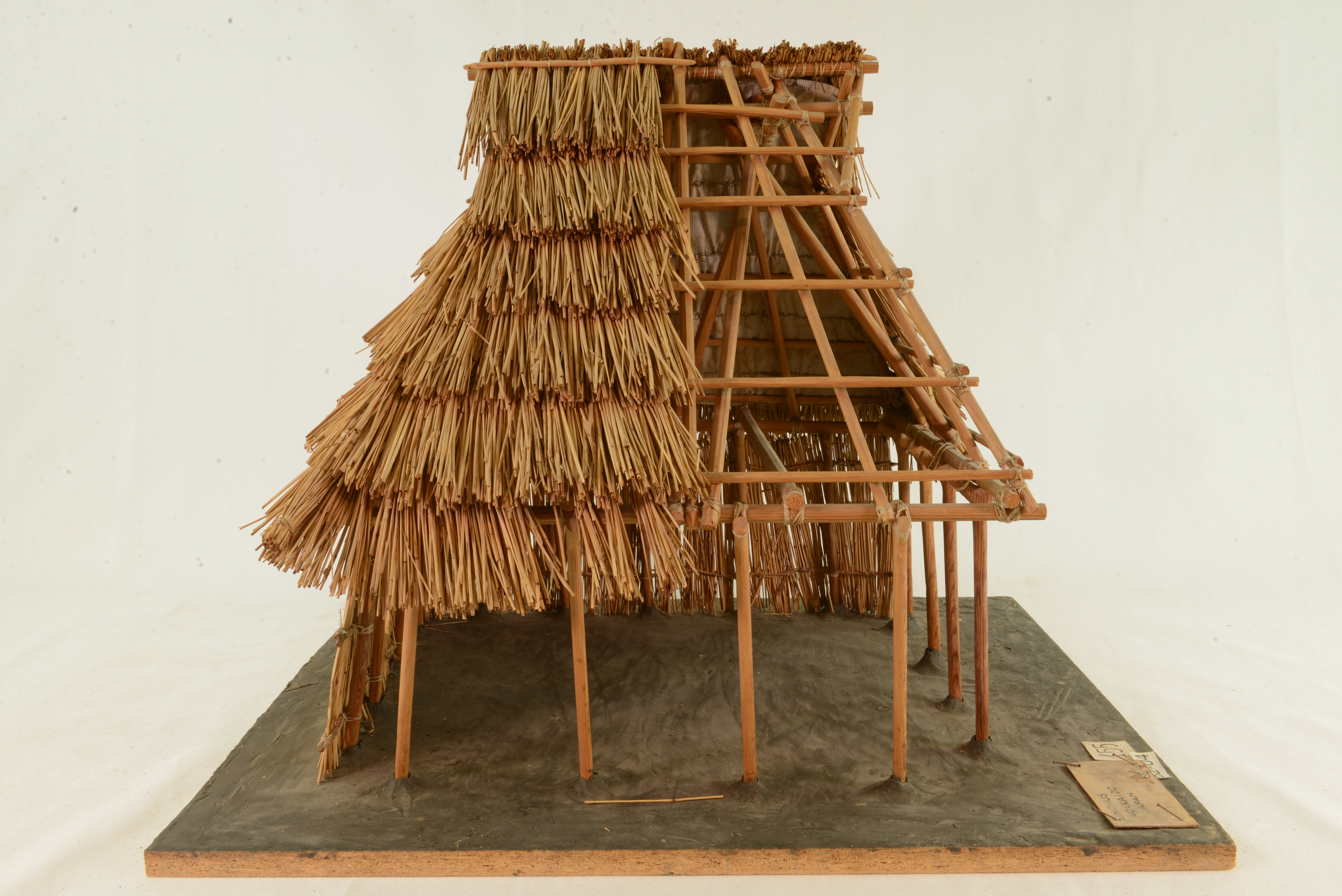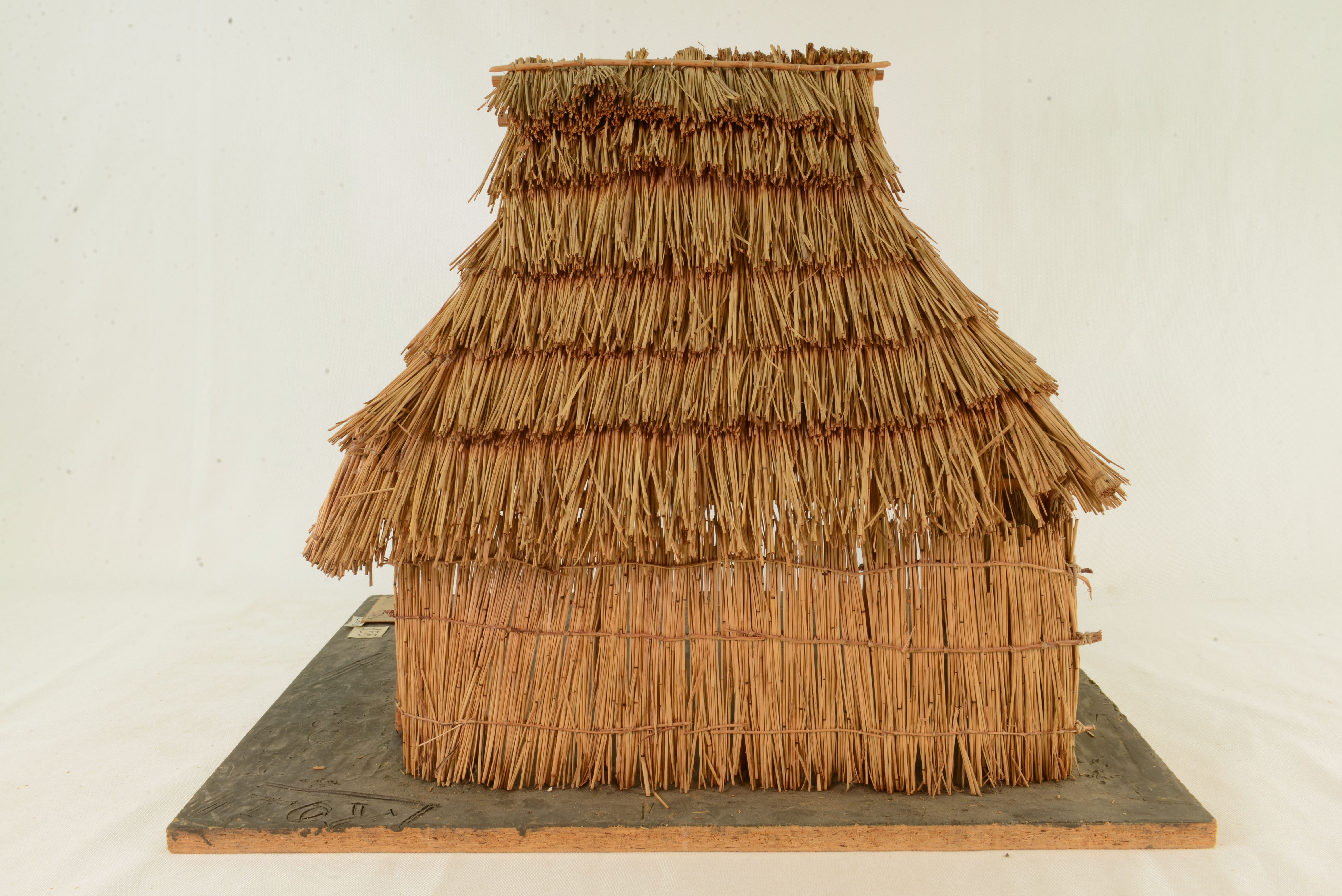 "Aino är ett jägar- och fiskarfolk, som bor på den japanska ön Hokkaido och Kurillerna. Aino bor i hyddor som byggs av en ställning av grova pålar, som klads med flera lager flätade vassmattor. Taket byggs färdigt för sig och sätts sedan upp på ramen, som bildas av väggarnas överliggare. Taket är byggt av två tripoder, som bär ryggåsen. Mot den lutar ribbor och taket täcks med "takpannor" av vassjok, som lagts om käppar.Entrén finns i kortsidan mot söder, fönster mot norr och väster. Elden brinner mitt i hyddan, oavbrutet sedan den dag huset stod färdigt. Vassmattor hängs upp inomhus som rumsdelare. Föräldrarna sover mot norr, barnen mot söder och det nordöstra hörnet är reserverat för gäster."