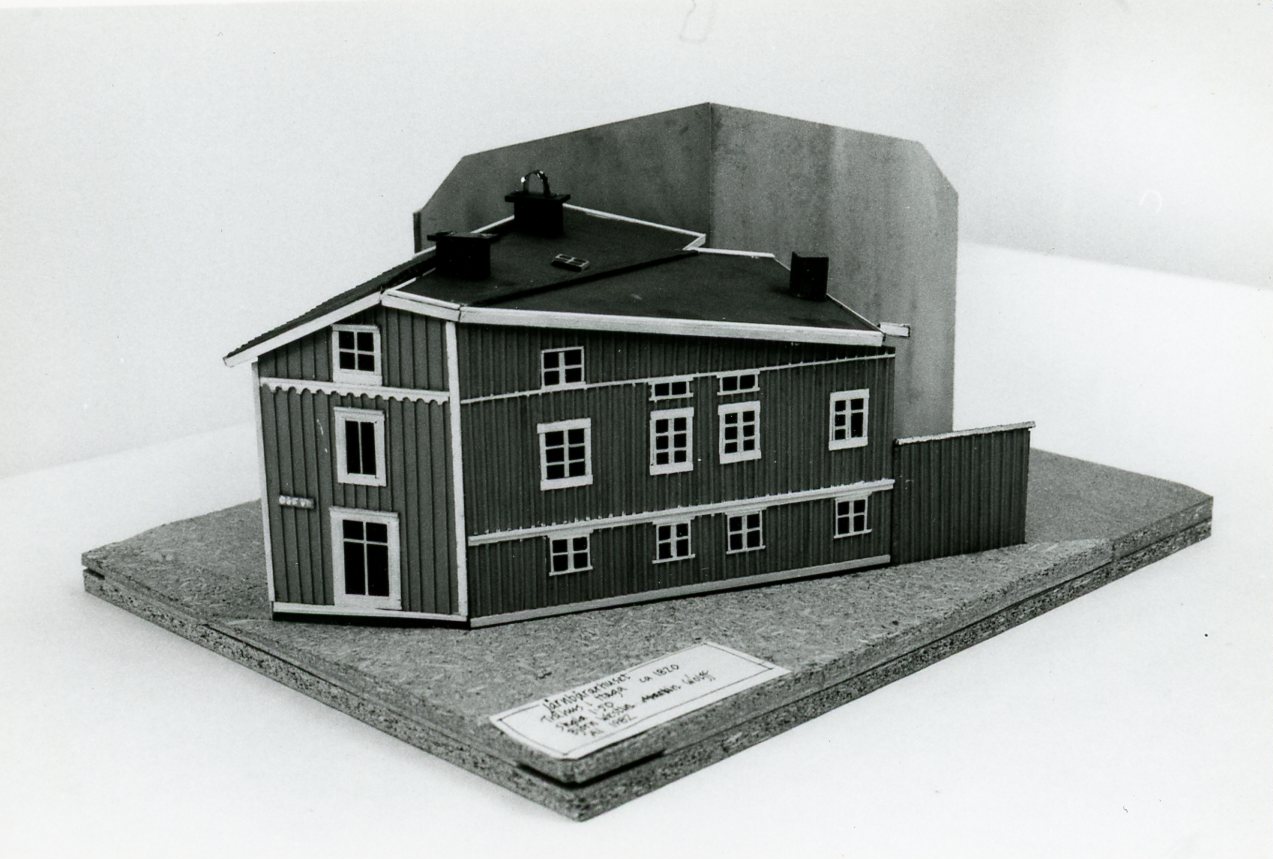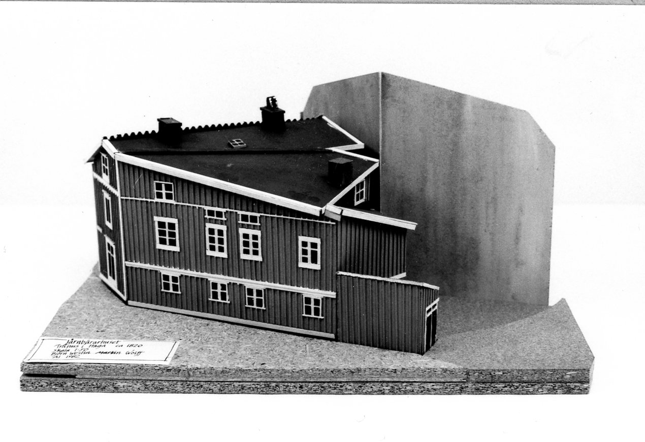 Modellen visar ett tvåvånings trähus från början av 1800-talet, som var beläget i utkanten av stadens första förstad, Haga. Tomten låg i korsningen av Landsvägsgatan (nr 32), som utgjordes av landsvägen åt söder och den oregelbundet dragna Bergsgatan, som går utmed Skansbergets fot. Ursprungligen bebyggd med ett mindre hus med kålgård utfylldes så småningom (1820) fastigheten med de här visade och av tomten framtvingade oregelbundna husformerna. Namnet Järnbärarhuset kan tyda på att innehavaren varit järnbärare vid den närbelägna järnvågen på Järntorget.