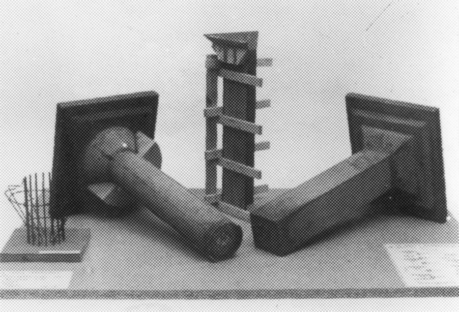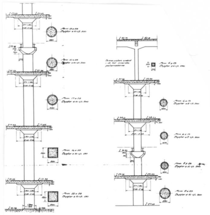 Pelarna i källaren, i det första och i det översta planet har kvadratiskt snitt. Pelarna där emellan är cirkulära. Modellen visar första och andra planets pelare. Pelarnas övre del består av kapitäl och platta, vilka breder ut belastningarna och minskar det utstansande trycket från pelarna i plattan. Av formen fick konstruktionen sitt namn "mushroom". Modellen visar dels det gjutna utförandet, dels armeringen av ett runt kapitäl.