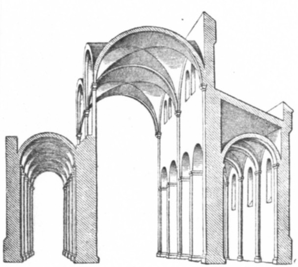 De romanska kyrkorna har slutna rum liksom de fornkristna, men rum och väggar har givits rytmik genom indelning med valv, bågar och kolonner. Kryssvalven består av fyra tunnvalv, som skär varandra i räta vinklar. I tyska domer släppte man in ljus i mittskeppet, genom att just slå kryssvalv över det. Planen blev bunden av ett system av kvadratiska rumsdelar och rummets bredd begränsades. Se också modell 93.