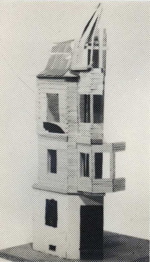 Modellen visar ett utsnitt av burspråk och torn till lanndshövdingehuset från modell 128 A. Den vill återge tekniken för hur den sågade timmerväggen sätts samman till en mångkantig vertikal byggnadsdel med stor arkitektonisk uttryckskraft.