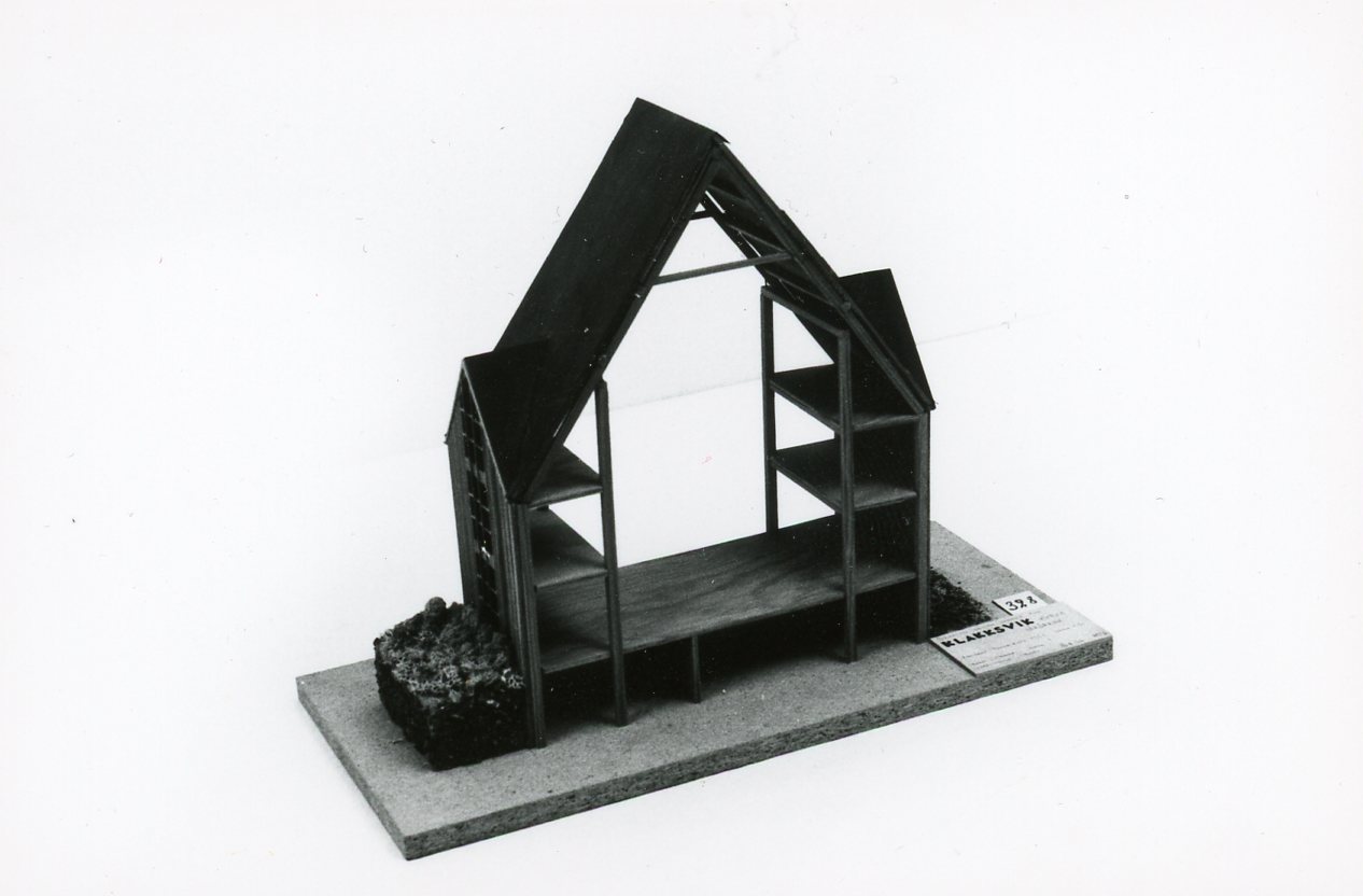 Modellen visar en sektion genom Klakksviks kyrka från 1963. Arkitekten Peter Koch har i fasadmaterial och form anpassat sig till den färöiska byggnadstraditionen. Kyrkan är rektangulär med sadeltak. Stommen är av betong, väggarna kring gavlarna murade av basalt och fönsterpartierna utefter långsidorna av svartstruken furu. Taket är lagt med grå skiffer. Det stora kyrkorummet består av ett mittskepp med trevåningsläktare utefter sidorna.