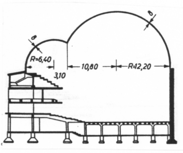 1935 ritade den spanske konstruktören Eduardo Torroja den dittills största pelotahallen, 33 x 55 m (pelota är ett baskiskt bollspel). För att ge hallen rymd och täcka den assymetriska planen, formade han taket av ett skal, bestående av två längsgående cylindersektioner. Fönsterpartierna utgjordes av ribbnät med triangulära öppningar. Taket stöder i huvudsak på sidoväggarna. Beräkningarna av den komplicerade konstruktionen kompletterades med hållfasthetsanalys i modell. Byggnaden förstördes av markvibrationer från bombningar under inbördeskriget. Taket föll ihop, eftersom det saknade förstyvande bågar.