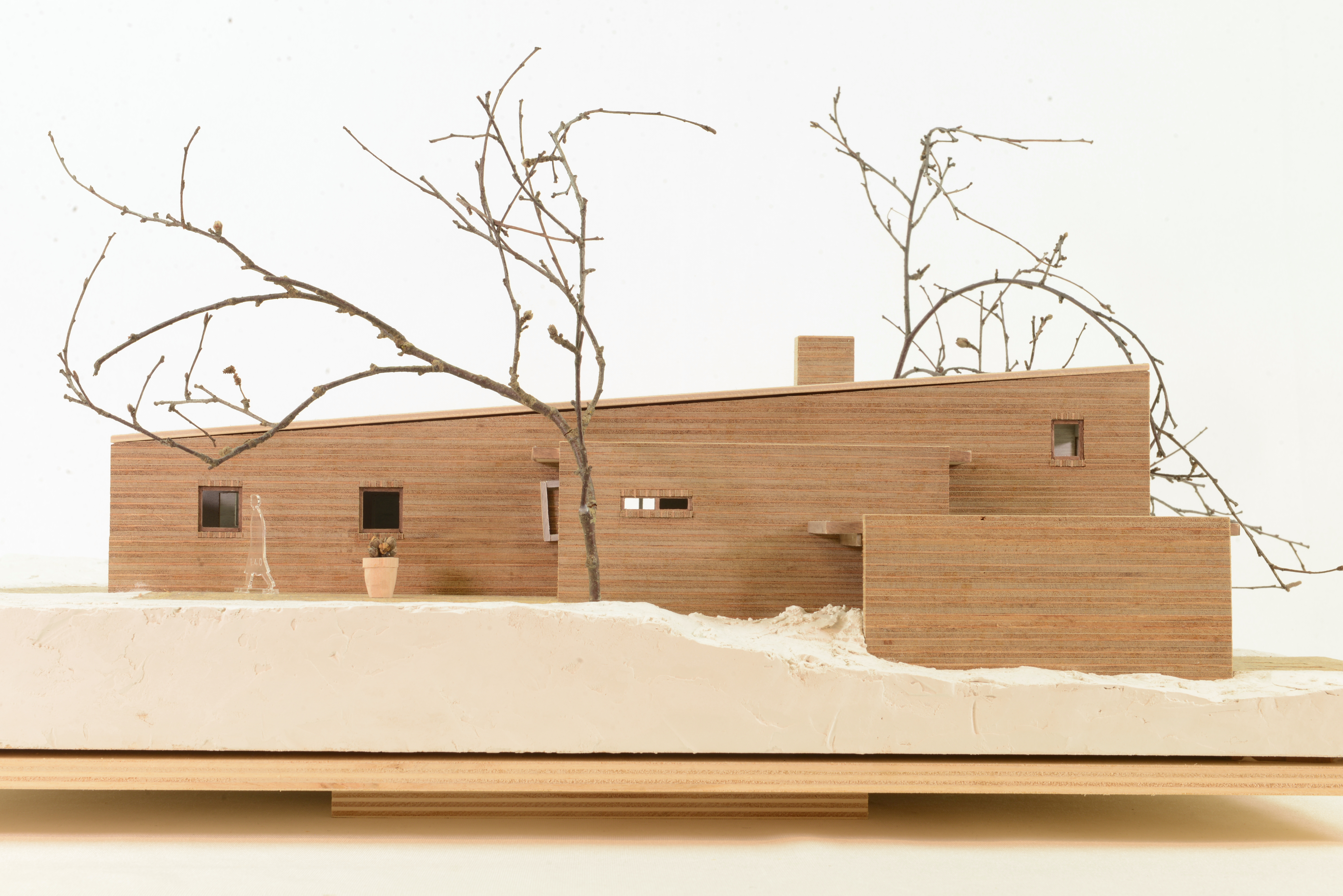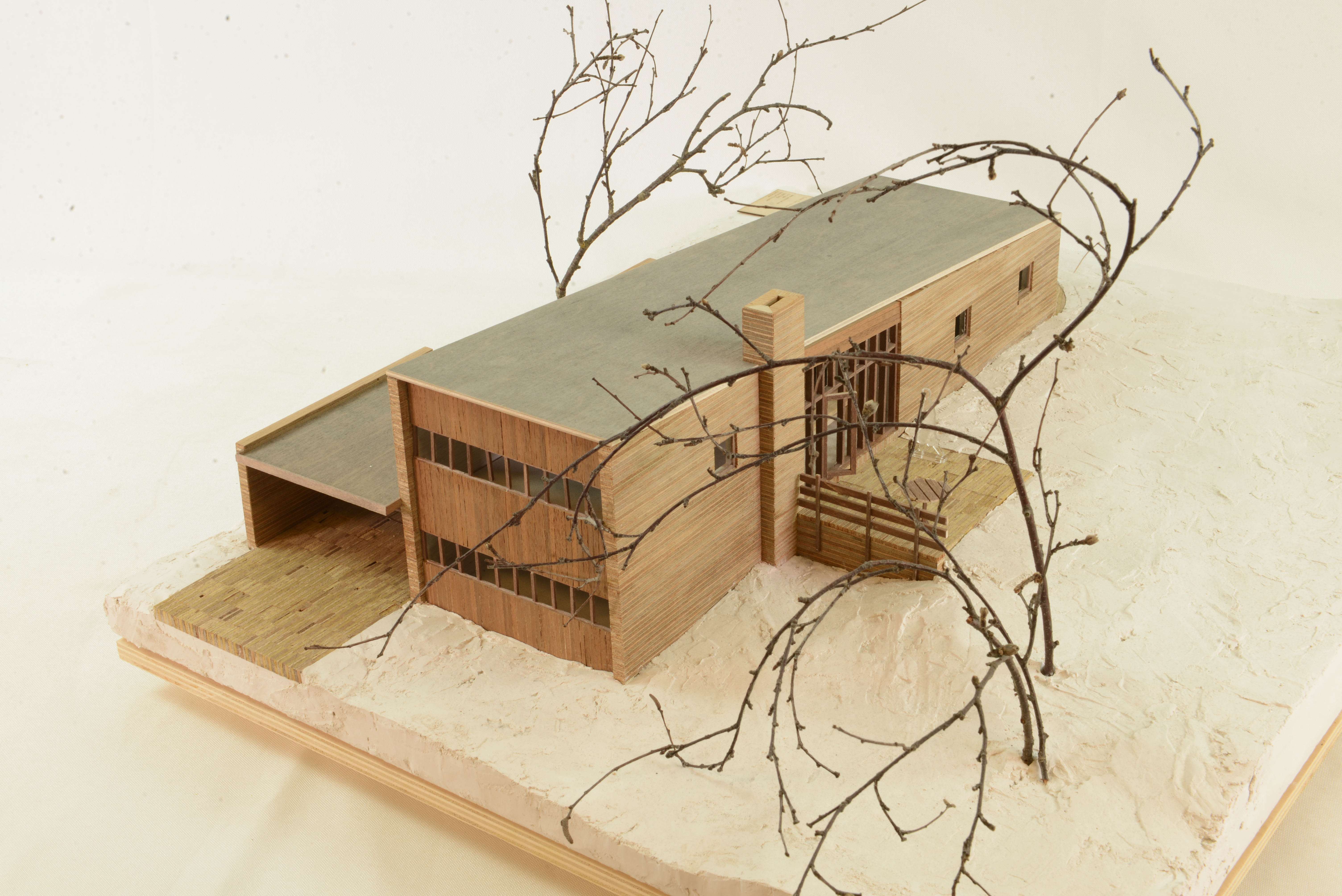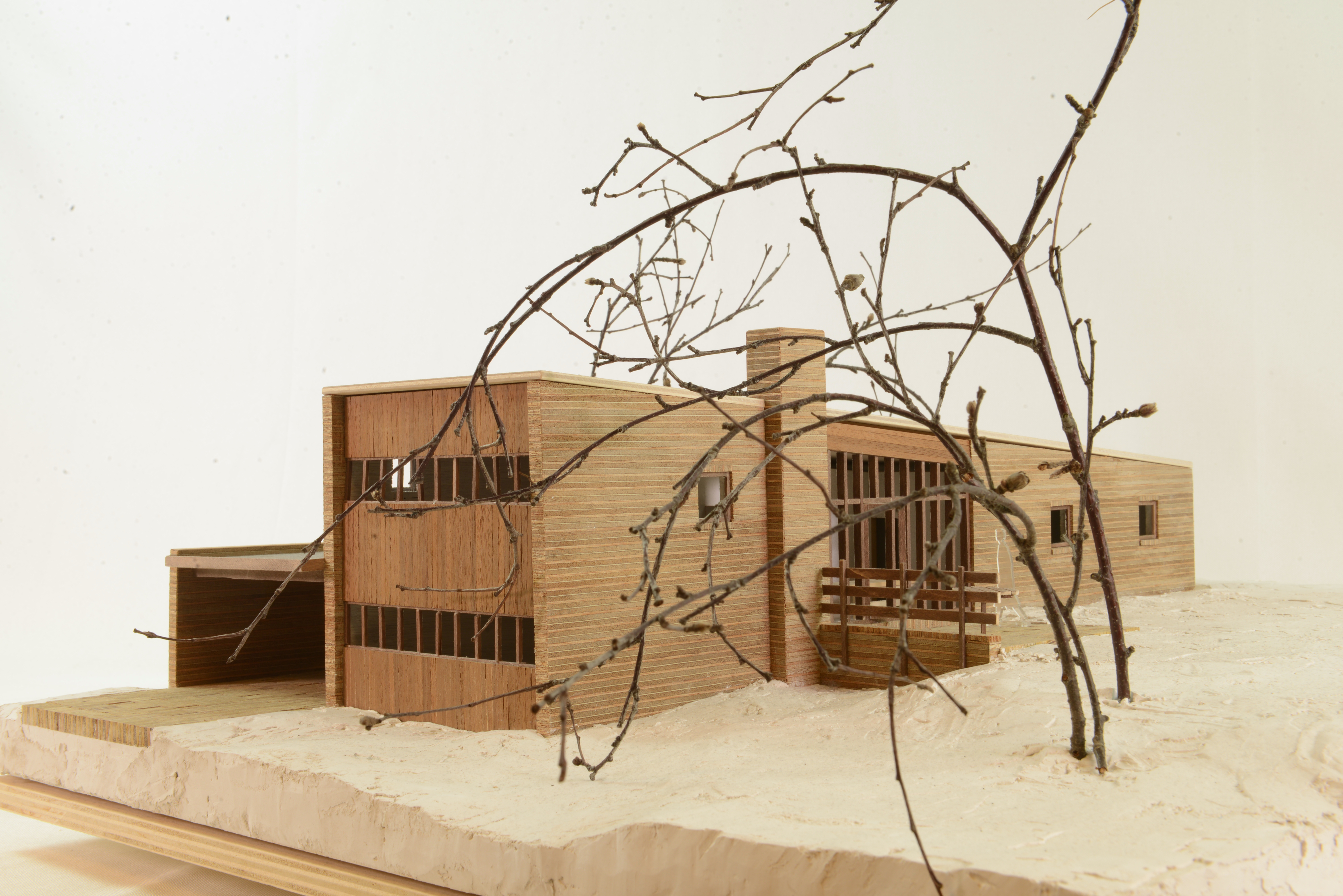 Huset: sektionsskuren lauanplywood, landskap frigolit med spacklad yta