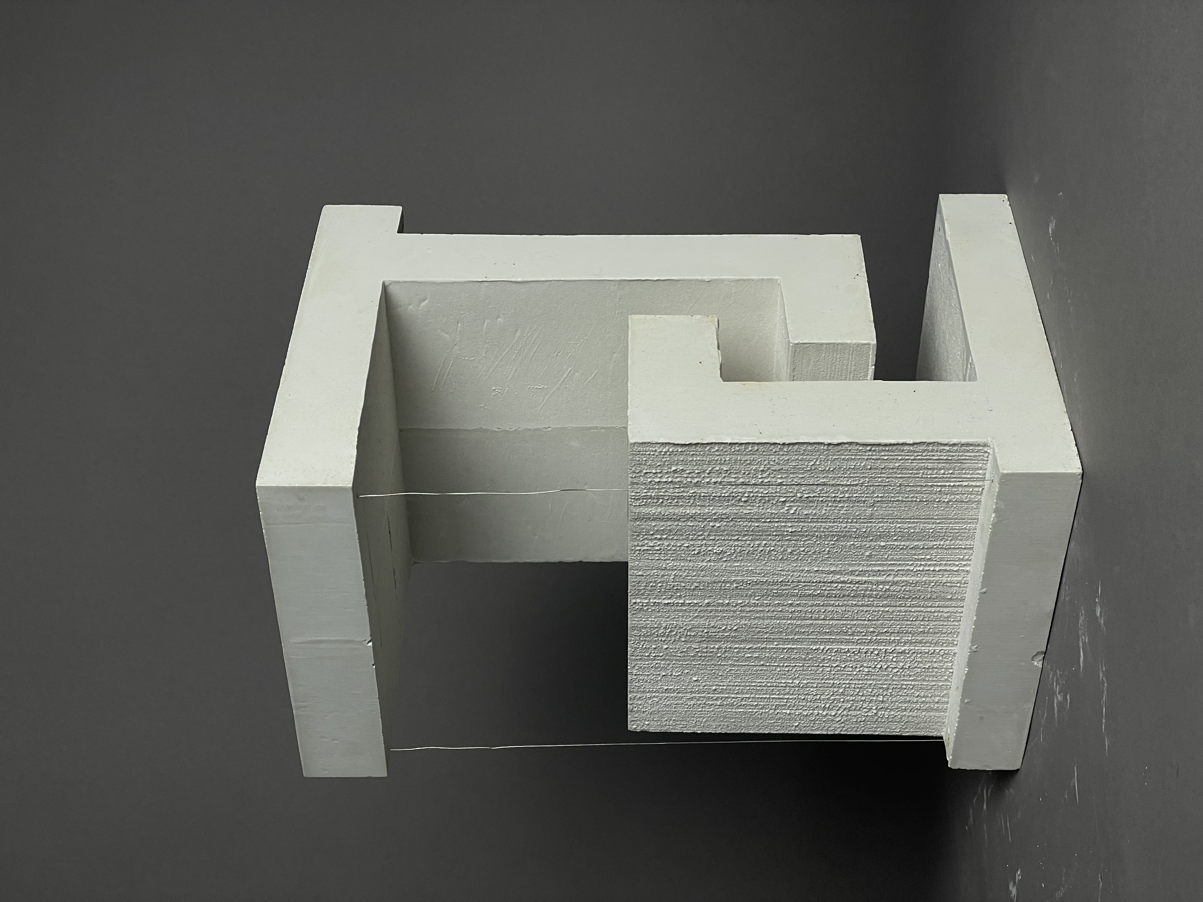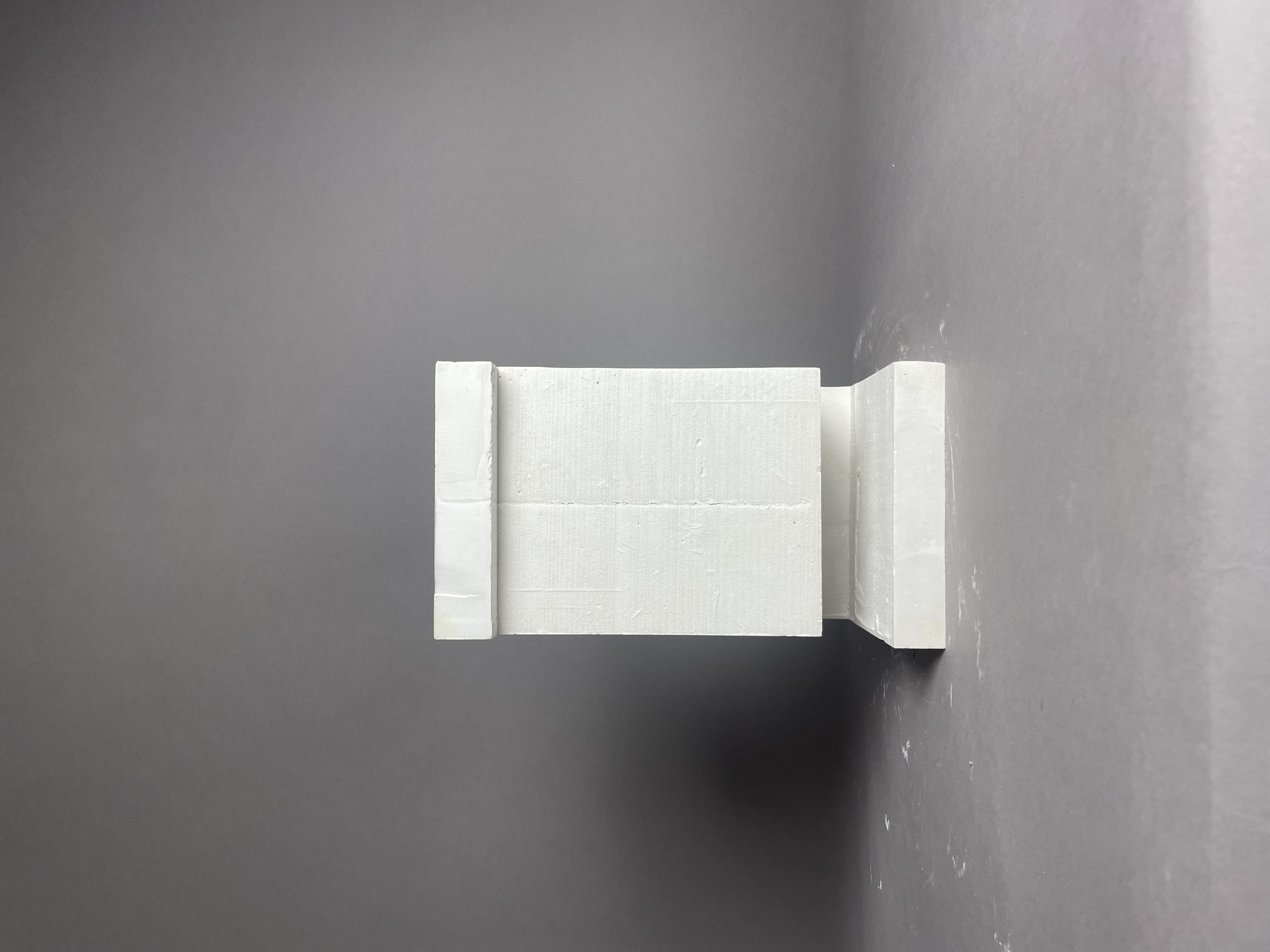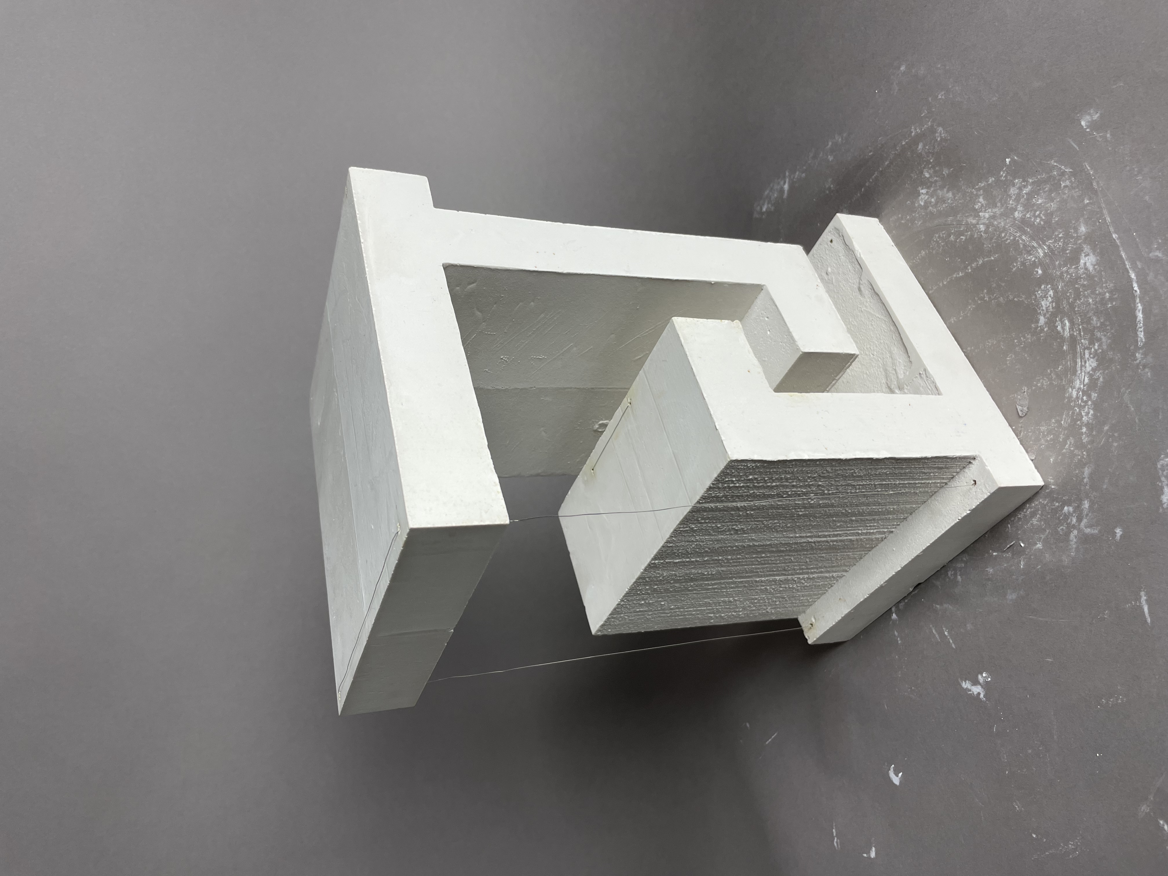 Skallös konceptuell modell som visar tillbyggnadens insida. Modellen vill belysa byggnadens ljusa, lätta och luftiga rum. Formens inspiration kommer från tegelstenarna och det obrutna flödet som trappan skapar invändigt. Även framhäva de ljusinsläpp som fönstren ger.