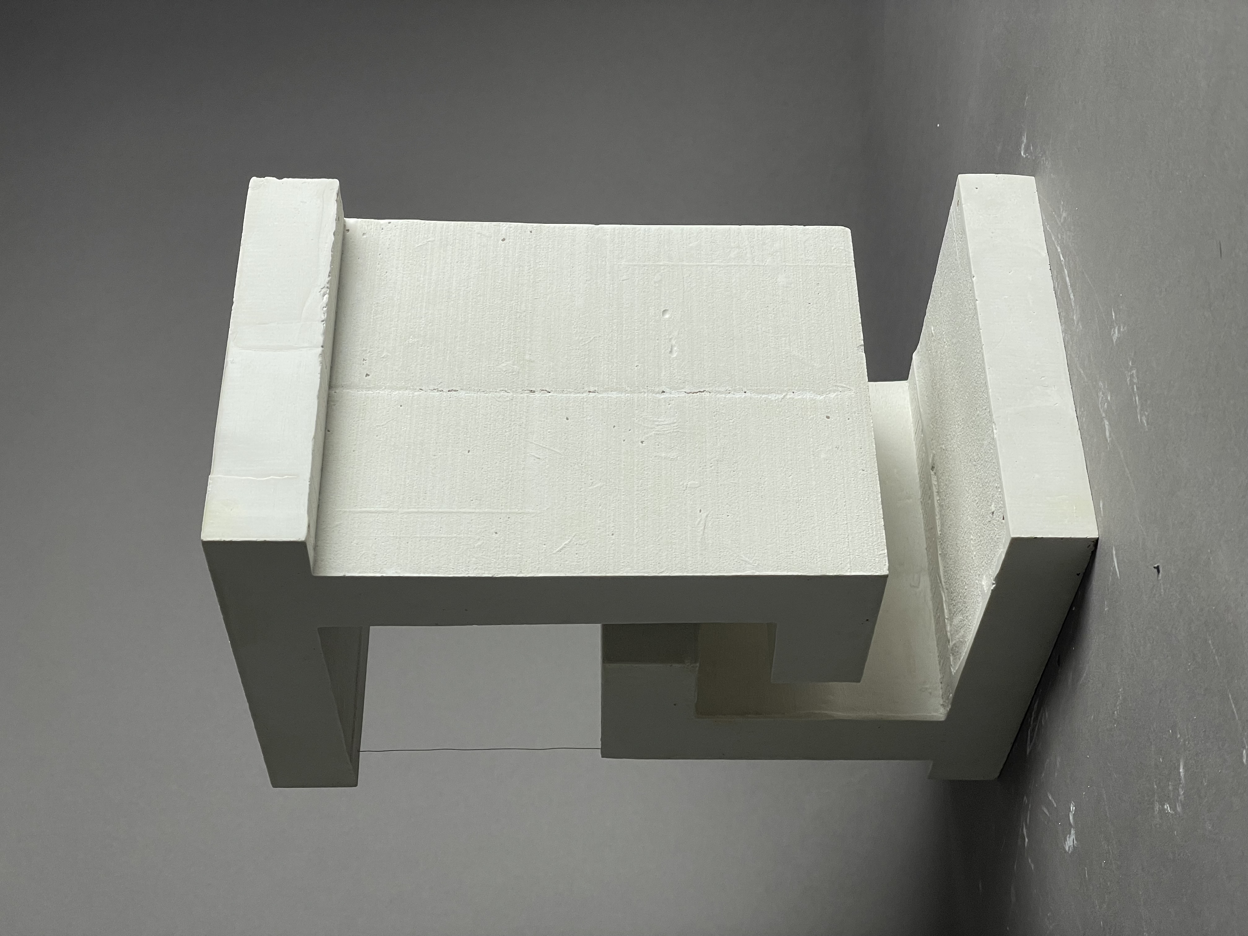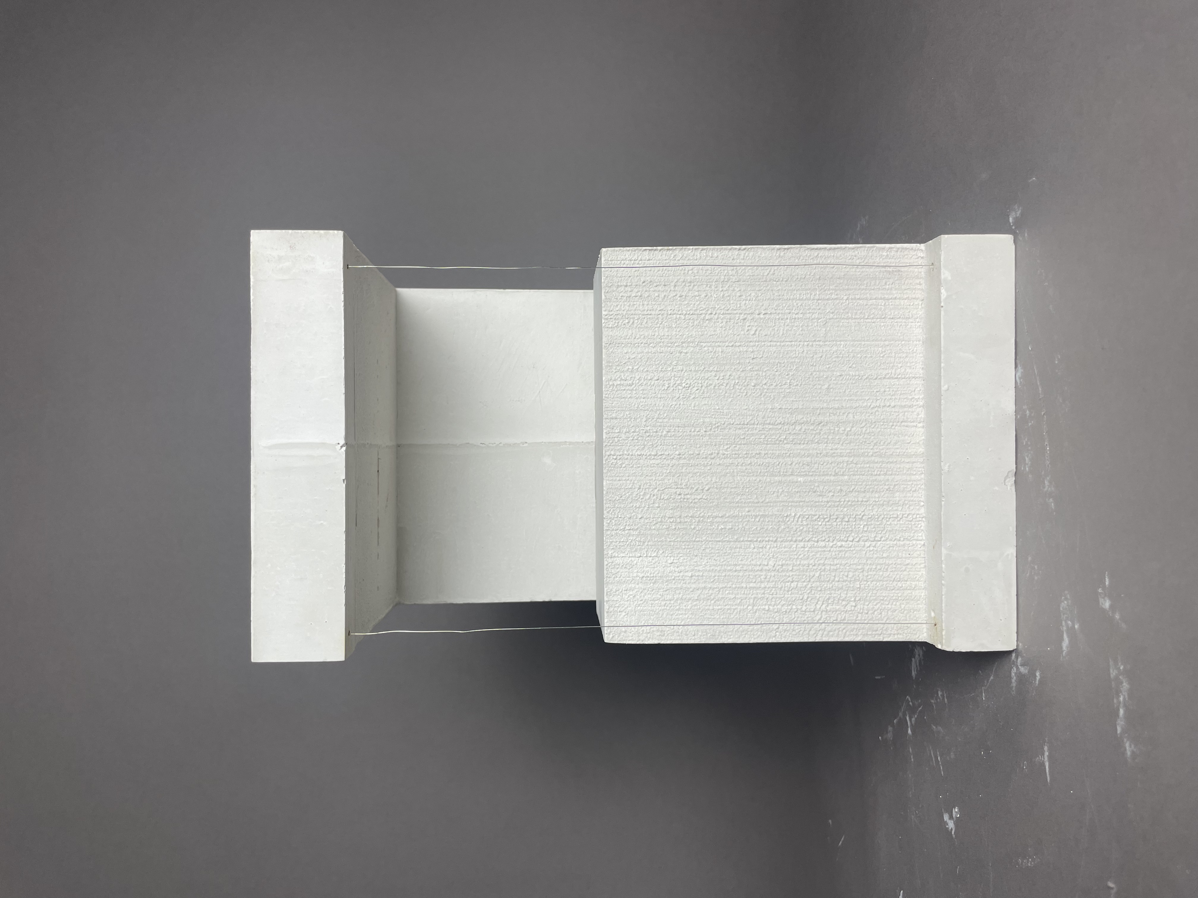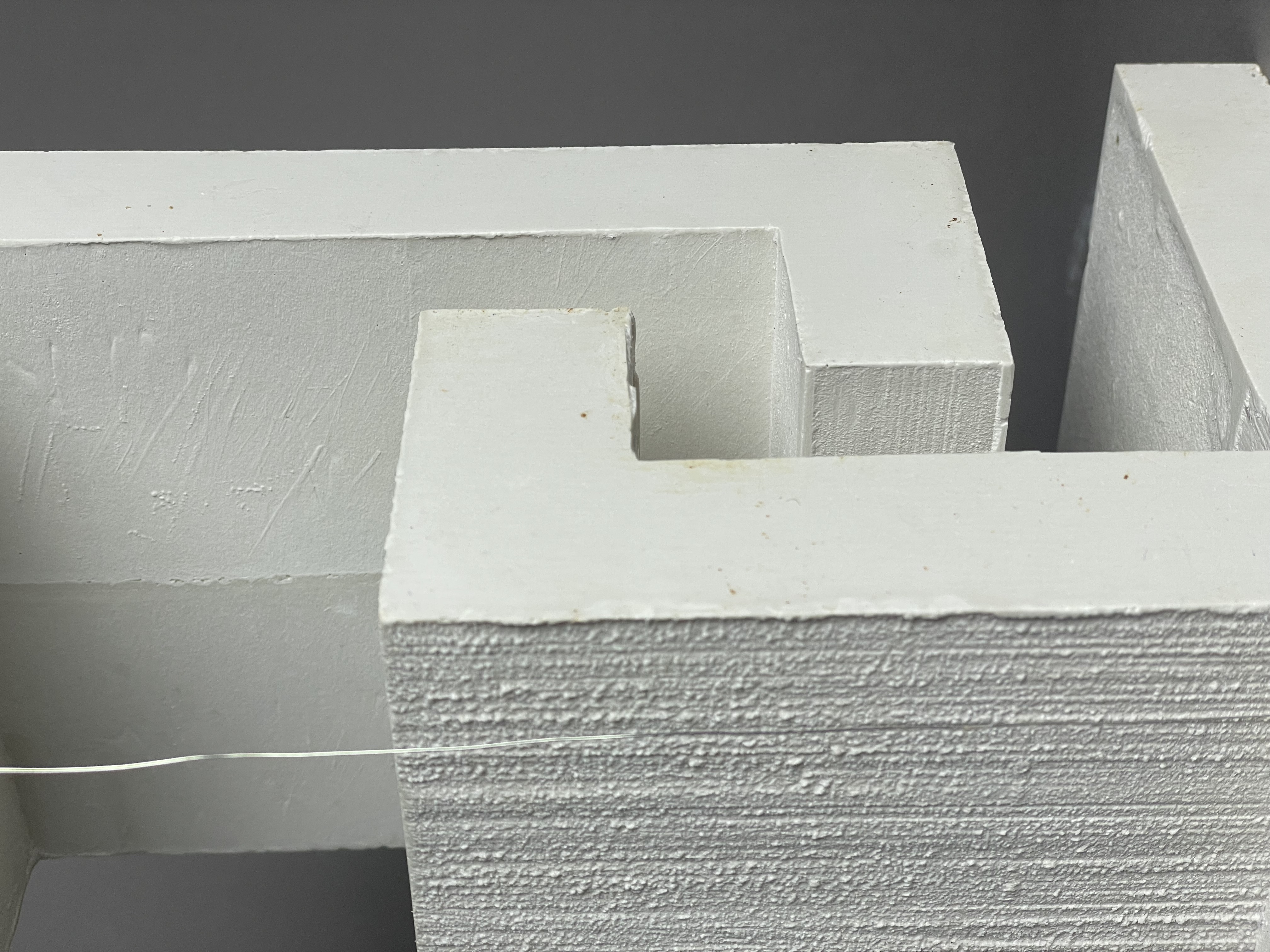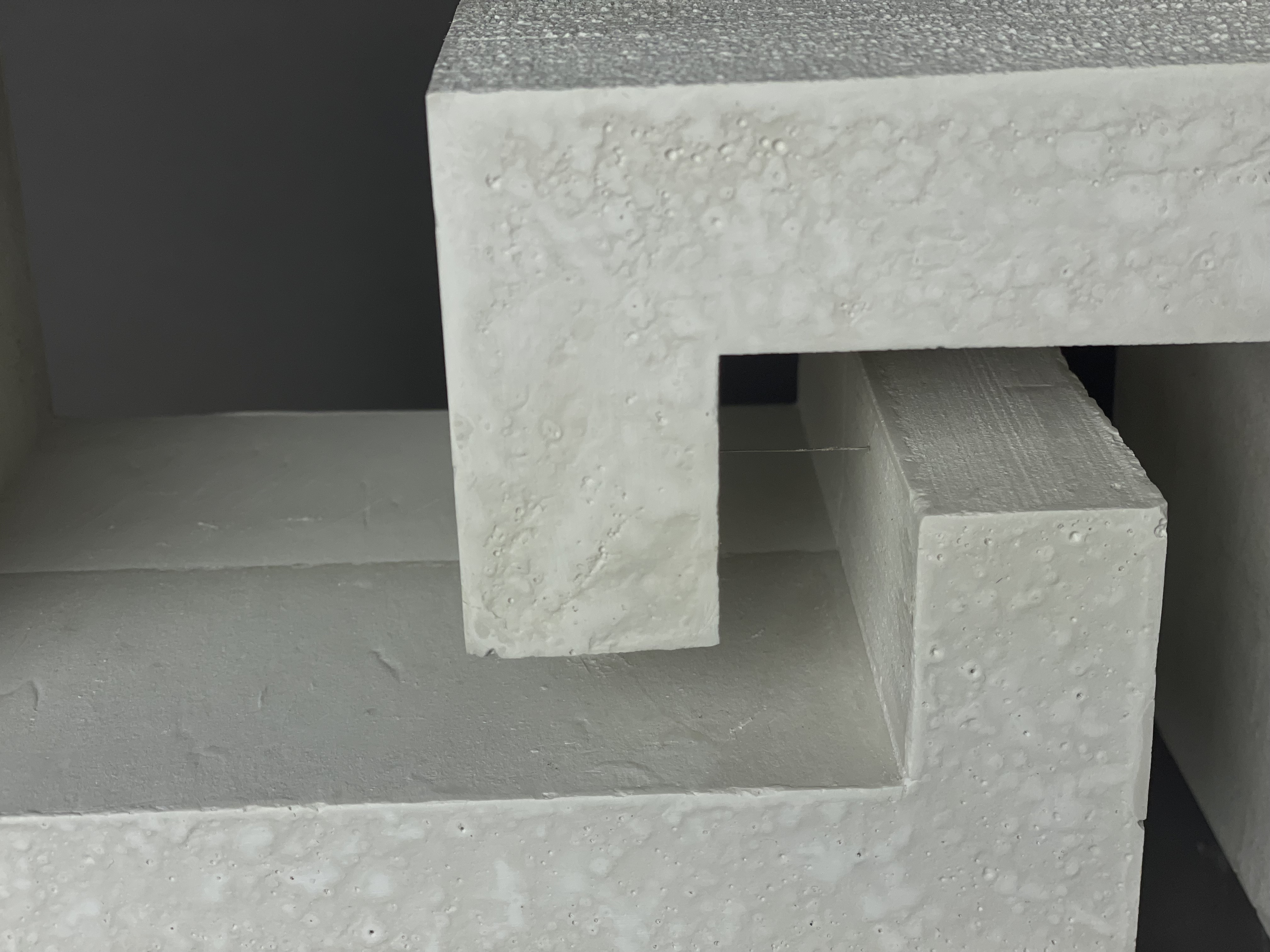 Skallös konceptuell modell som visar tillbyggnadens insida. Modellen vill belysa byggnadens ljusa, lätta och luftiga rum. Formens inspiration kommer från tegelstenarna och det obrutna flödet som trappan skapar invändigt. Även framhäva de ljusinsläpp som fönstren ger.