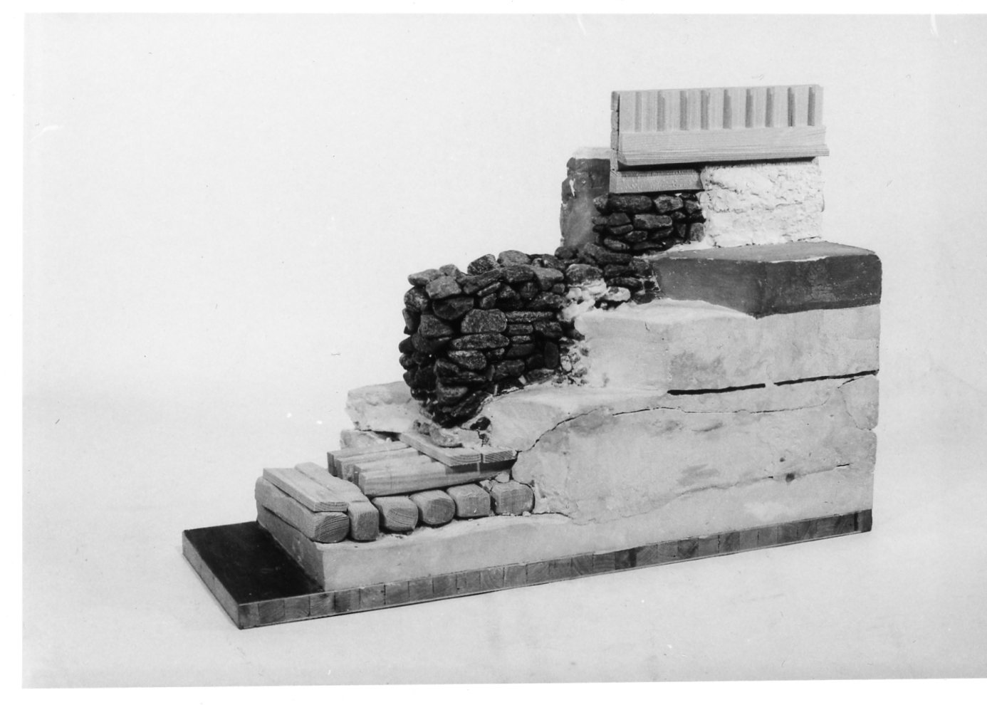| dc.description.abstract | Modellen söker illustrera grundläggningen till Järnbärarhuset. Den är utförd i olika skikt så att man kan se hur grunden är utförd, från lergrunden räknat: rustbädden med tvär- och längsgående sågat eller skrätt timmer, tjocka fördelande plank och däröver en kallmur, som sticker något över mark och är putsad. På kallmuren är träkonstruktionen fästad: syll och vattenbräda, över vilka det liggande timret och panelen med sin vattenbräda byggs upp. | sv |