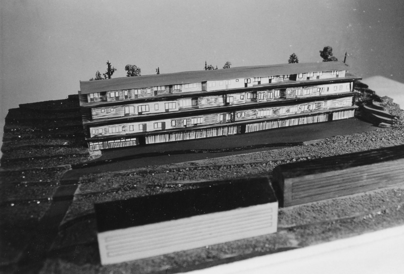 Modellen visar Erik Fribergers småhus på betongdäck i Kallebäck i Göteborg. Tomter i form av betongplattor på pelare i tre plan byggdes och på plattorna byggdes friliggande bostäder av egnahemstyp. Stomhuset har tre öppna trapphus och 18 tomter. Höjden mellan betongplattorna är 4 m. Utefter stomhusets långsidor löper balkonger, som ej är bebyggda. Bostäderna är byggda i trä och var från början olika stora. I stomhusets bottenvåning finns garage, förrådsrum och gemensamma utrymmen.