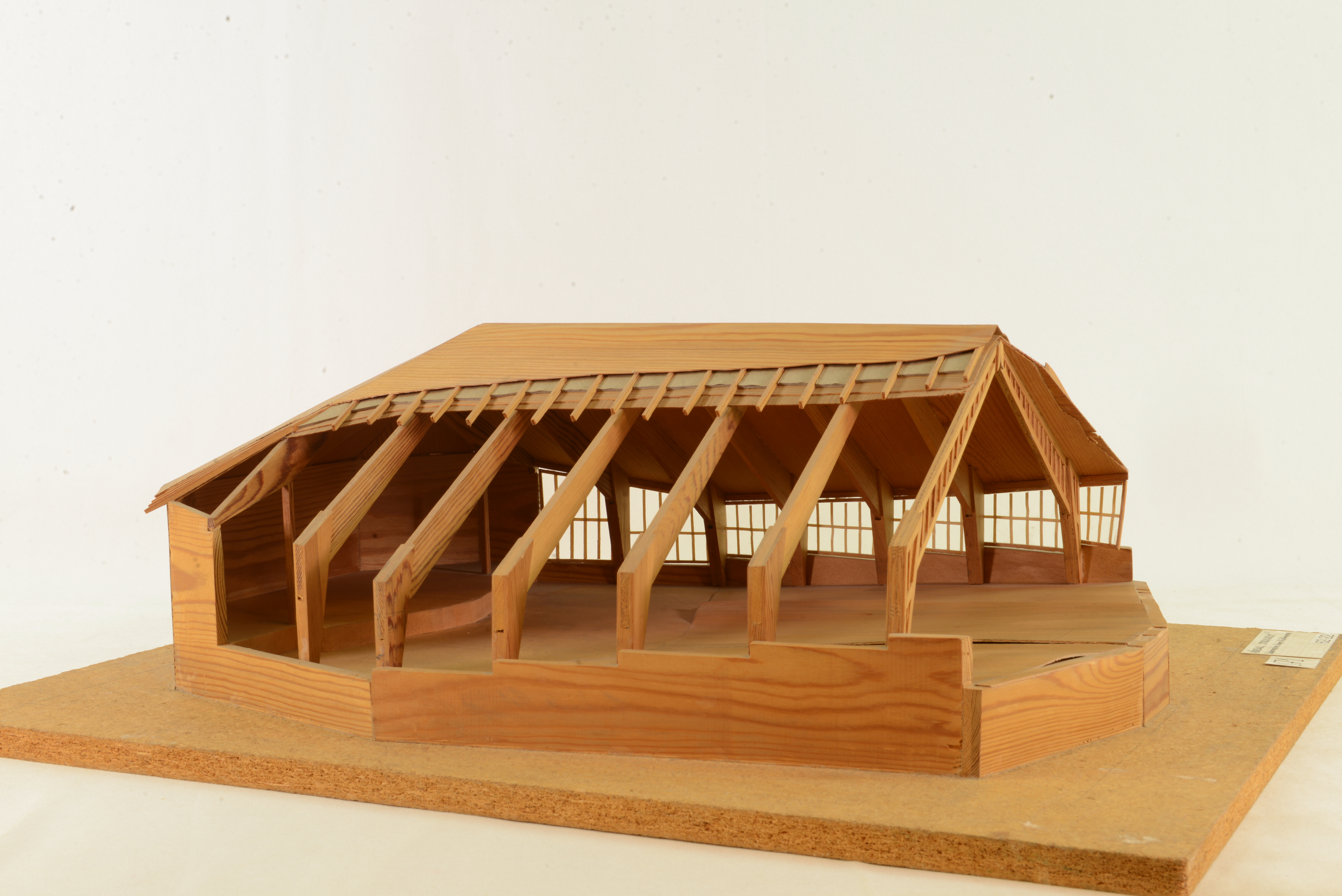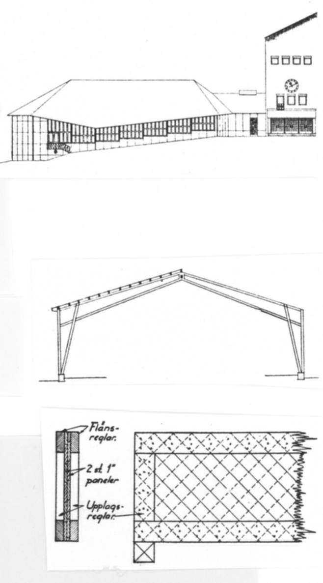 | dc.description.abstract | Modellen visar takkonstruktionen i samlingssalen till Södermalms flickläroverk i Stockholm, byggd 1945. Taket har bärande, invändiga treledsbågar av s k HB-balkar (I-balkar med liv av två korsande lag diagonalbrädor samt flänsar av lamellträ). Utvändigt är det klätt med skiffer. De fasta väggarna i socklar och kortväggar är av betong. Samlingssalens golv följer marklutningen. Arkitekter var Nils Ahrbom och Helge Zimdahl. | sv |
