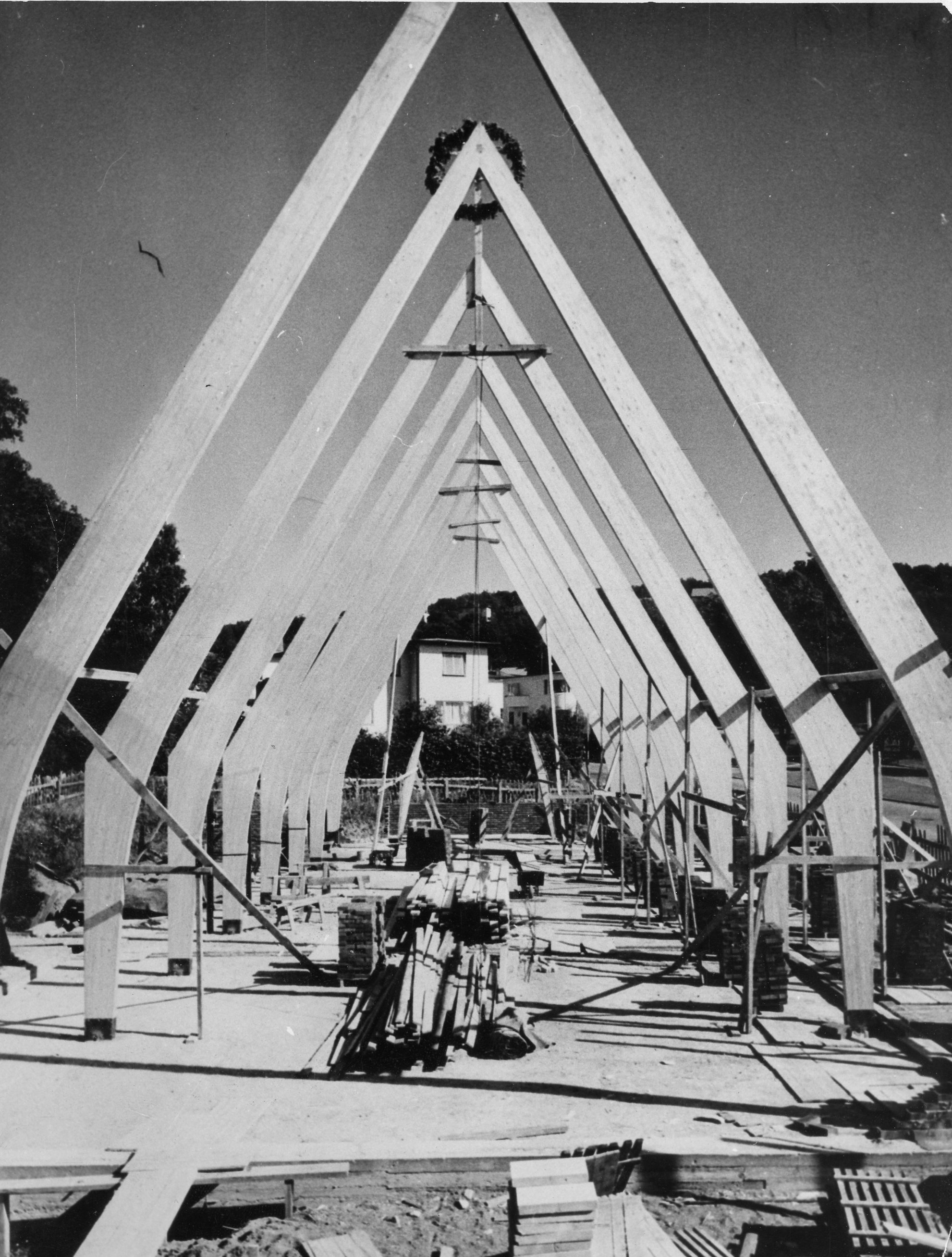 Modellen visar Skårs kyrka från 1957, arkitekt Johan Tuvert. Stommen utgörs av limträbalkar från Töreboda. Taket bärs av åsar. De låga ytterväggarna står utanför bågarna och är murade i tegel.
