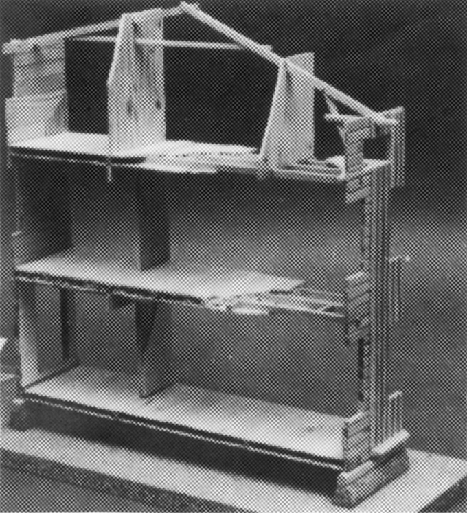 Modellen visar en sektion på tvären genom Järnbärarhuset som byggdes ca 1820. Man ser stenfoten, syllen, det sågade eller skrädade timret, panelen med dess locklister och vattenbrädan. På insidan ses bjälklagen med dess fyllningar och överst husets takstolar.