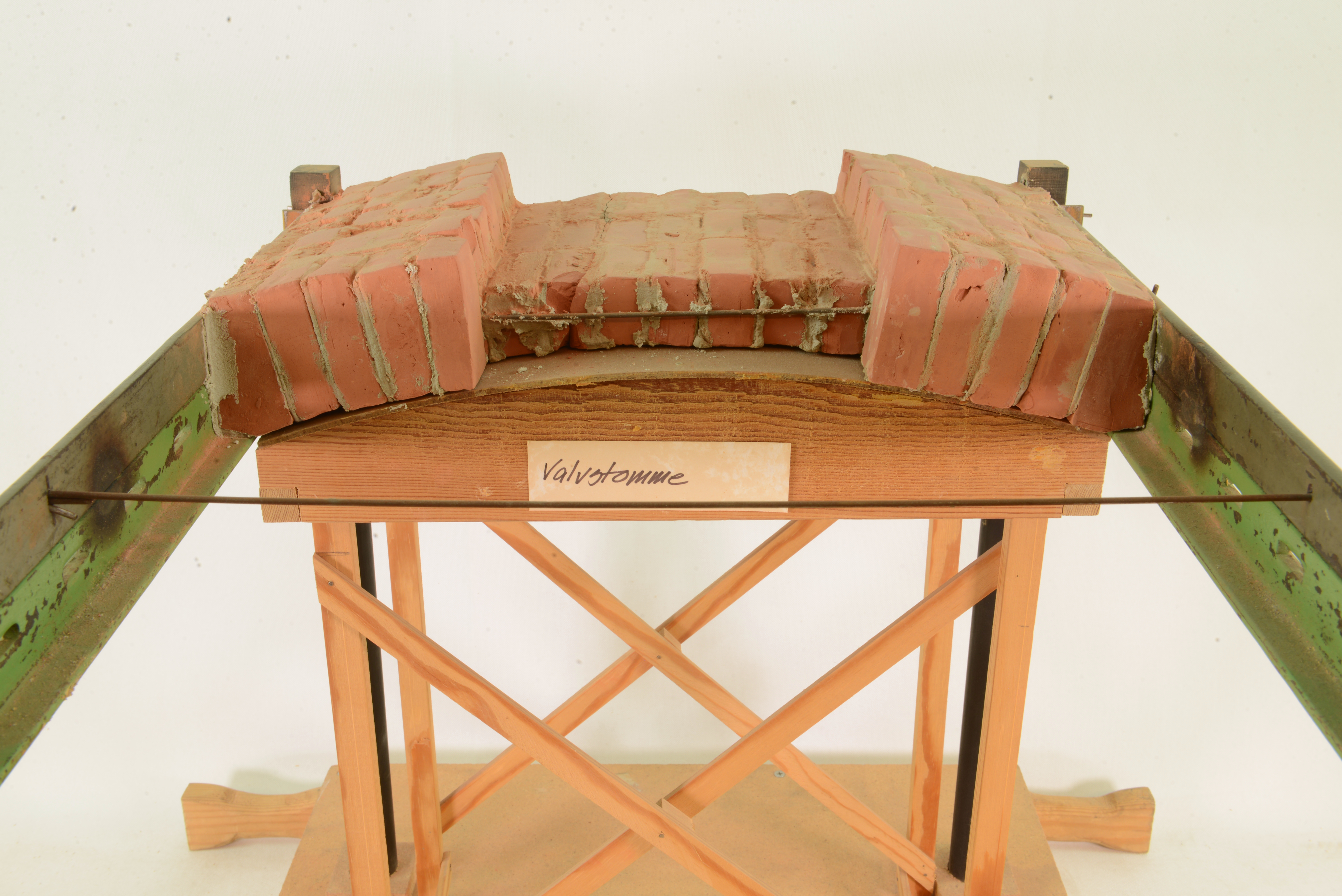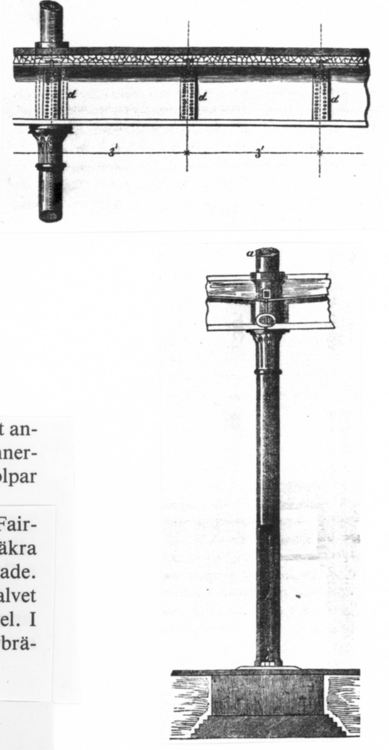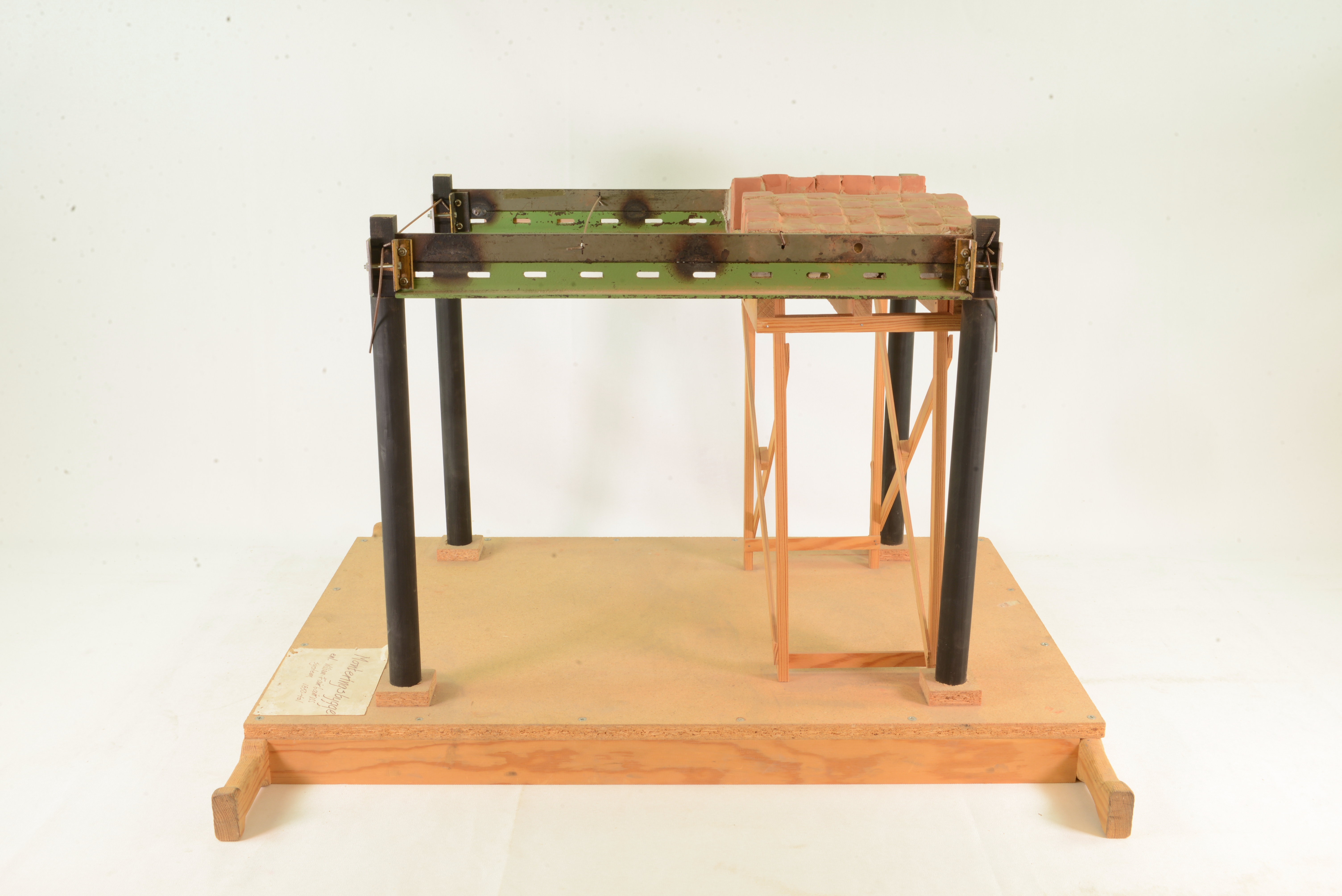 Från 1790-talet började gjutjärnskolonner alltmer att användas i fabriks- och magasinsbyggnader. Järnkolonnerna kunde bära mer och var brandsäkrare än trästolpar och de var mycket billigare än stenpelare. Modellen visar den engelske ingenjören William Fairbairns (1789-1874) byggnadssystem för brandsäkra bjälklag. Pelare och smidesjärnbalkar är hopnitade. Mellan balkarna ligger bågjärn, som håller upp takvalvet av järnplåt. Bjälklaget är fyllt med cement och tegel. I massan är träreglar fastgjutna och på dessa är golvbrädorna spikade.