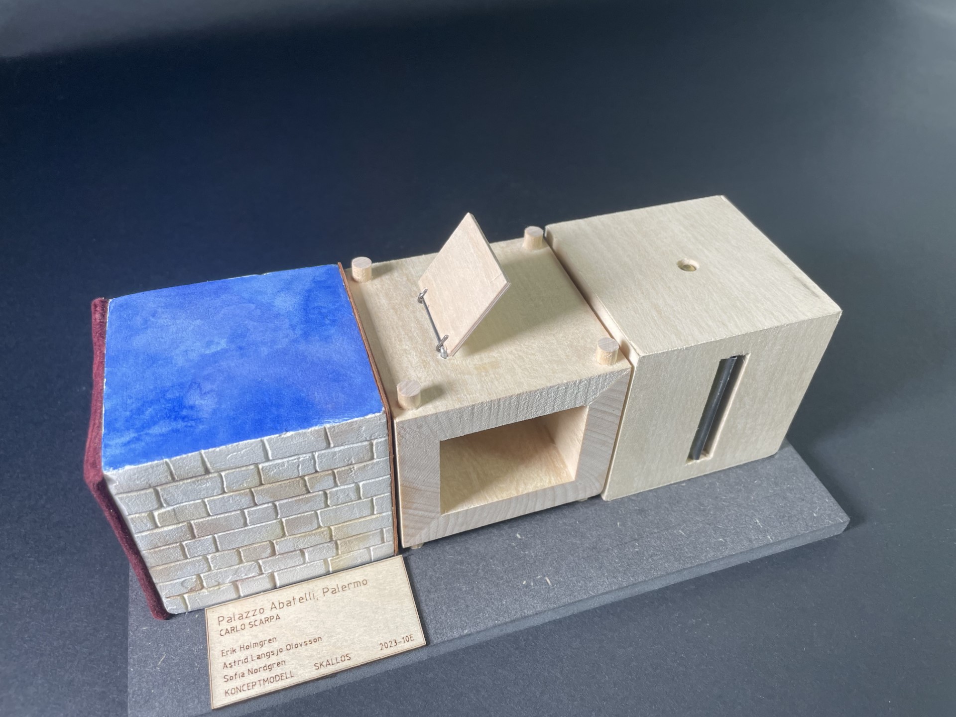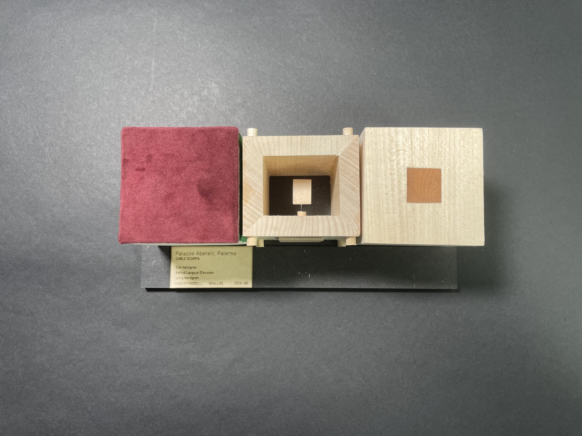 Klossar i trä utsmyckade med bland annat bly, mässing, stål, mörk fanér och tyg.