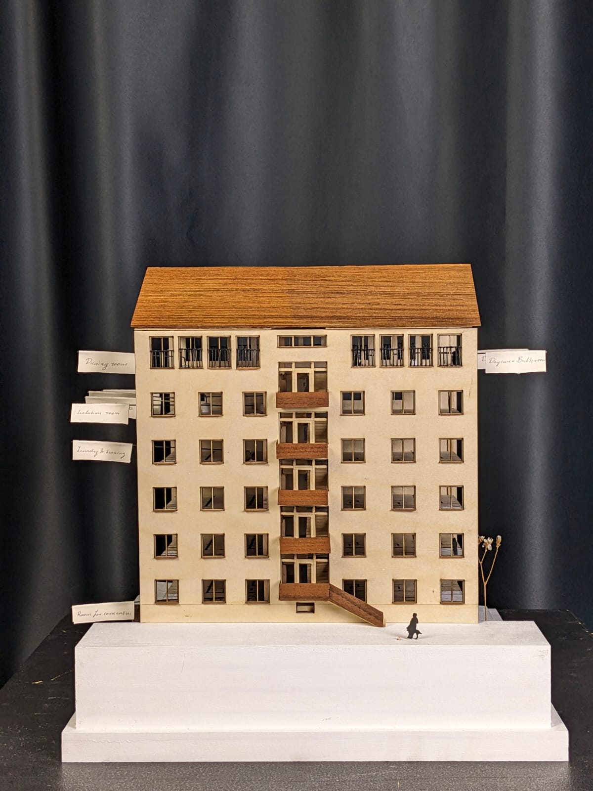 The building was made for single mothers, who could leave their children at the daycare on the top floor, when leaving for work during the day. Today, the building consists of housing and daycare.