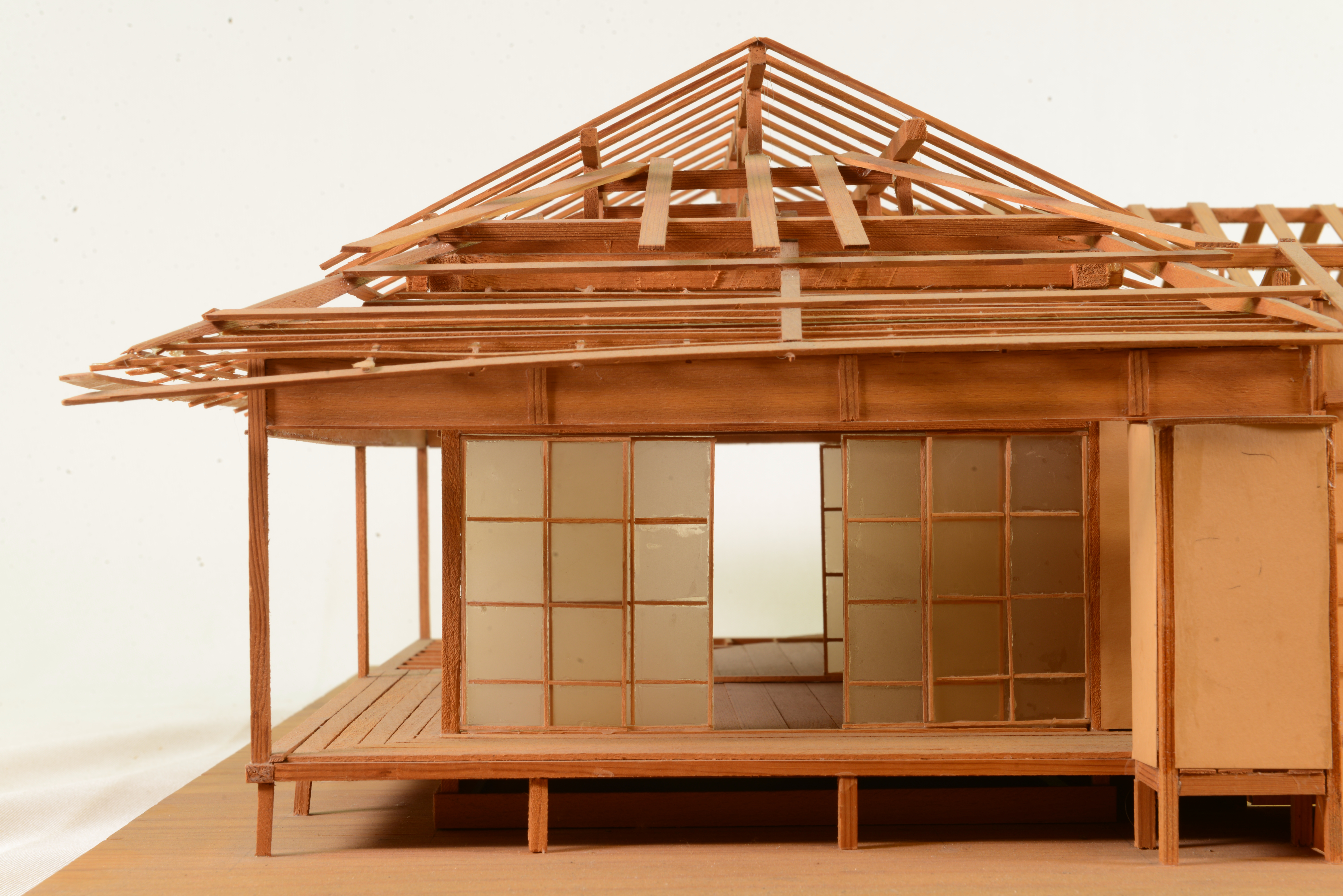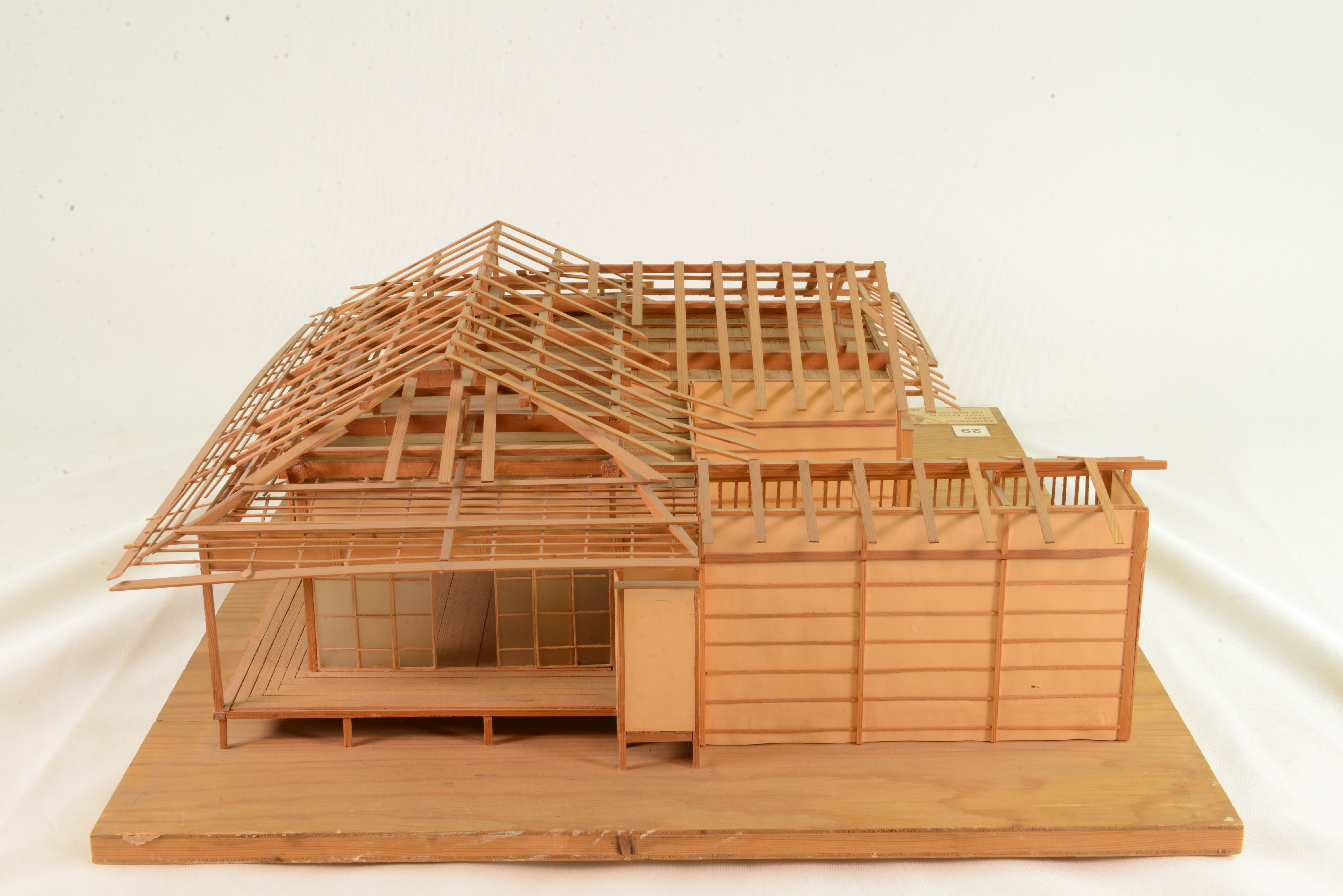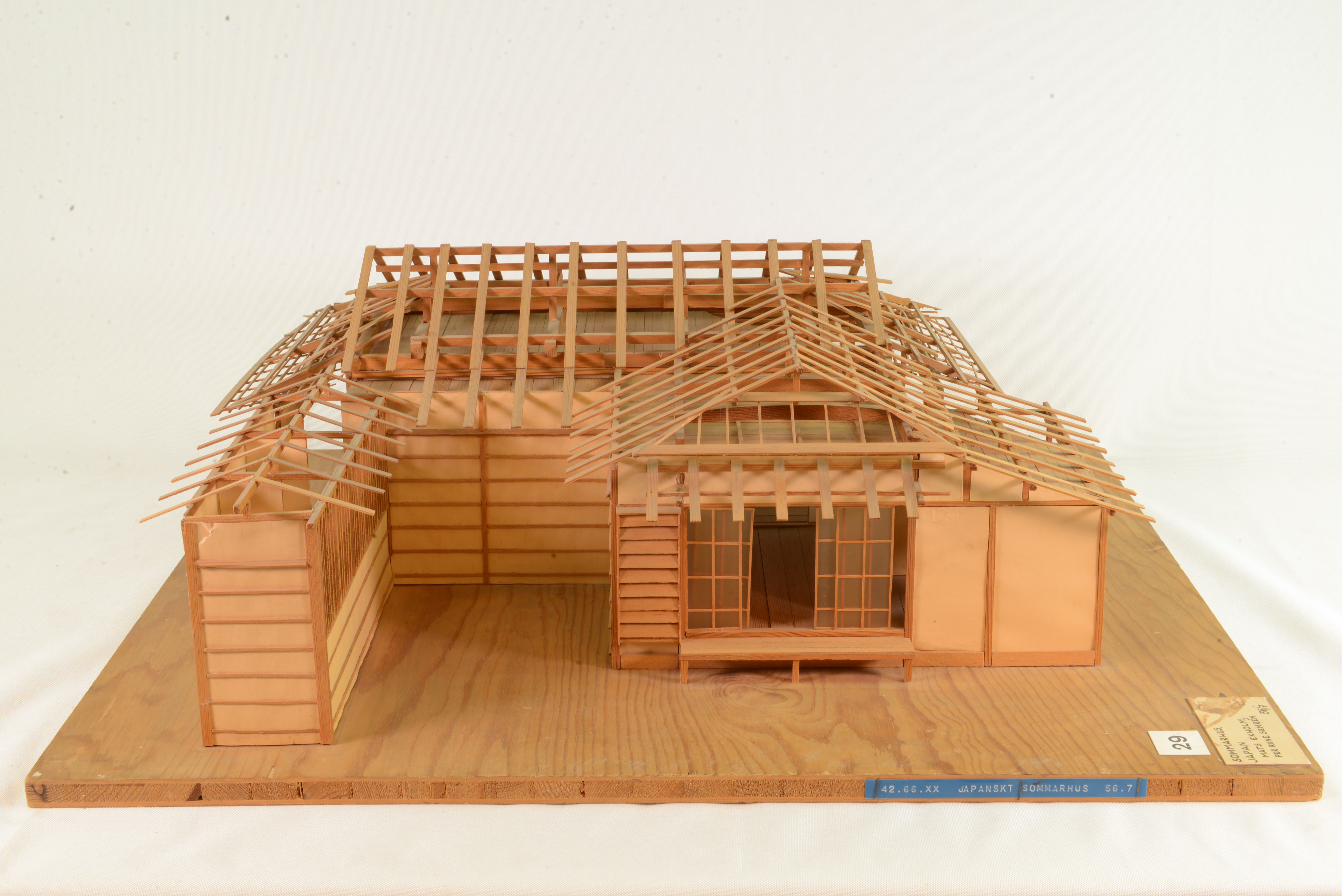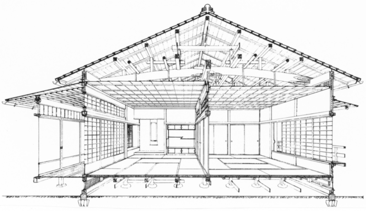 Det traditionella japanska huset är byggt av trä och sammanfogat med träförband. Stommen består av ett stolpverk med vågräta och lodräta träreglar och helt i avsaknad av snedsträvor och triangulära förbindningar. Golvet ligger 50-80 cm över mark. På plintar av trä , som står på flata stenar, ligger golvbjälkar och på dem reglar, på vilka golvbrädorna vilar. I bostadsrummen täcks golven av 6 cm tjocka mattor. De få fasta väggarna är lerklinade. Mellan väggstolparna flätas bambu, som bestryks med lera, armerad med hackad halm. De flesta väggar utgörs av skjutbara dörrar och fönster. Också takstolen är byggd av timmer, som fogats samman endast vågrätt och lodrätt. Ett naturligt snedväxt träd utgör huvudbjälke. Innertaket ligger på ribbor mellan väggarna. Se också modell 225.