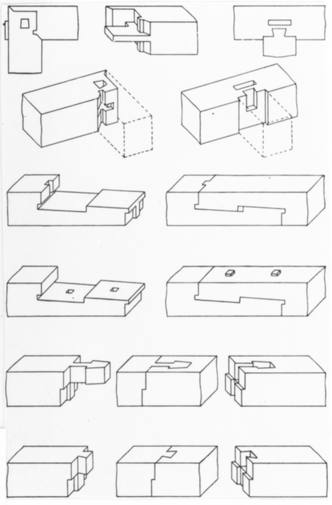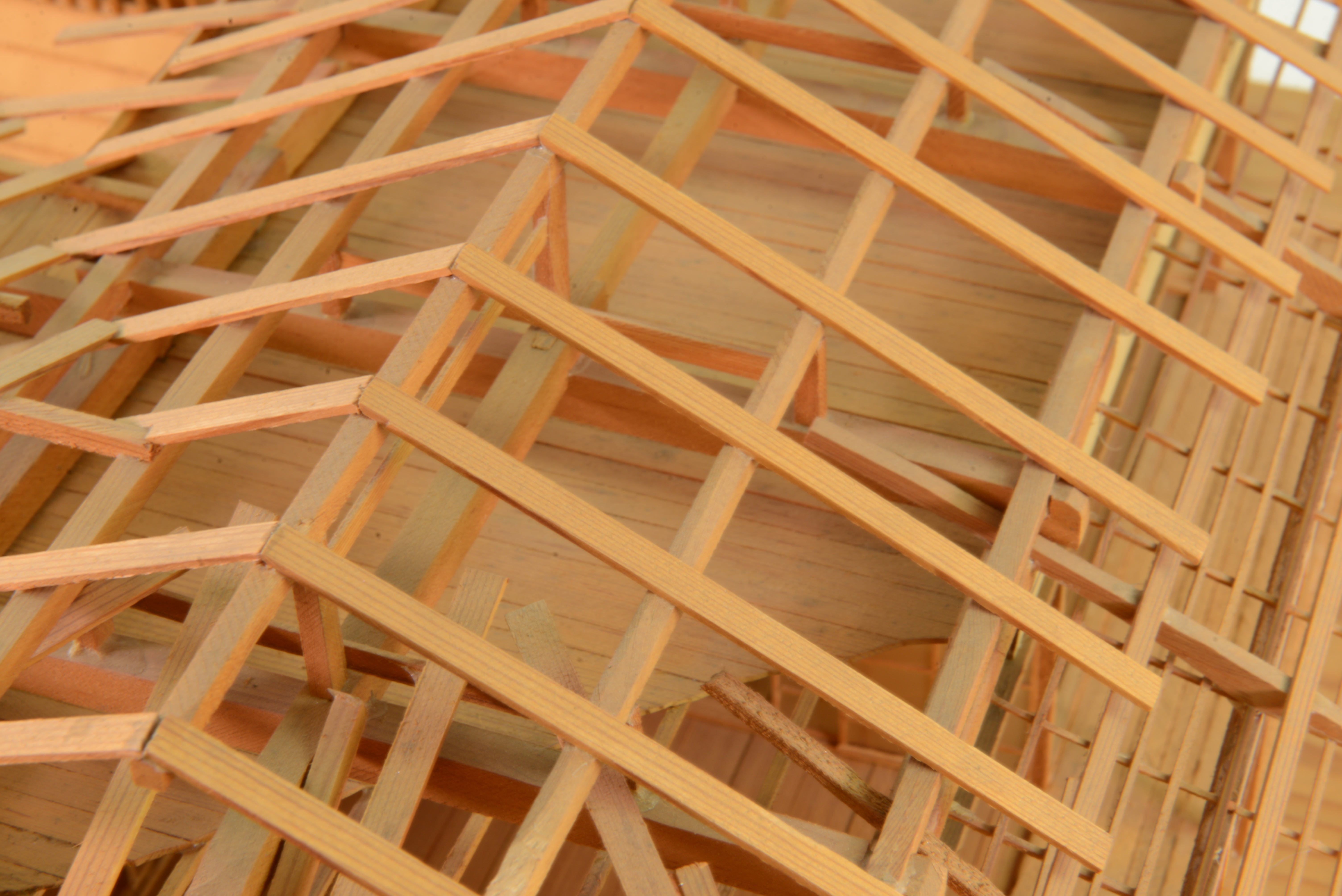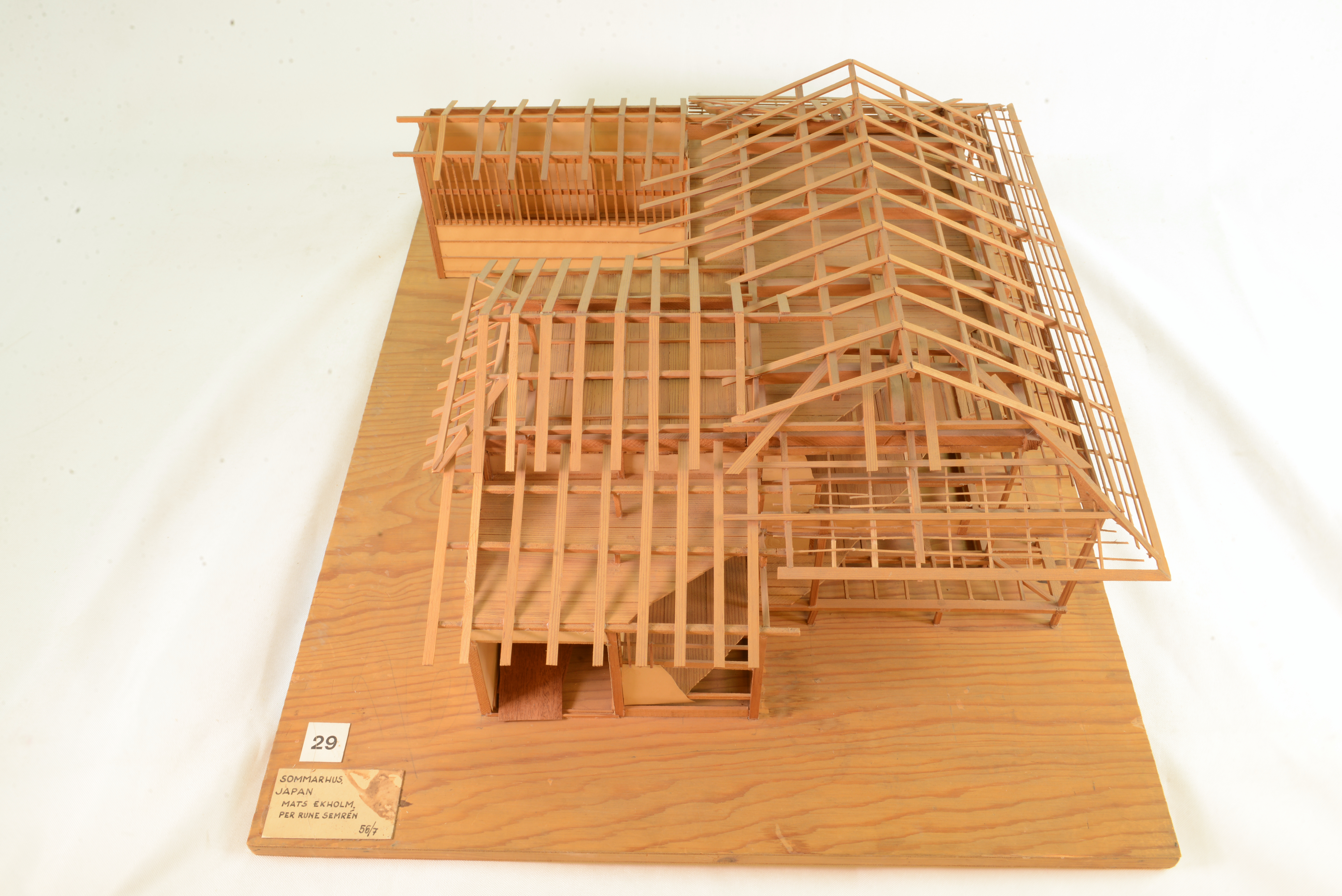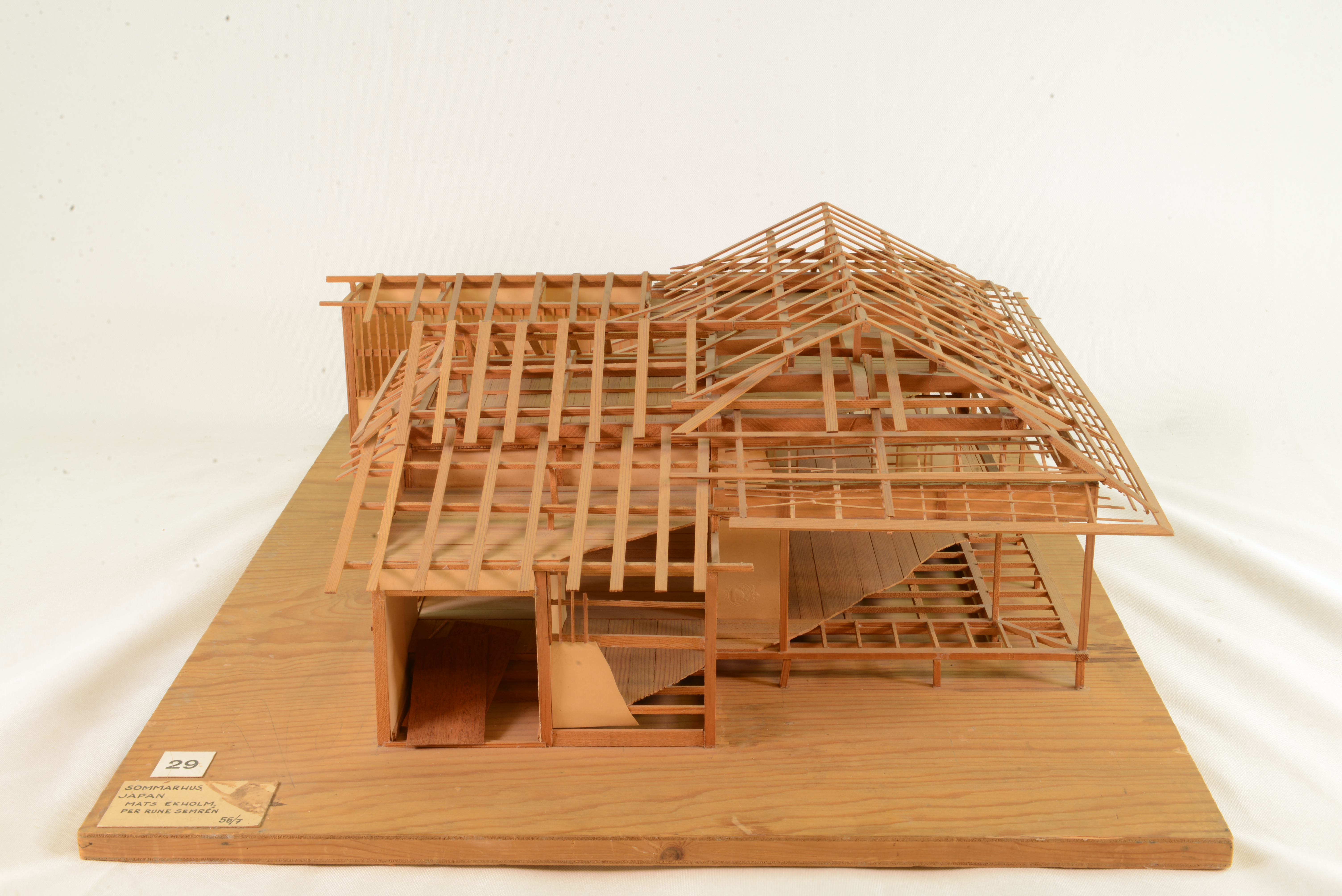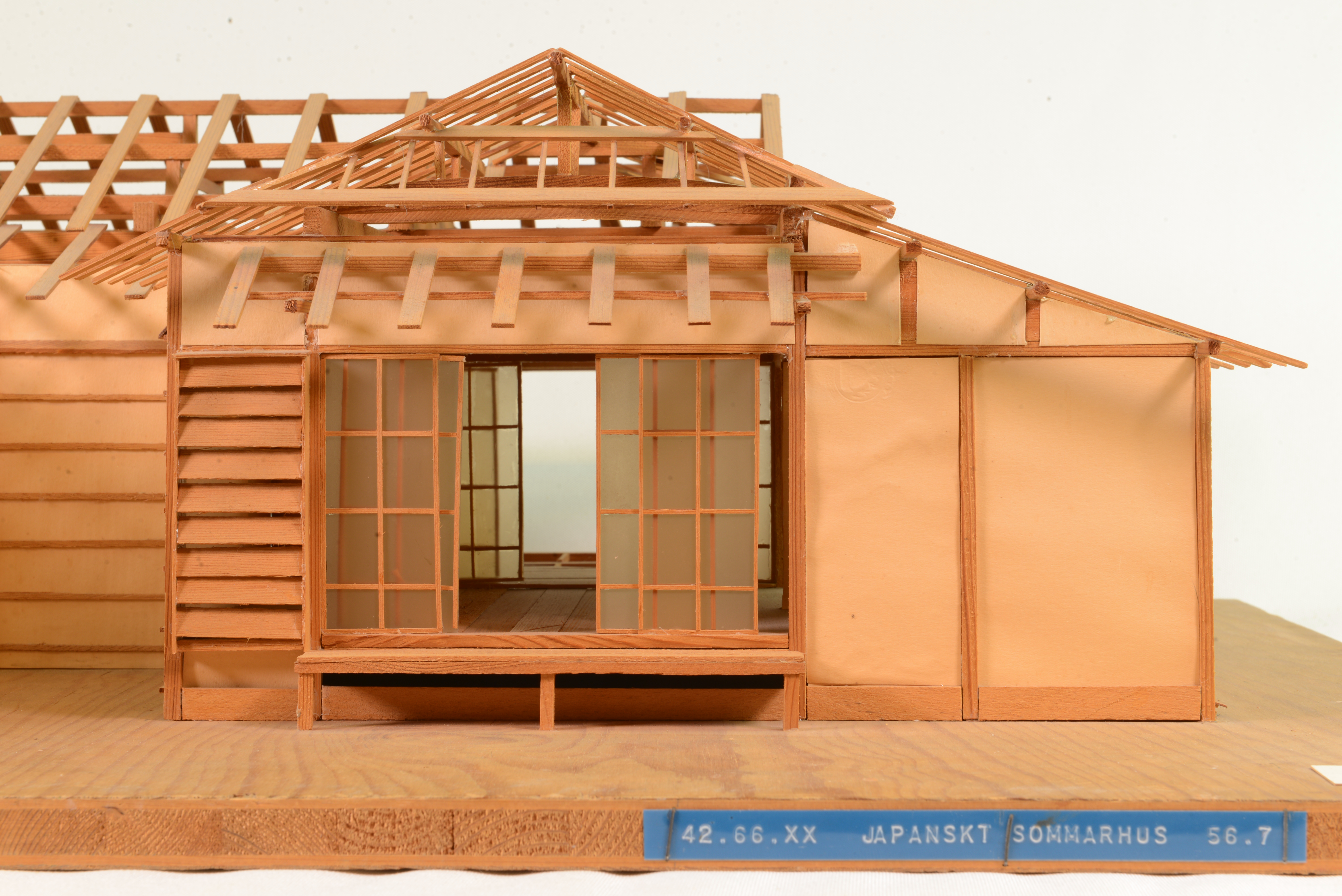 Det traditionella japanska huset är byggt av trä och sammanfogat med träförband. Stommen består av ett stolpverk med vågräta och lodräta träreglar och helt i avsaknad av snedsträvor och triangulära förbindningar. Golvet ligger 50-80 cm över mark. På plintar av trä , som står på flata stenar, ligger golvbjälkar och på dem reglar, på vilka golvbrädorna vilar. I bostadsrummen täcks golven av 6 cm tjocka mattor. De få fasta väggarna är lerklinade. Mellan väggstolparna flätas bambu, som bestryks med lera, armerad med hackad halm. De flesta väggar utgörs av skjutbara dörrar och fönster. Också takstolen är byggd av timmer, som fogats samman endast vågrätt och lodrätt. Ett naturligt snedväxt träd utgör huvudbjälke. Innertaket ligger på ribbor mellan väggarna. Se också modell 225.