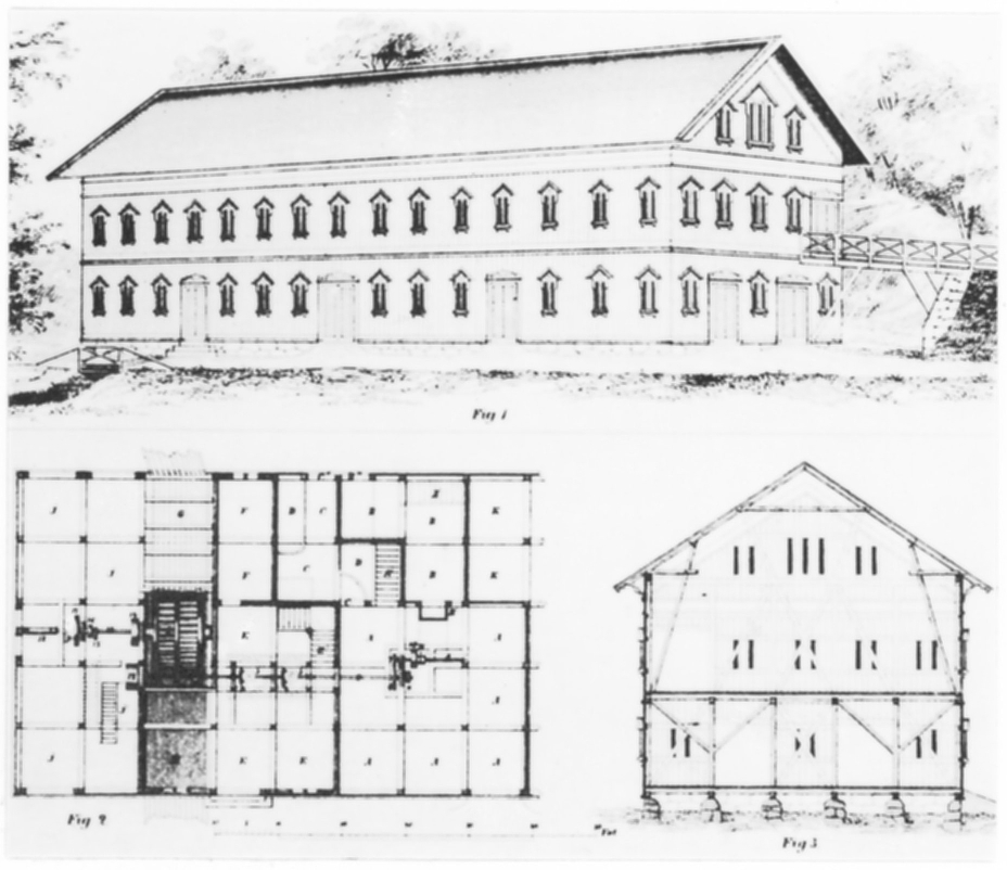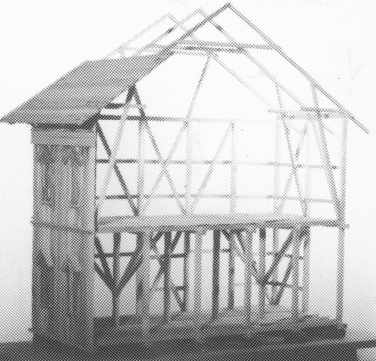 Modellen visar en byggnad från 1860-talet, som är uppförd i resvirkeskonstruktion. Bottenvåningen inrymmer bl a kvarn, såg och tröskverk, som drivs med vattenkraft. Övervåningen utgörs av ett enda rum för förvaring av säd.