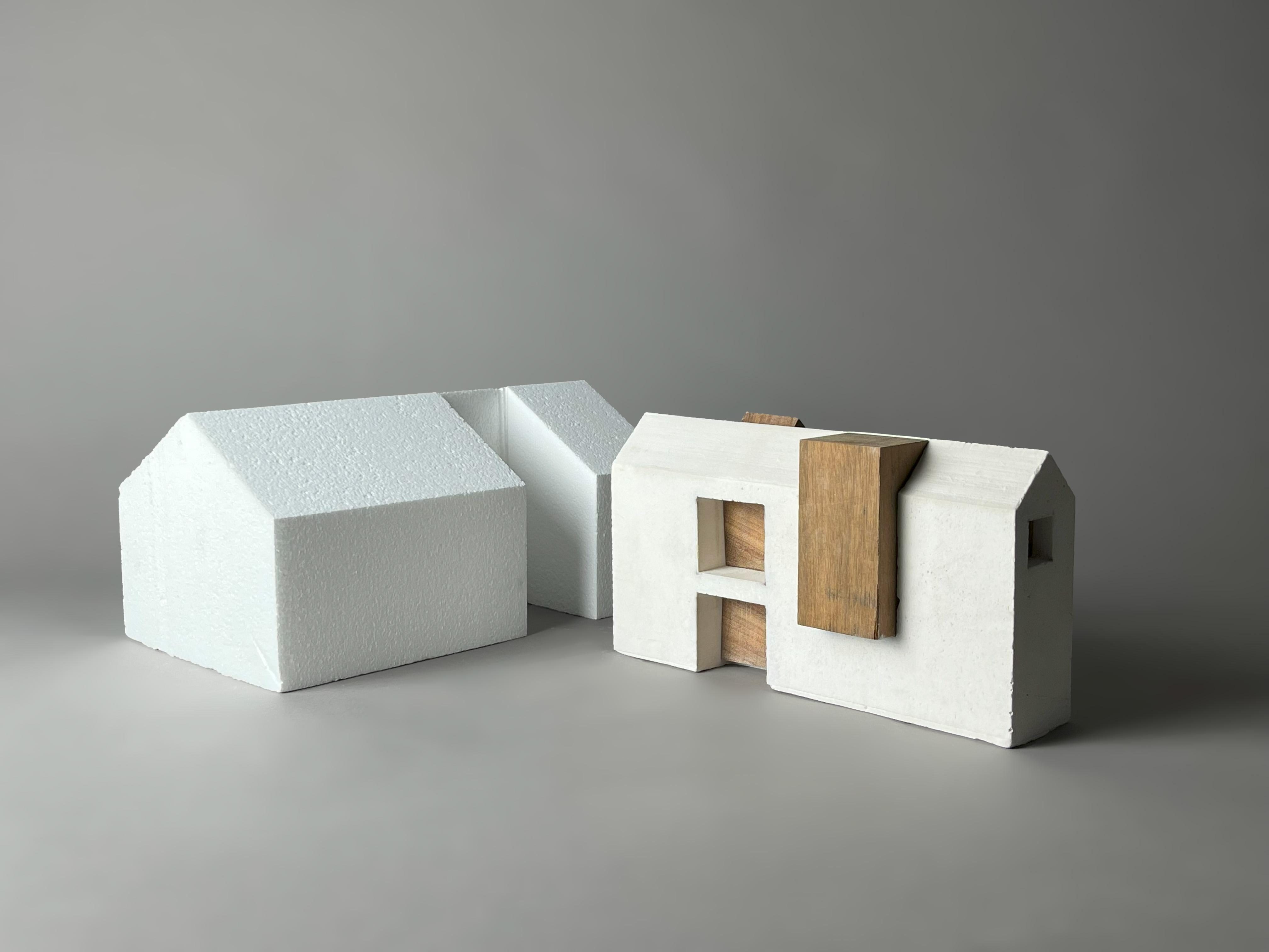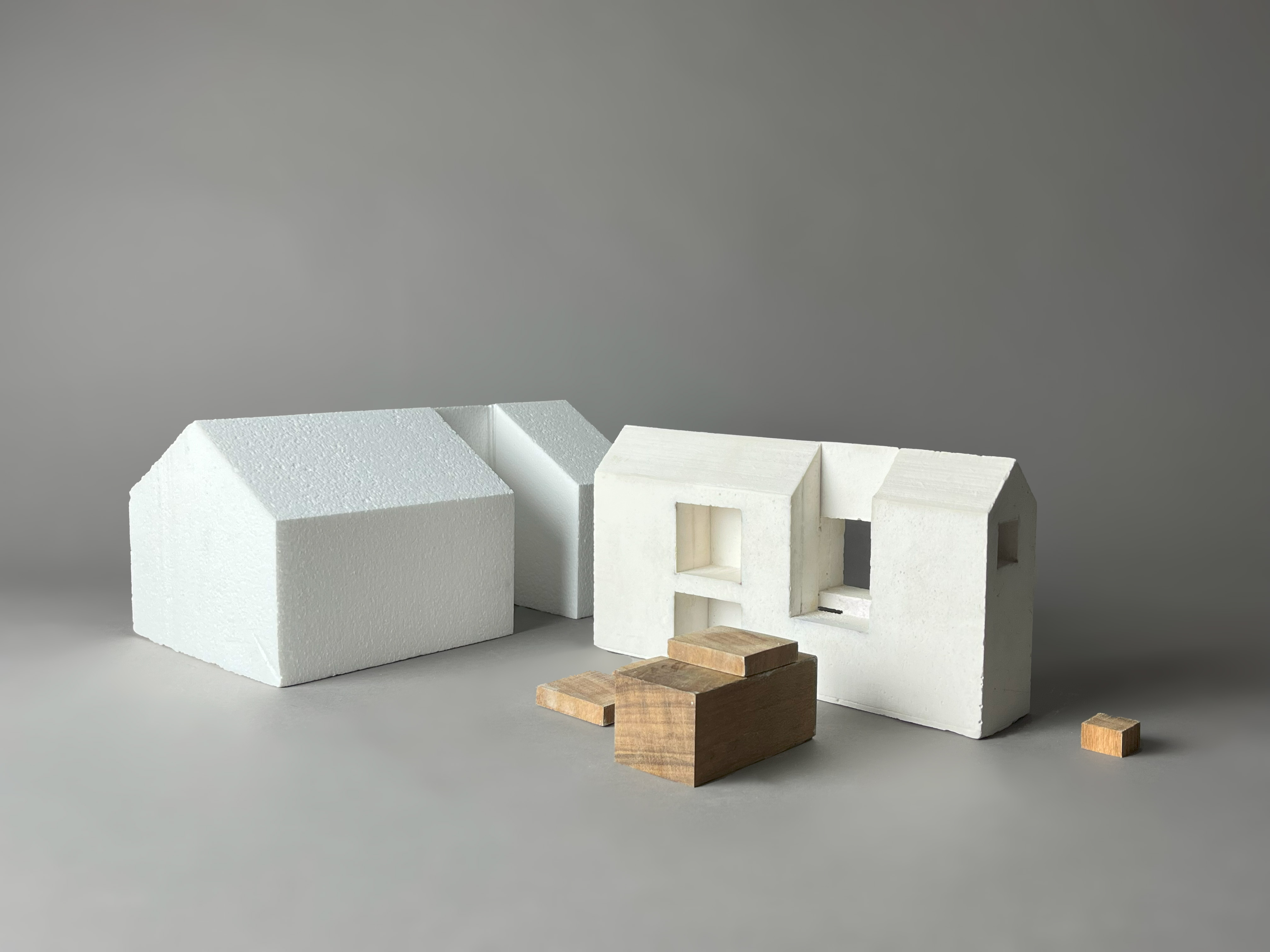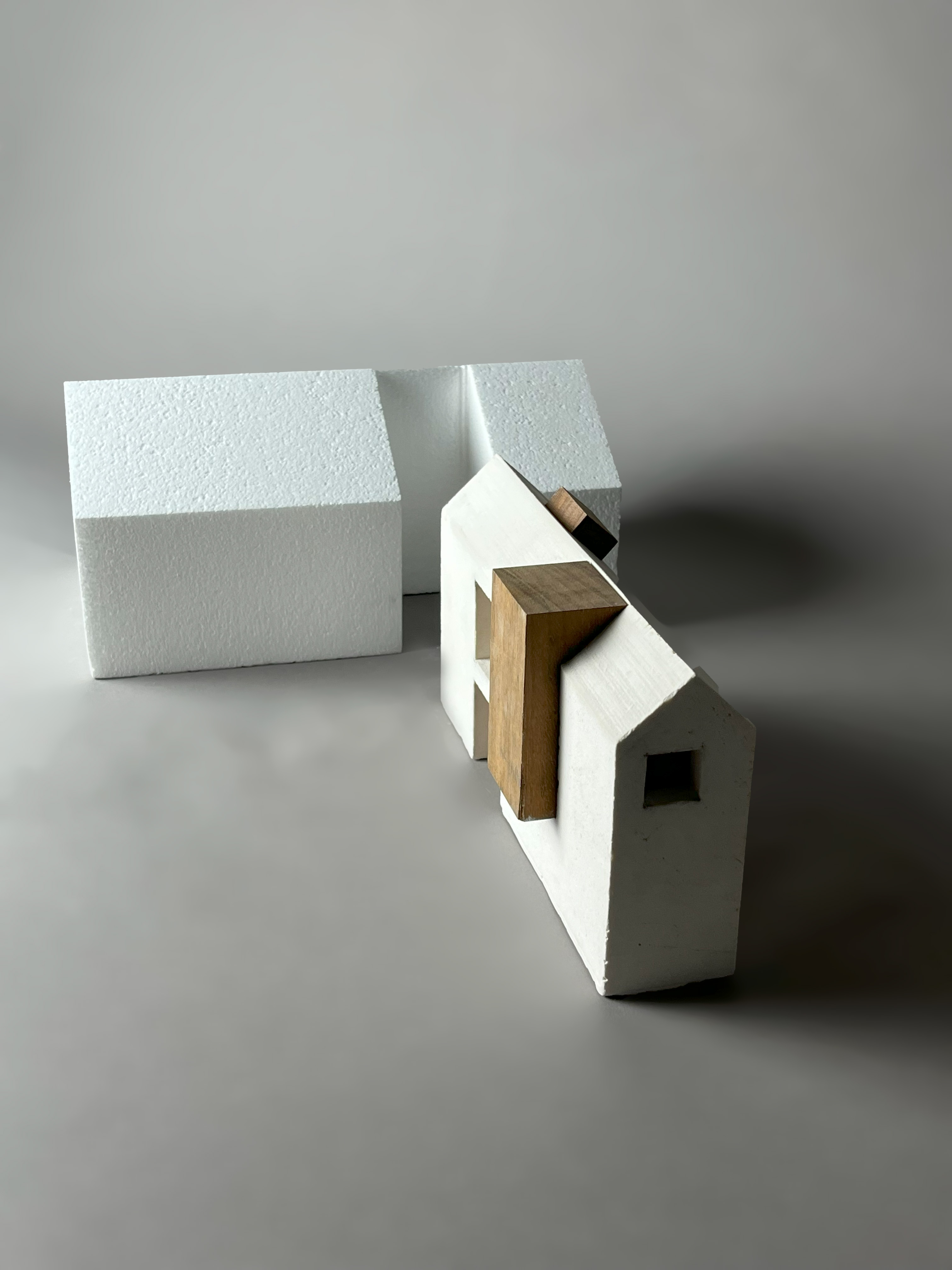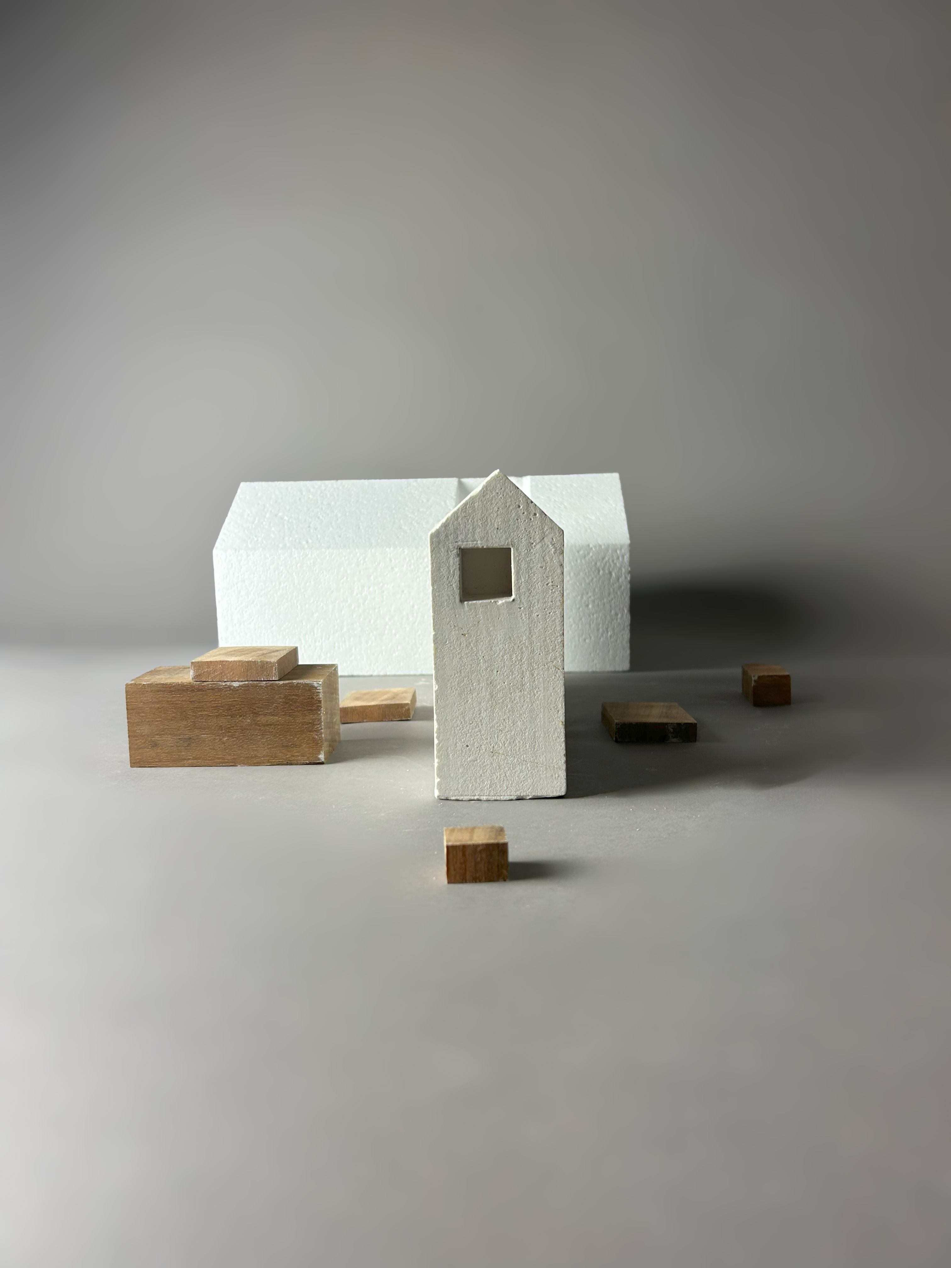 Orginalbyggnaden är i den här modellen förpassad till kulisserna som en abstraherad volym. Tillbyggnaden upplevs som mörkare och tyngre och står stadig och stark trots sin höga och långsmala figur. Tillbyggnaden är gestaltad som en del i ett pussel. Byggnadskroppen klossar smidigt in i originalbyggnaden och fasadens inskjutna och utkragande delar klossar in i öppningarna naturligt och självsäkert. Är man nyfiken och lyfter bort träklossarna kan man lära sig något om byggnadens rum.