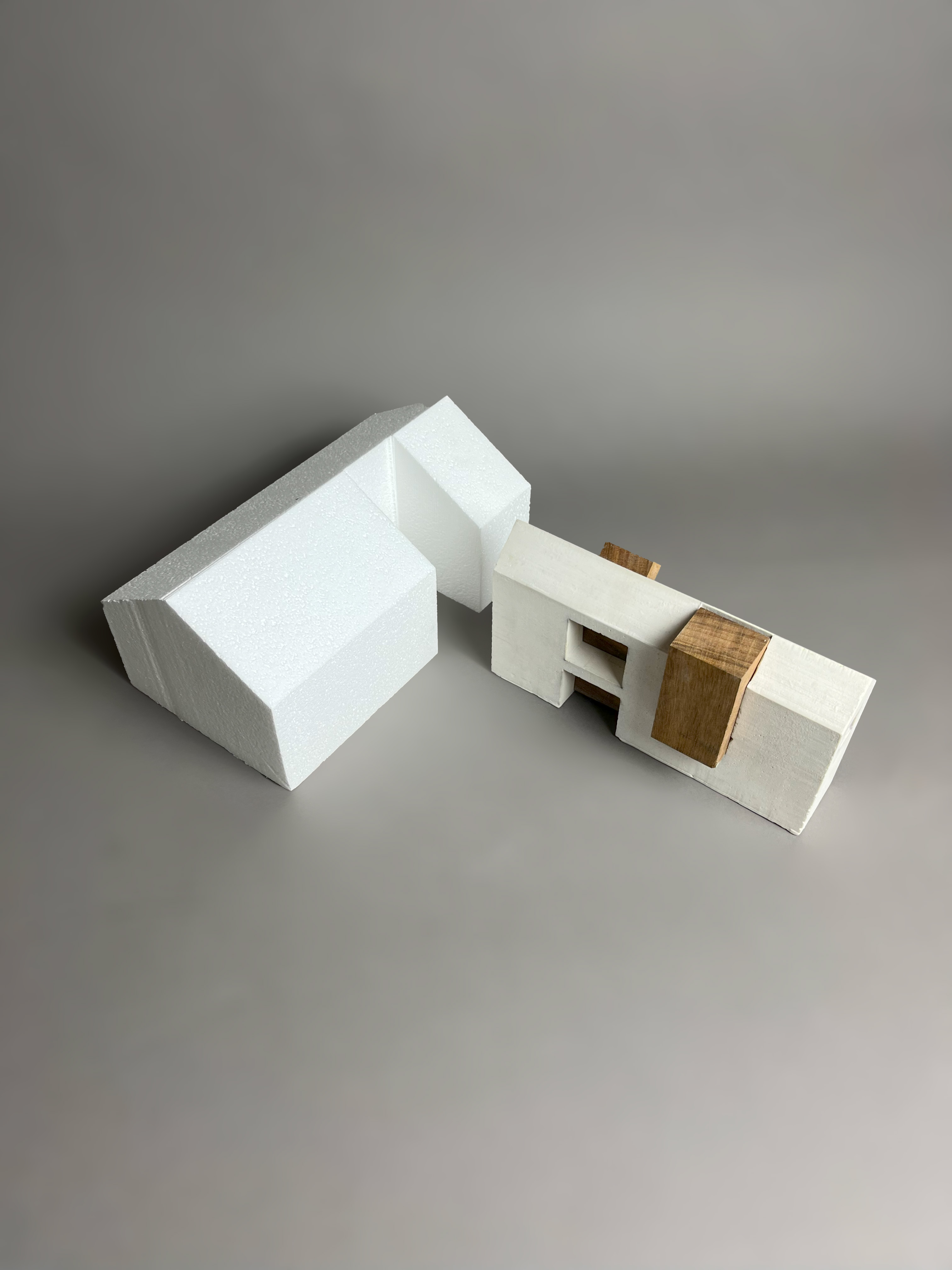 En översiktsmodell som visar tillbyggnadens känsla och sammanhang gentemot originalbyggnaden