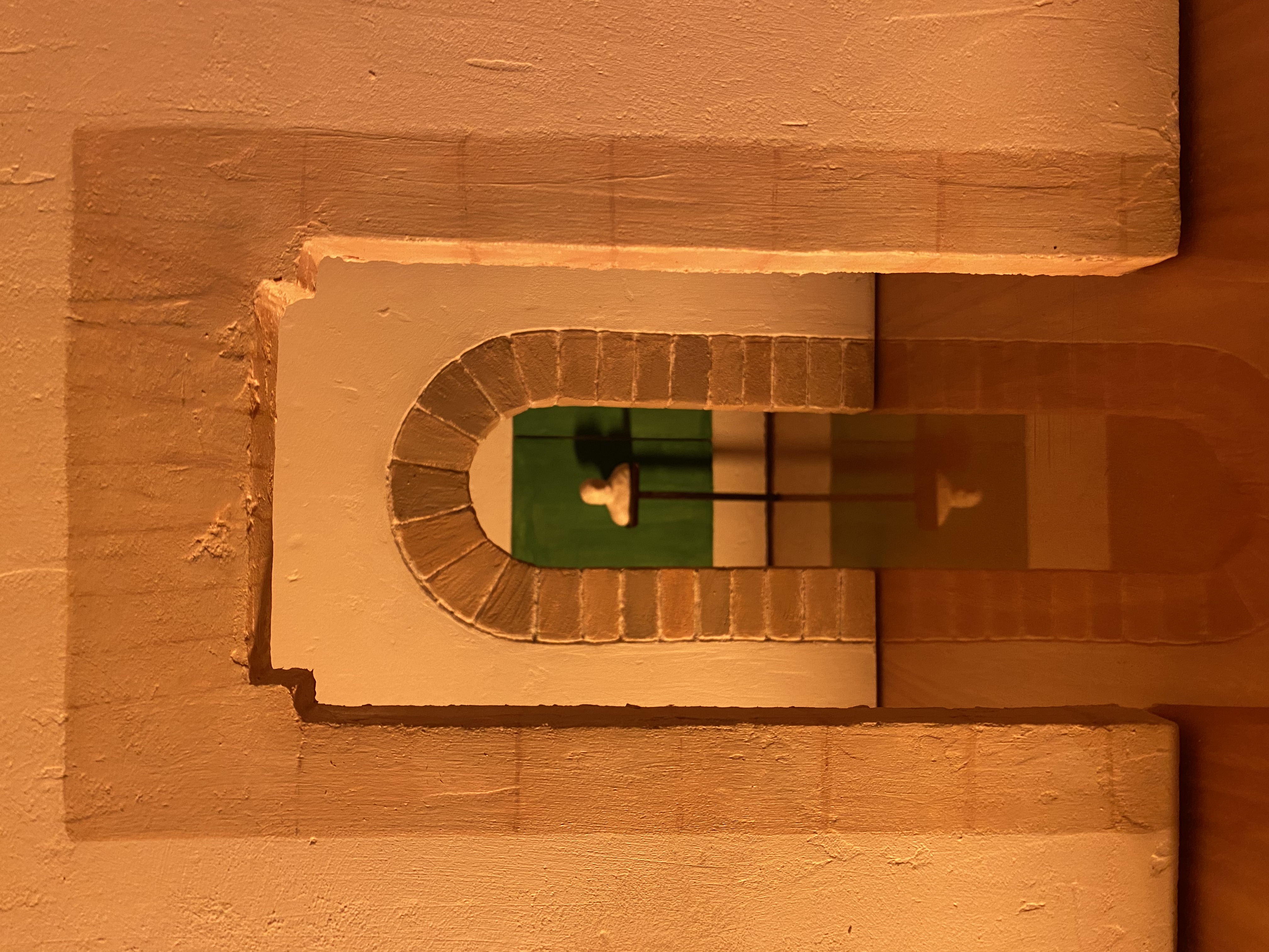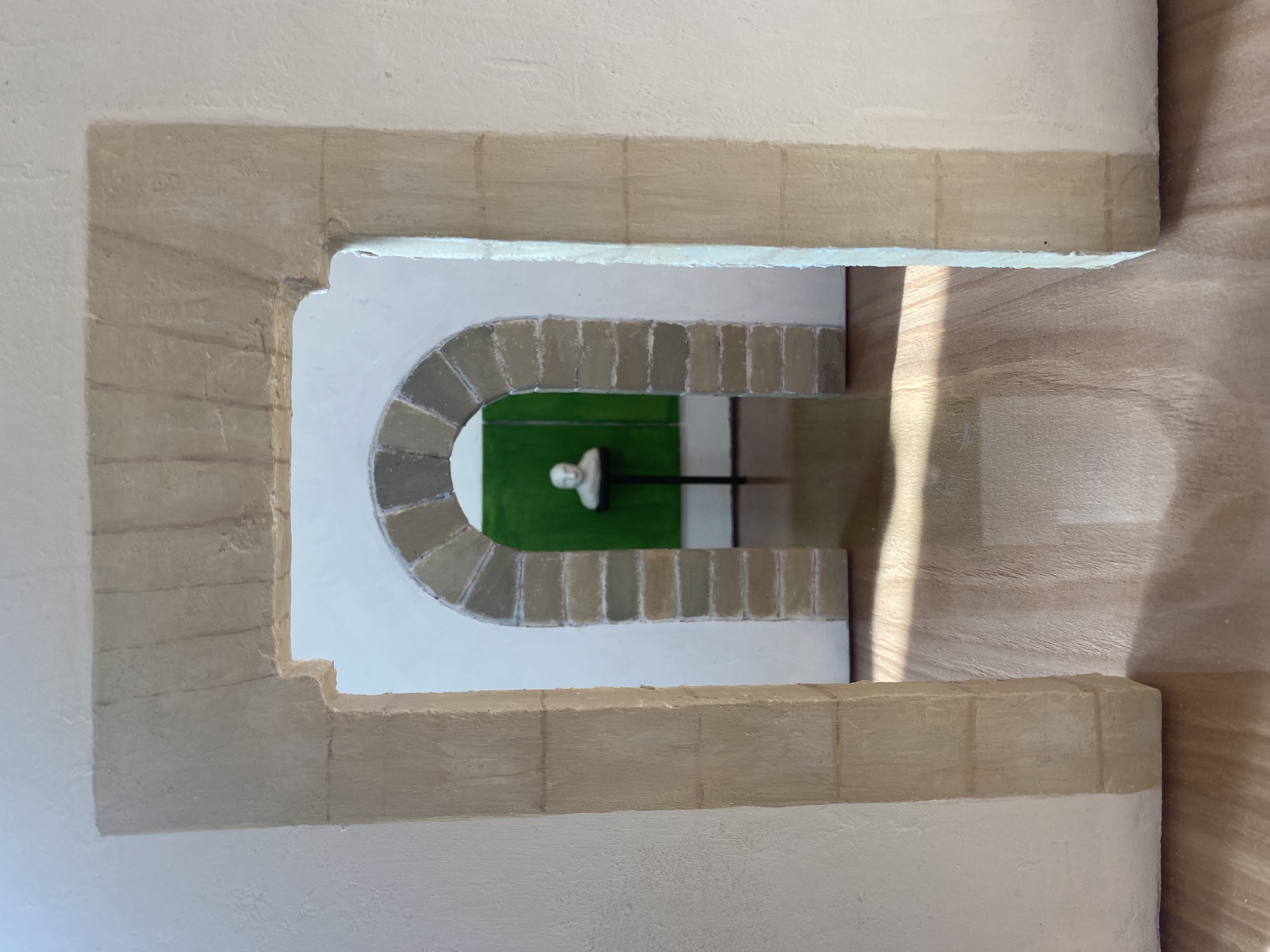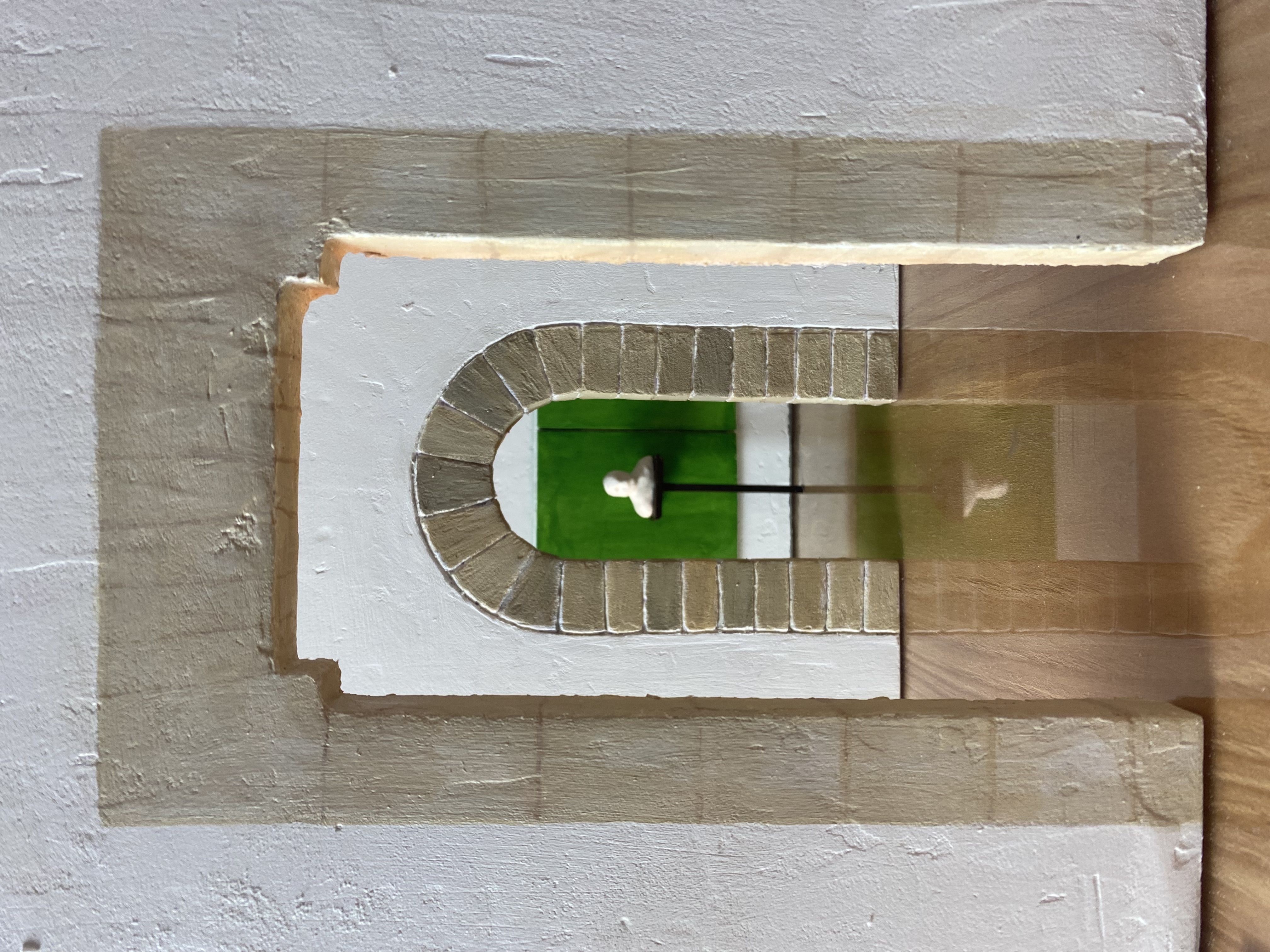 Spackel på foamboard, målad med akryl och akvarell. Basplatta i plywood, täckt med fanéer och transparent akrylskiva. Piedestal i målad trä och byst i vit modellera.