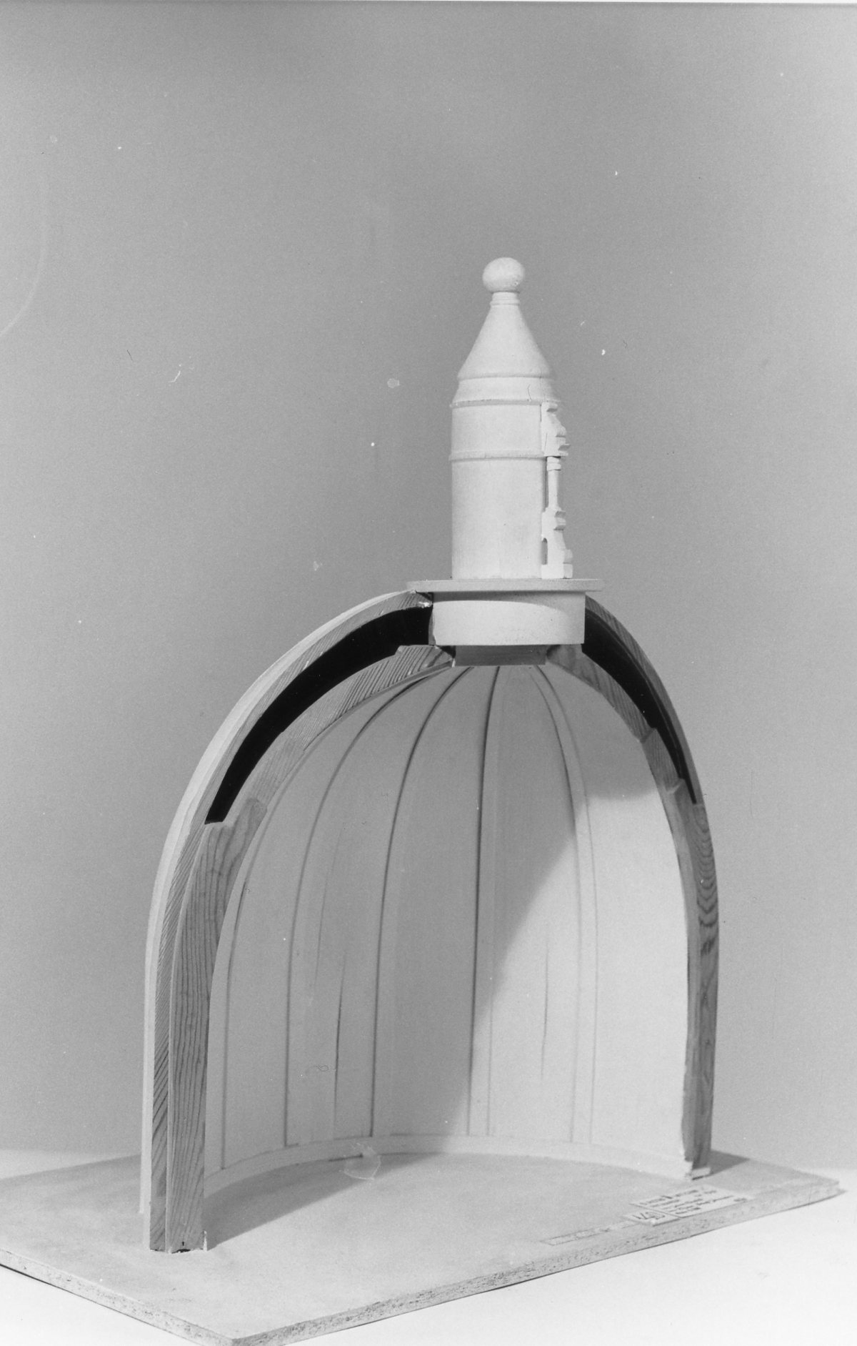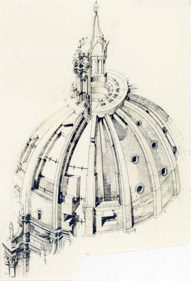 Kupolen över Peterskyrkan i Rom konstruerades av Michelangelo efter samma principer som Brunelleschi tillämpat i den stora kupolen över S Maria del Fiore i Florens (se modell 139). Kupolen delades in i segment av kraftiga ribbor från basens ring till en ring i kupolens hjässa. Mellan ribborna utgjordes kupolen av dubbla kappor. Sidotrycket togs upp i tre järnband, som omslöt kupolen på olika höjd. Särskilda byggnadsställningar uppfanns för bygget. De blev nästan lika berömda som själva kupolen. Se också modell 264.