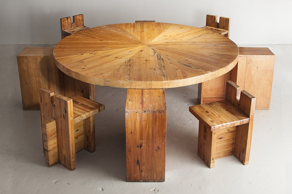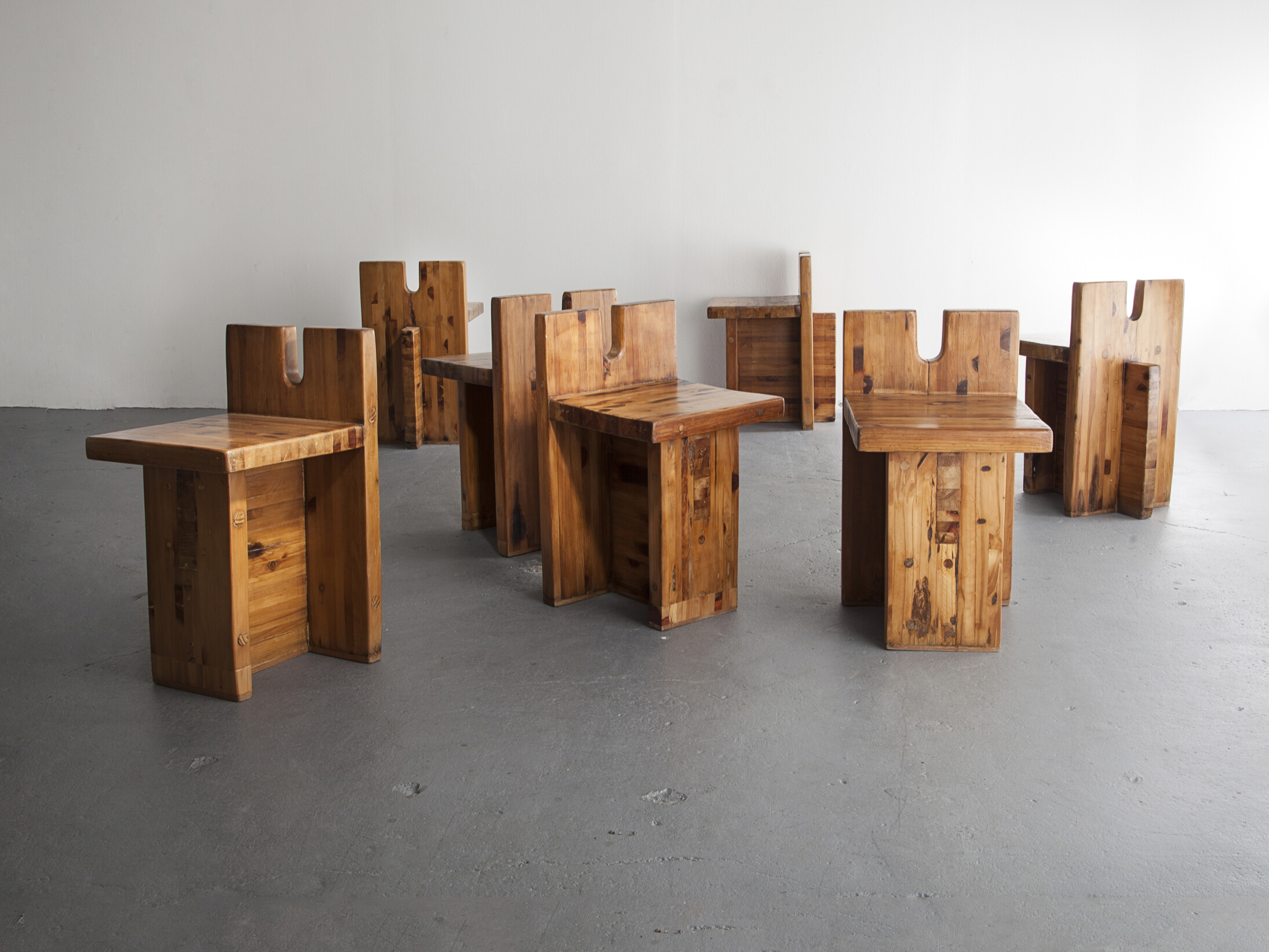 Pallen är uppbyggd av limmade lameller (dim 1x2 tum), runda plugg och kilade element. Möblerna är gjorda av olikfärgad massiv furu, som med år av användning får en fantastisk patina som gör varje objekt unikt.