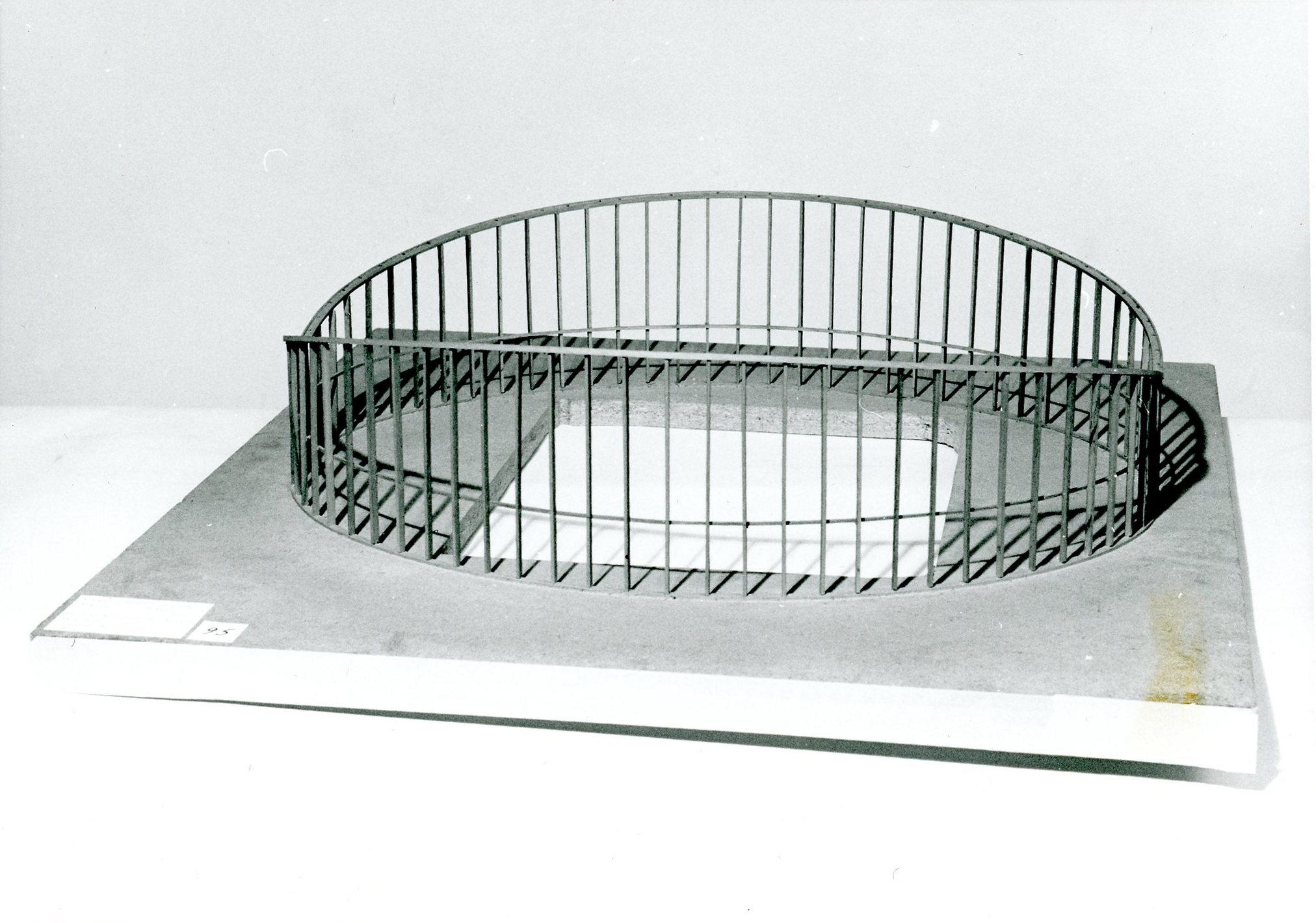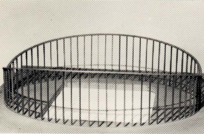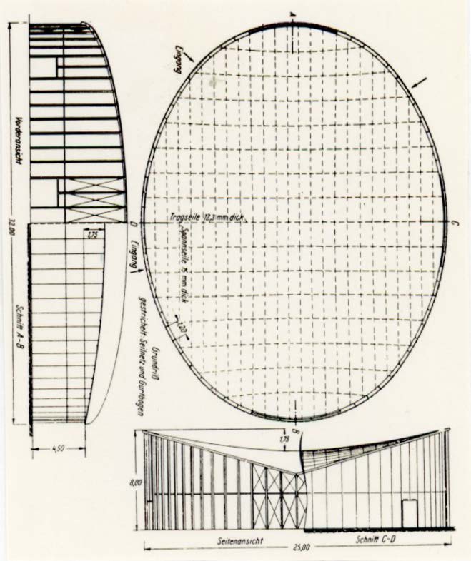 Till industriutställningen i Berlin 1952 ritade arkitekt H. Stettbacher och konstruktören H. Osterwald den schweiziska paviljongen. Det var en flyttbar byggnad av trä med tak av hängtakskonstruktion. Väggstolpar av trä bar två snedställda limträbågar, i vilka de förspända linorna fästes. Tak och väggar var täckta med tyg. Hela paviljongen kunde plockas isär i lättrransportabla delar. Idén till bygget kom troligen från den samtida Raleigh-arenan, som var den första byggnad där den nya konstruktionsprincipen med hängande tak utnyttjades.