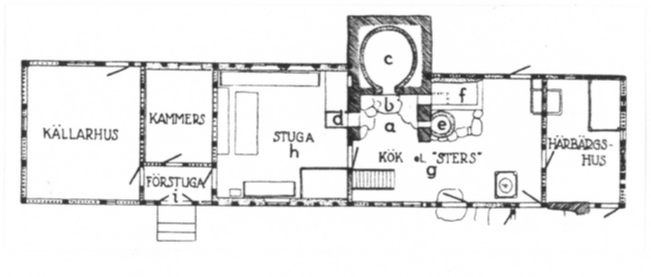 Modellen visar gårdens boningslänga, som var sammanbyggd med loglängor och fähus kring en stenlagd gårdsplan. Mitt i längan, till höger om förstugan, ligger vardagsstugan och innanför den köket med en öppen skorsten. Till skorstenen är en sättugn för stugans uppvärmning, en brygghusgryta och en malttorka anslutna. I övrigt finns en liten kammare med skrivpulpet och kistekammare för förvaring av textilier.Gården fanns på Skansen sedan 1912, men förstördes av brand 1972. Se också modell 61.