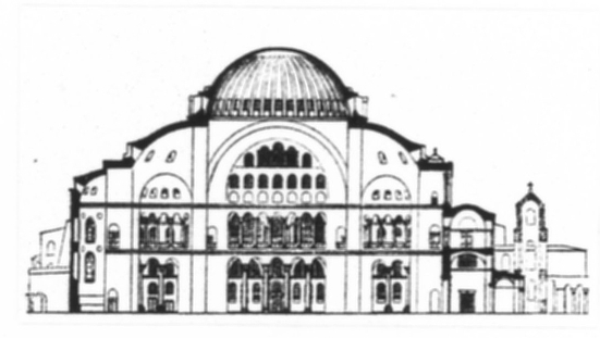 På 530-talet lät kejsar Justianus bygga den imponerande kyrkan Hagia Sofia. Arkitekter Var Isidor från Miletos och Anthemius från Tralles. Väggarna är uppbrutna med sidoskepp, kolonnader och gallerier, som reser sig mot den väldiga kupolen, som tycks sväva över det kvadratiska rummet. Fyra bågar på massiva pelare tar emellertid upp tyngden från tegelkupolen, som strävas av 40 ribbor. Trycket tas upp av kraftiga strävpelare och via halvkupolerna i öster och väster i ytterligare valv och pelare.