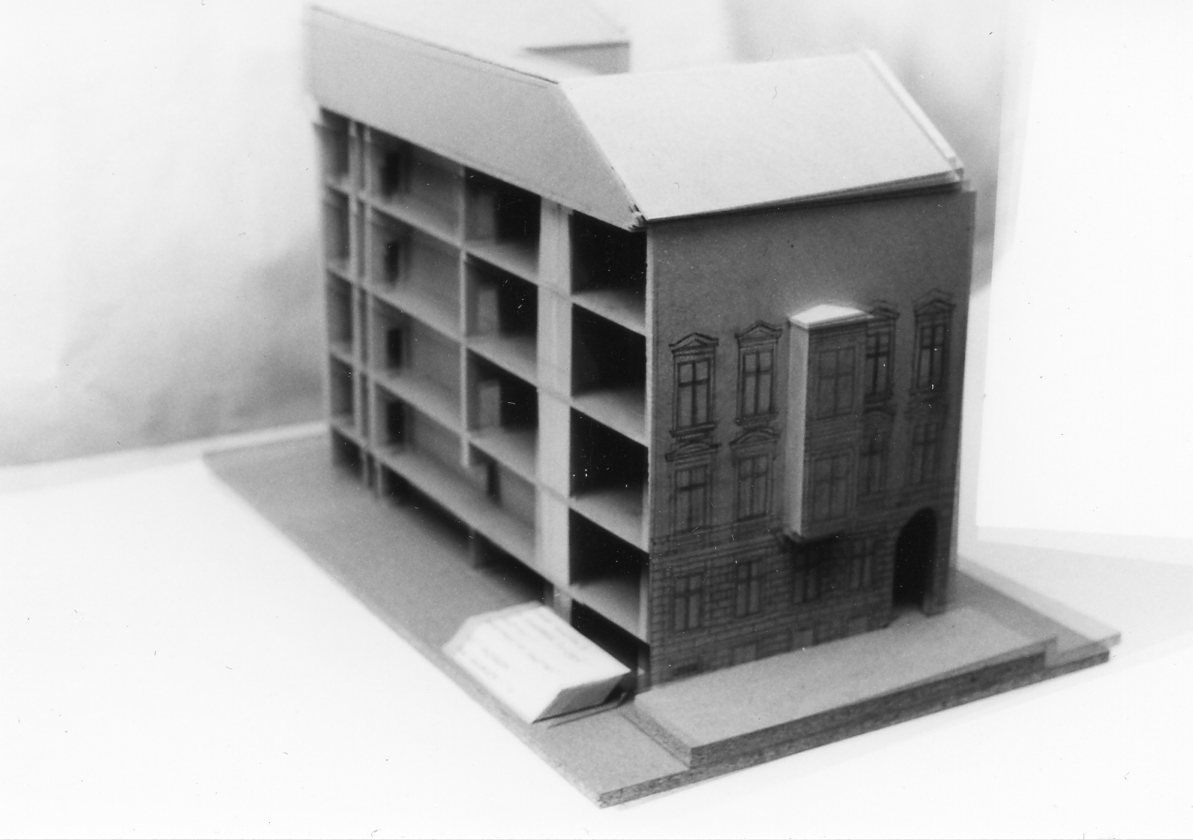 Modellen visar hur fastigheten vid Vasagatan 20 i Göteborg bebyggts. Tomten är som i de flesta högexploaterade städer smal och djup och ger utrymme för en smal gård, som nås av en i fasaden sidoställd portal. Fastigheten bebyggdes 1878 i samband med att man började ta marken utanför vallarna i anspråk för bebyggelse. Mot gatan står ett representationsmässigt stenhus (putsat tegel) i nyrenässans. Det har fyra våningar och är försett med ett burspråk och kraftfullt markerade fönsteromfattningar i 2:a och 3:e våningarna. Som brukligt för den klassicerande arkitekturen är bottenvåningen kraftigt rusticerad och översta våningen lägre än de övriga.