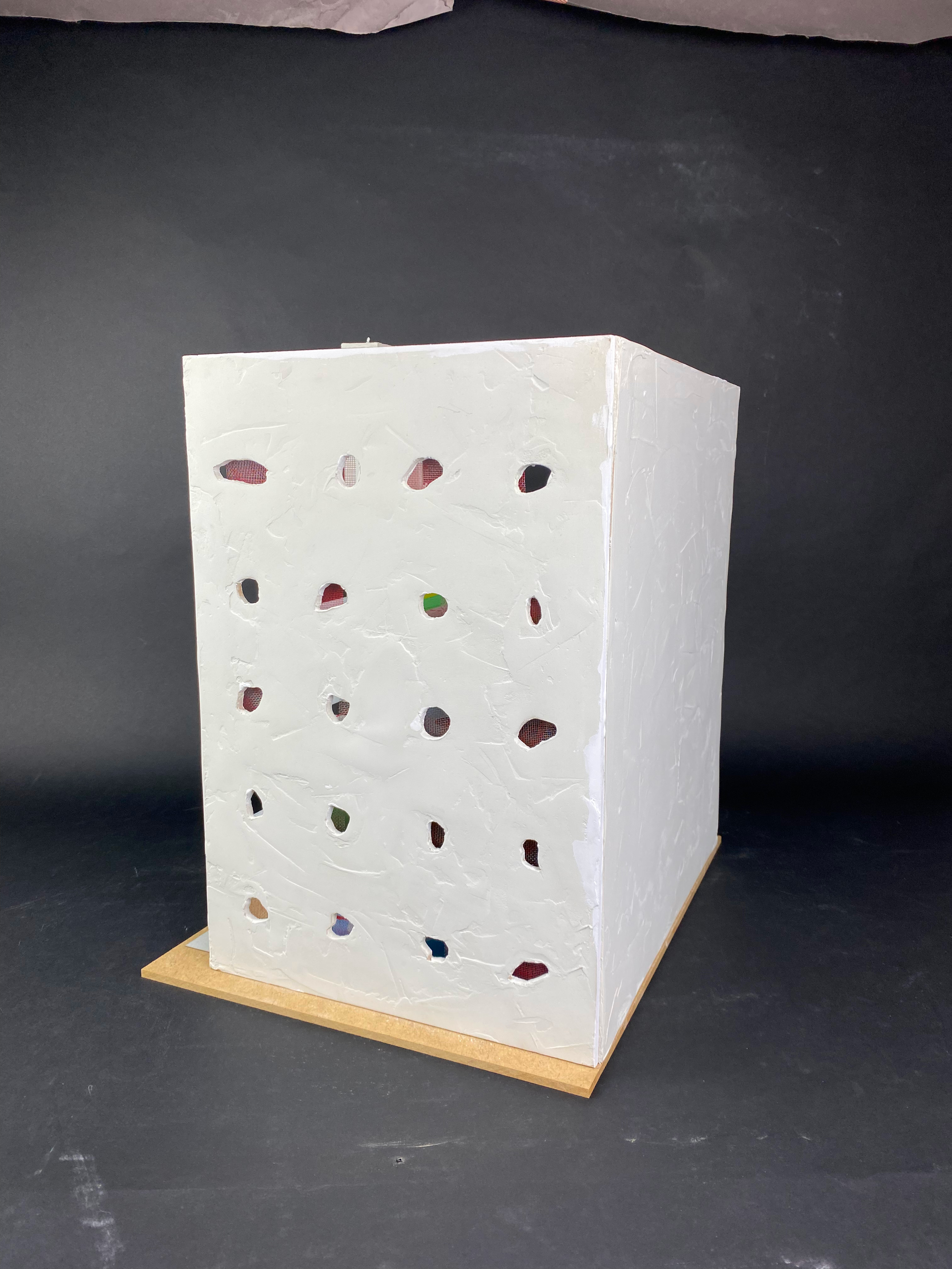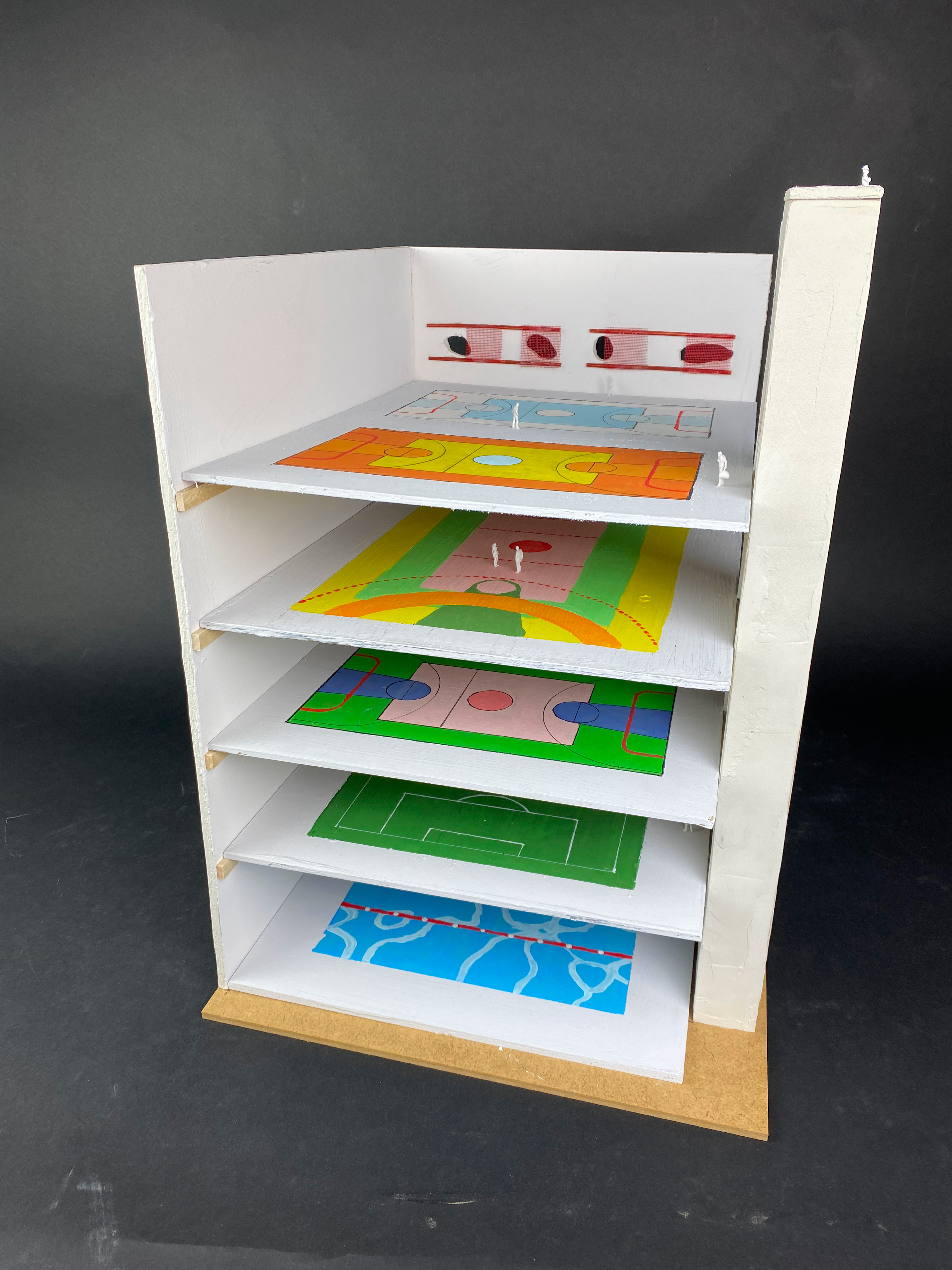 SESC POMPEIA, SEKTION Modell i skala 1:100 AV: Lina Bo Bardi, Marcelo Ferraz och Marcelo Suzuki FÖR: SESC Pompeia I: São Paulo, Brasilien, 1980. PRODUKTIONSÅR: 1980-1989 MÅTT: Byggnadsdelen som modellen visar är cirka 45 meter hög 40 meter lång 30 meter djup VAD: Sektionen visar på hur ett av de två “tornen” utgörs av sporthallar och tillhörande delar staplade på varandra. När byggnadsdelen öppnas upp i ett snitt blir kontrasterna mellan insida och utsida tydliga, den grå betongen mot den sprudlande färgsatta insidan. Bryggan mellan ut- och insida utgörs av hålrummen till fönster i organiska former med sina röda detaljer, vilka talar om att det finns något unikt att förvänta sig. Denna kontrast talar även för kontrasten i arkitektens sätt att arbeta: den totala kontrollen mot det lekfulla. HUR: Modellen är byggd i MDF-skivor där den yttre sidan är spacklad för att efterlikna betong. På insidan är våningsplanen målade i akryl efter den verkliga färgsättningen, förutom ett plan som istället illustrerar en process-skiss av arkitekten själv. VARFÖR: Skalan för modellen passar bra då den tillåter en överblick över byggnadsdelen, men även ger möjlighet att illustrera en lagom mängd detaljer. Material, färgsättningar och formgivning är de delar som modellen skall visa på, och vi ansåg att alla dessa presenteras på ett bra sätt i modellens storlek.