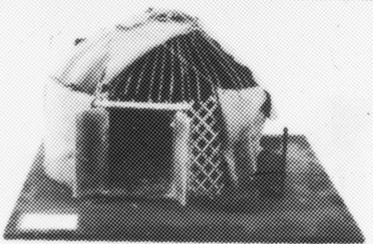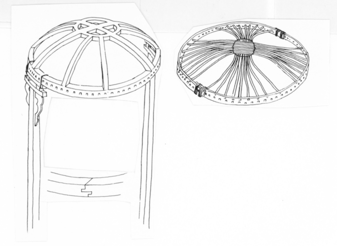 "Modellen visar en jurt, se också modell 8. Träringen i taket, fungerar som en tryckning som håller ut takkäpparna. Denna ring ser olika ut hos olika nomadstammar. Den turkiska typen, som finns i flera varianter, består av böjda och hopknutna träribbor, som spänns ut av korslagda vidjor (modell 8).Denna modell visar den mongoliska typen, som är hopfogad av snidade trästycken. Ofta är dessa "kronor" målade i invecklade mönster."