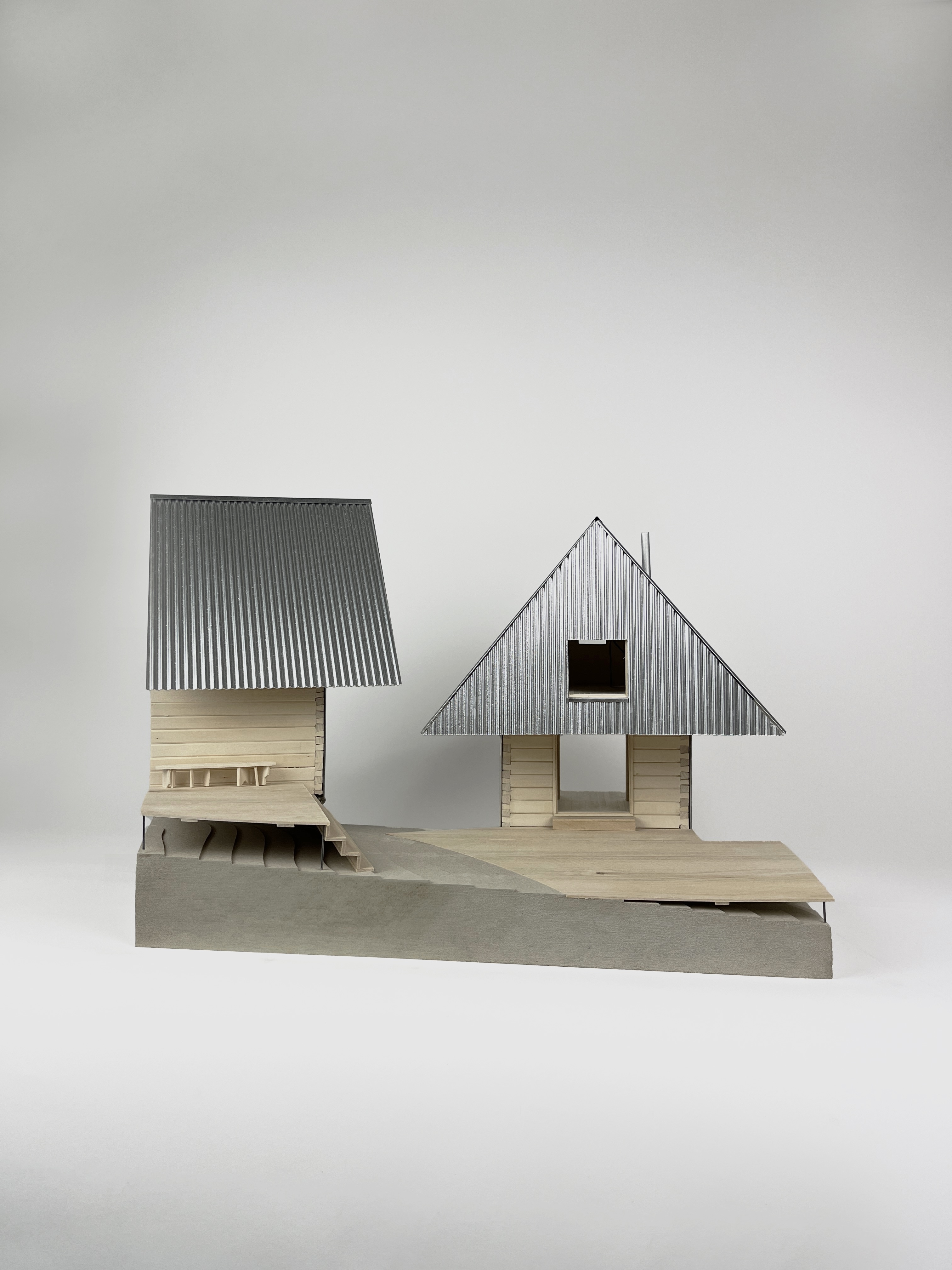 Landskap av grå papp. Hus timrade med laxknut och vissa insidor klädd i flygplansplywood. Fasad av formad och färgad PET