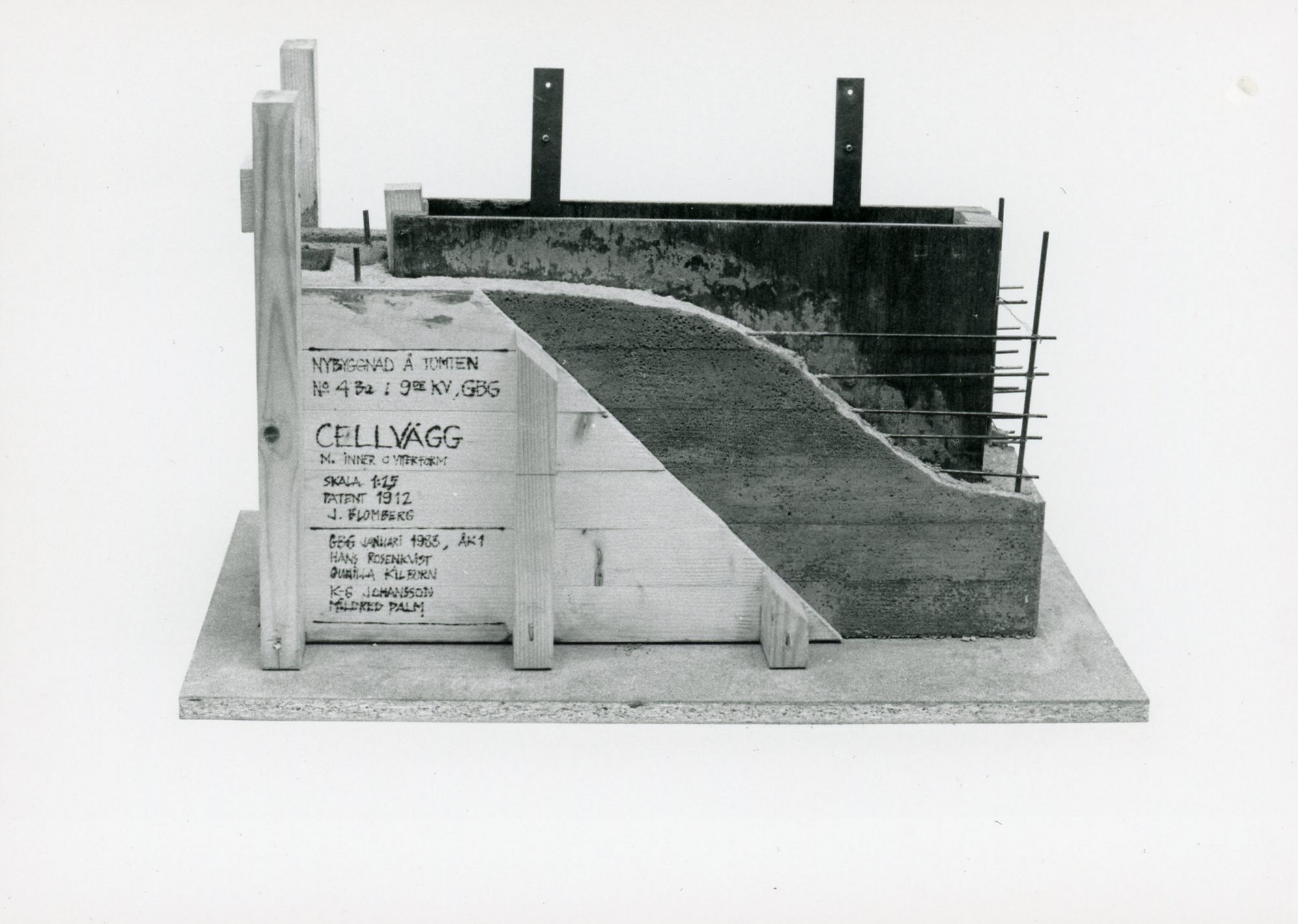 "Effektivsystemet patenterades 1912 och innebar att husen göts av skalmurar av betong med isolerande hålrum mellan skalen. Detta möjliggjordes genom en särskild glidform som efter det att betongen härdat kunde tryckas samman i hålrummet och lyftas ur muren. I kontorshuset "4:an" utfördes ytterväggarna med dubbla hålrum och innerväggarna med enkla. Modellen visar en detalj av kontorshuset vid Skeppsbron i Göteborg."