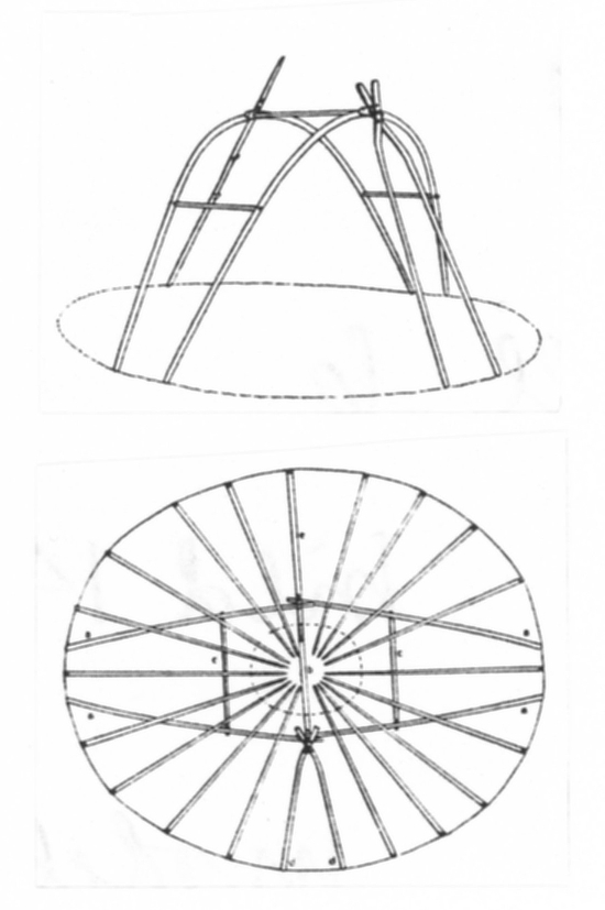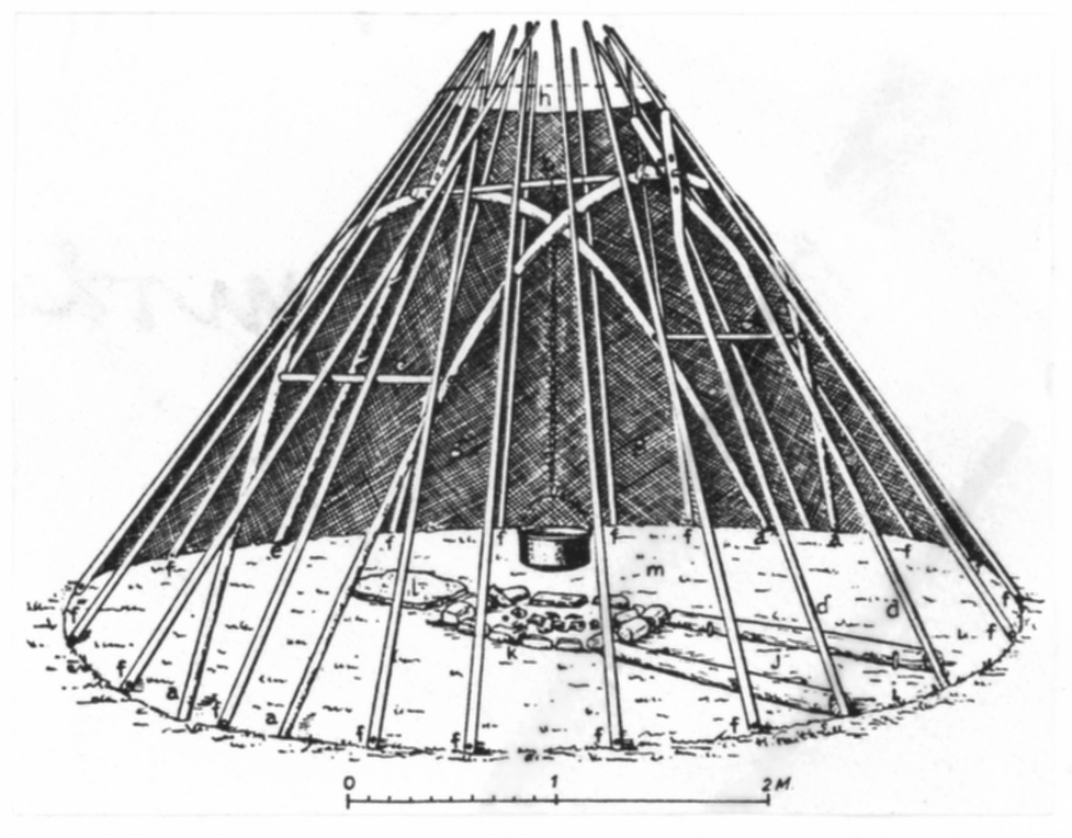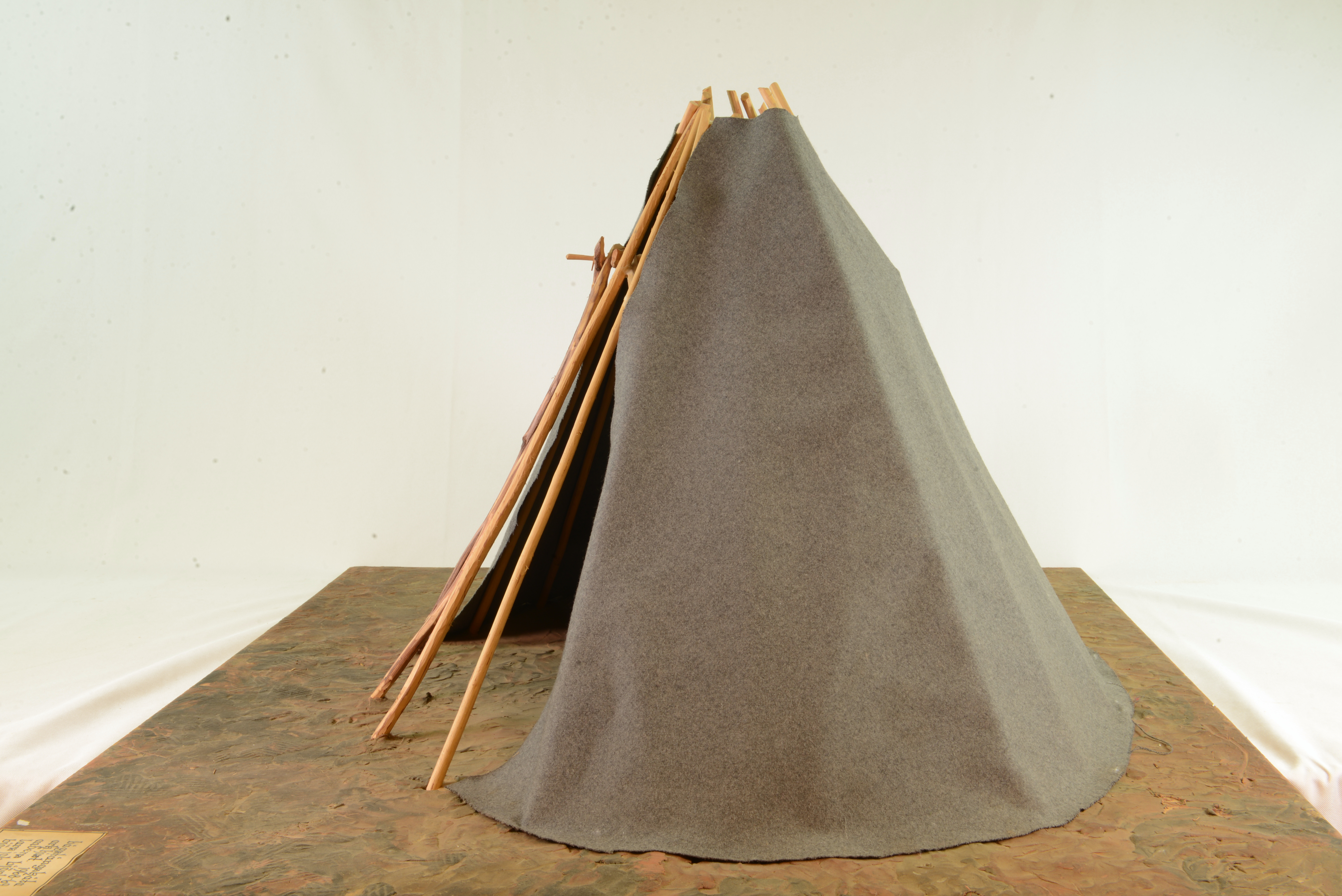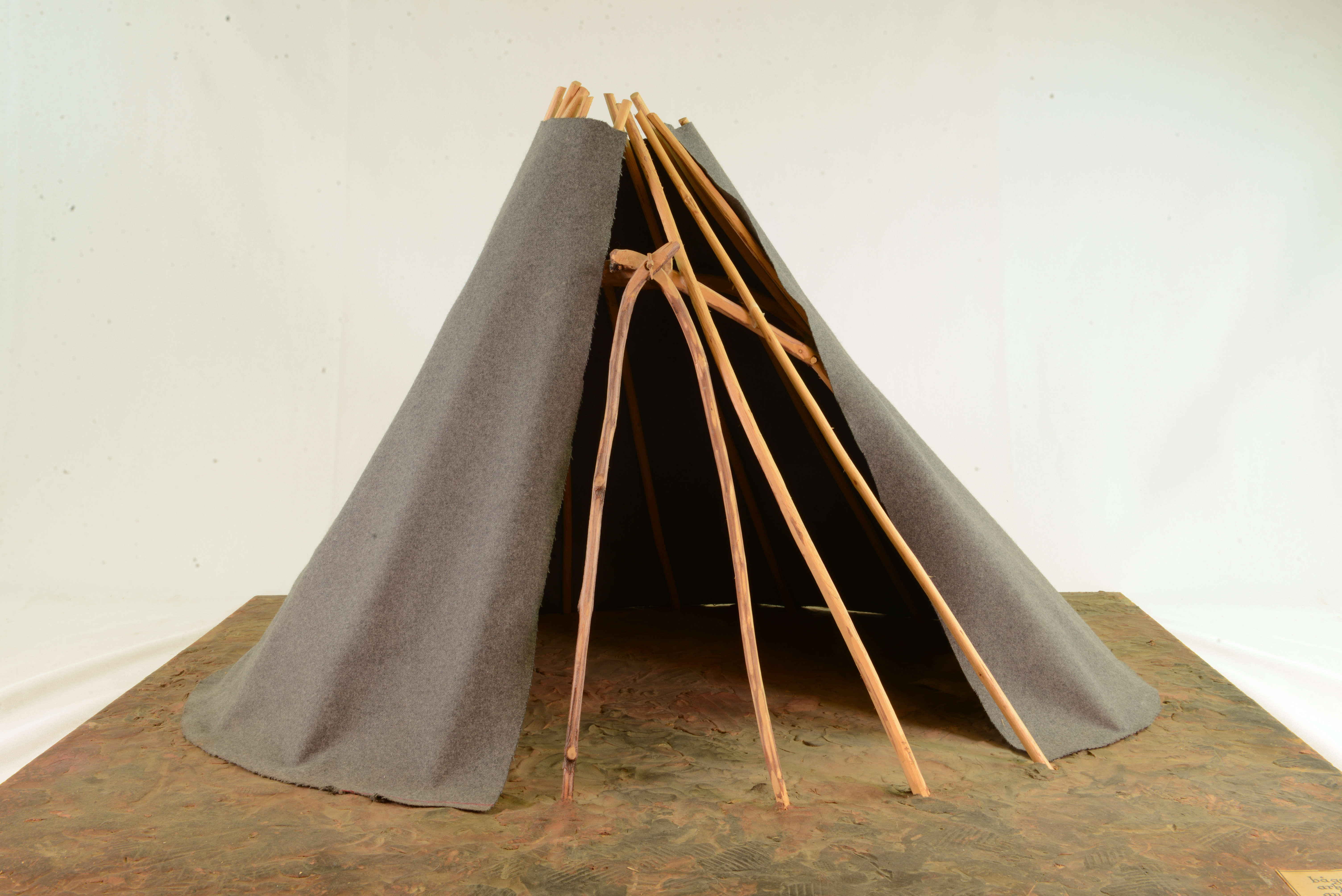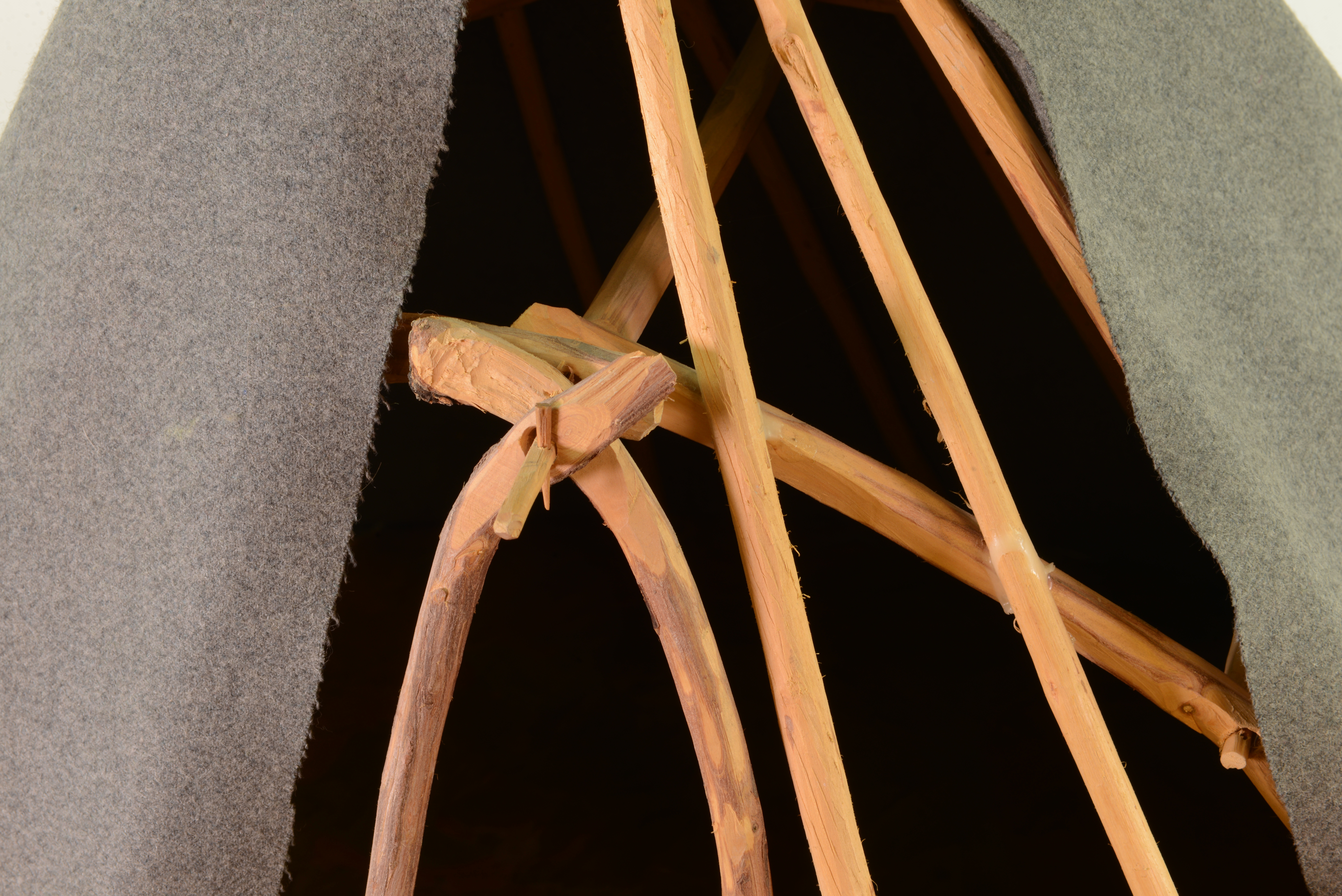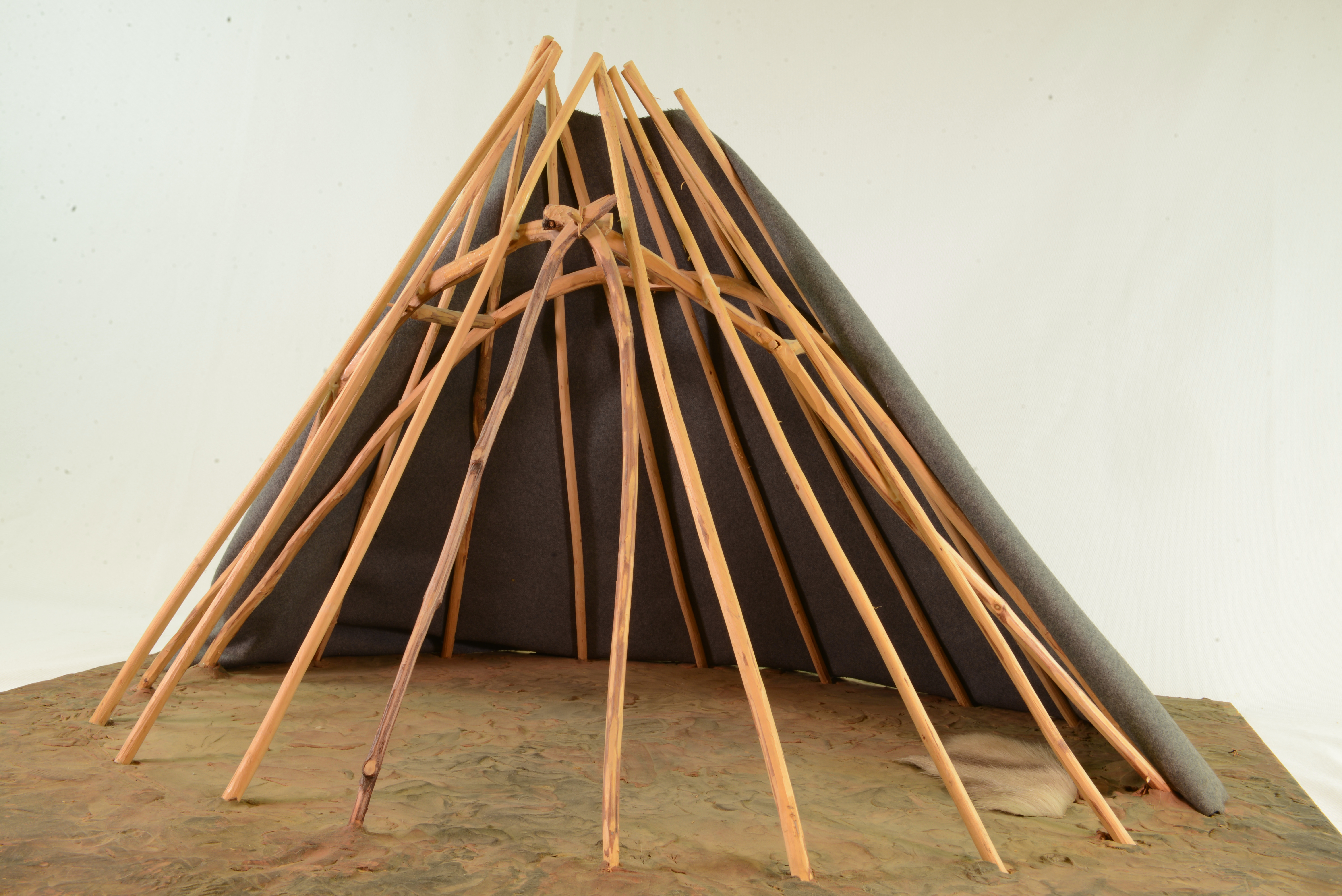 Modellen visar en flyttbar tältkåta av bågstångskontruktion, vilken varit den förhärskande bland renskötande samer i kalfjällsområdet i Norden. Stommen av fjällbjörk består av två par krökta stänger, som hålls isär av åsstång och tvärslåar och stöttas av dörrstänger och en bakre stödstång. Stängerna kopplas ihop genom hål och är smäckra och lätta att transportera. Stommen är ställbar i olika lägen med hänsyn till den ojämna terrängen. Mot skelettet vilar störar, som tältduken av vadmal är svept omkring. Kåtan är rymlig och fast i konstruktionen. Bågstångskonstruktionen är sedan mycket länge använd i torvkåtor. Se också modell 64.