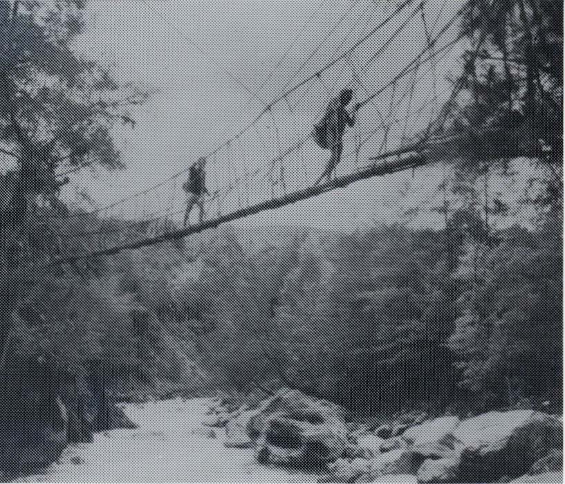 Modellen visar den 47 m långa rottingbron vid den forna byn Moe, som den såg ut när Walter Kaudern färdades förbi på 1910-talet. Bron hänger ca 12 m över den forsande Korofloden och är fäst vid stränderna i träd samt i en ram av stänger. Gångbanan, som endast är handsbred, består av 6-10 rottingar, som är sammanbundna med rottingvidjor. Med gångbanan är ledstänger i rotting förbundna. Den första rottingen lär ha simmats över vid lågvatten och i skydd av en buffel. Bron har burit upp till 13 personer med packning. Se också modell 45.