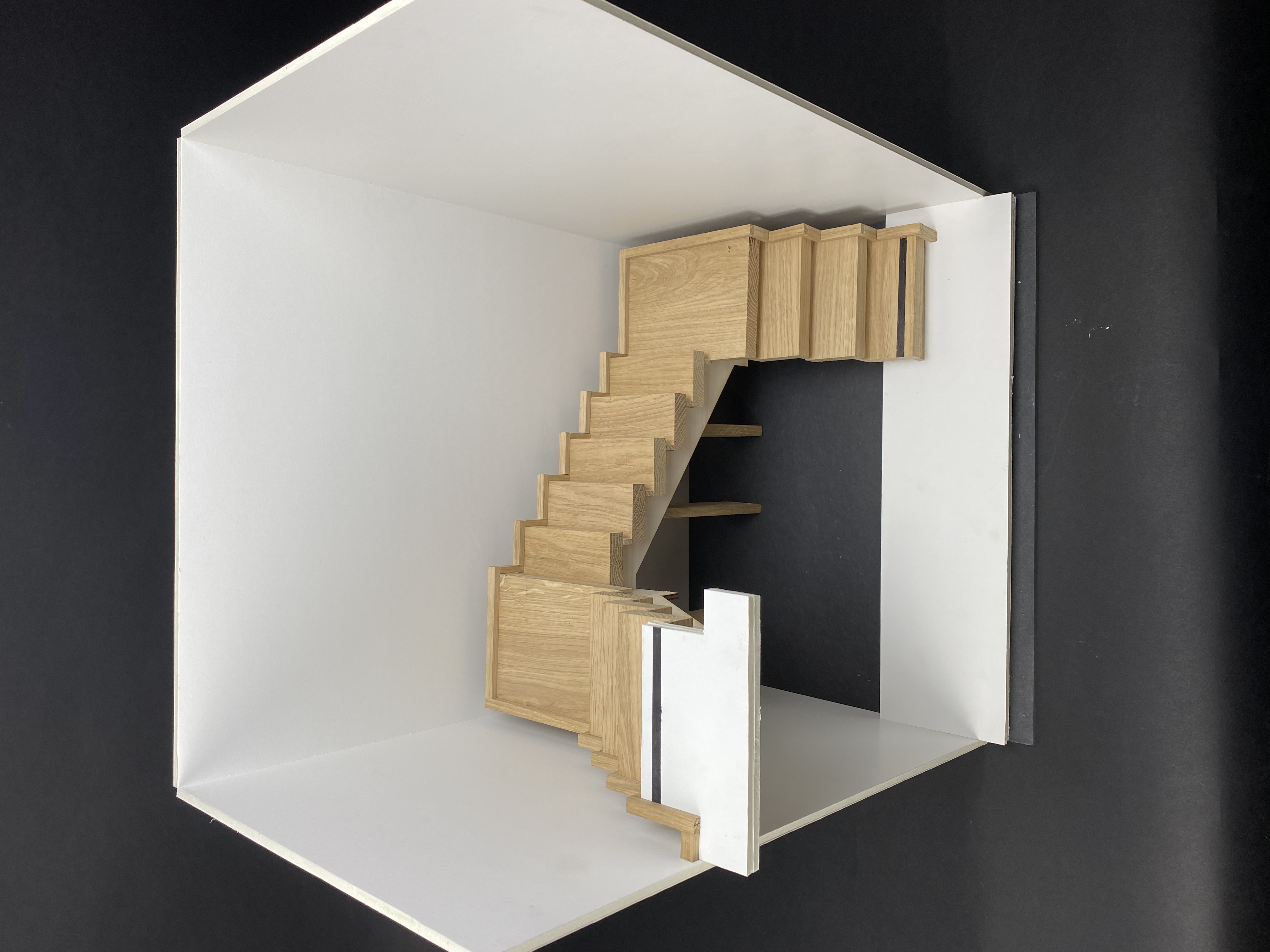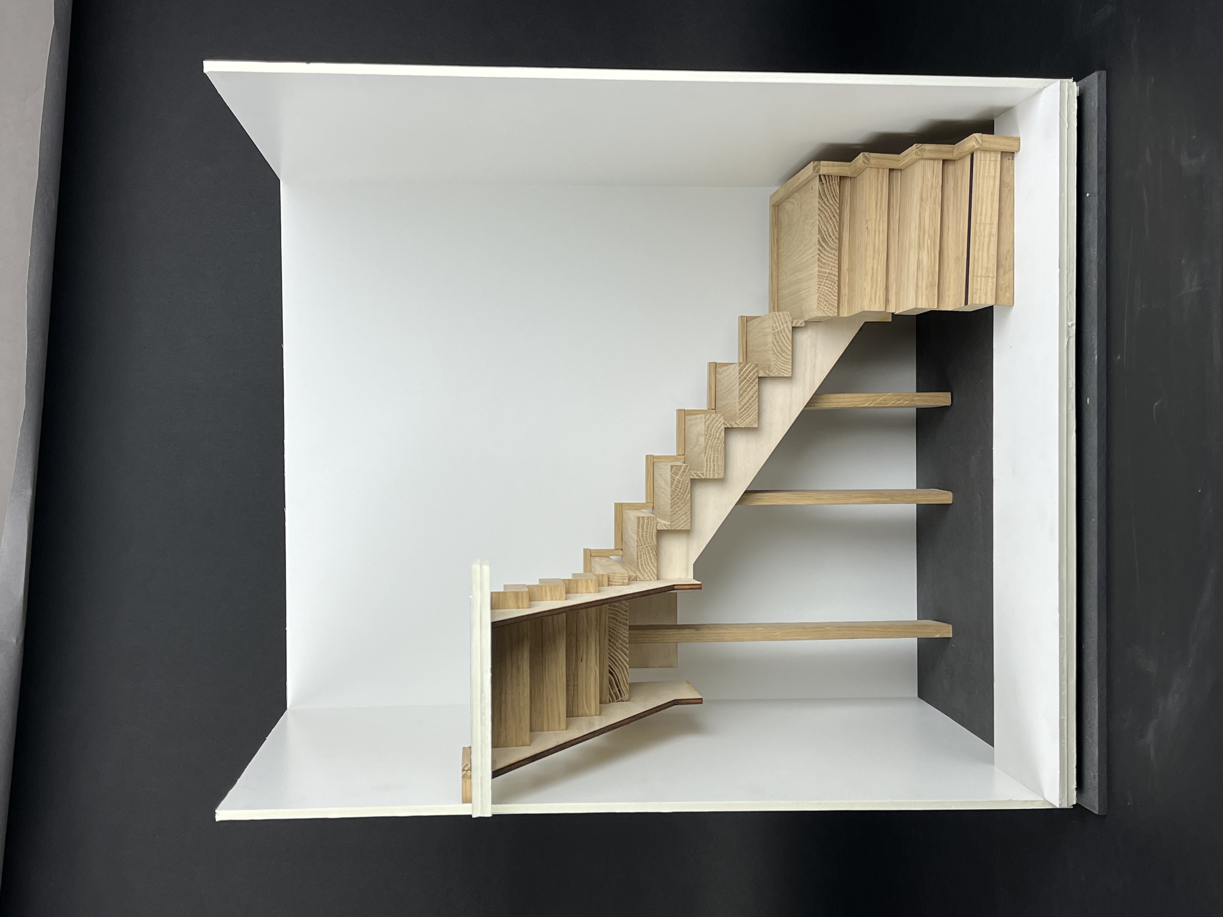 Modellen vill betona trappans tyngd - både genom modelltrappans färger och material.